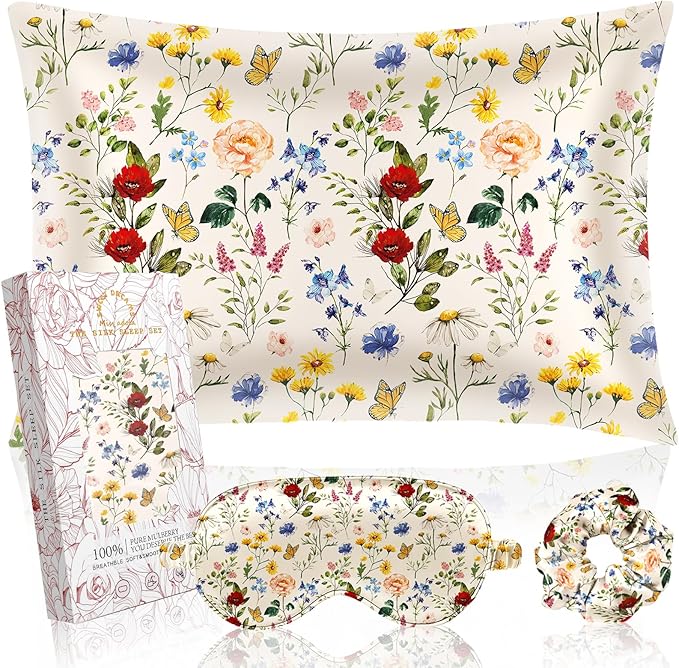 1Pack Mulberry Silk Pillow Case for Hair and Skin Standard 26"x20" Silk Pillowcase with Eye Mask & Scrunchie Soft Silk Pillowcase Sleeping for Women, Wife, Female - Flower Floral