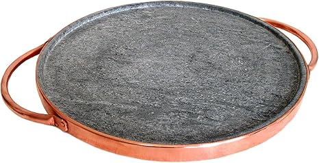 12" soapstone pizza pan with copper handles | Handcrafted from a slab of pure soapstone | Unique, durable and eco-friendly | Non-toxic and Non-stick