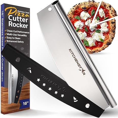 16" Pizza Cutter Rocker Blade by KitchenStar - Sharp Stainless Steel Slicer Knife w Protective Cover, Dishwasher Safe Pizza Oven Accessories, Silver