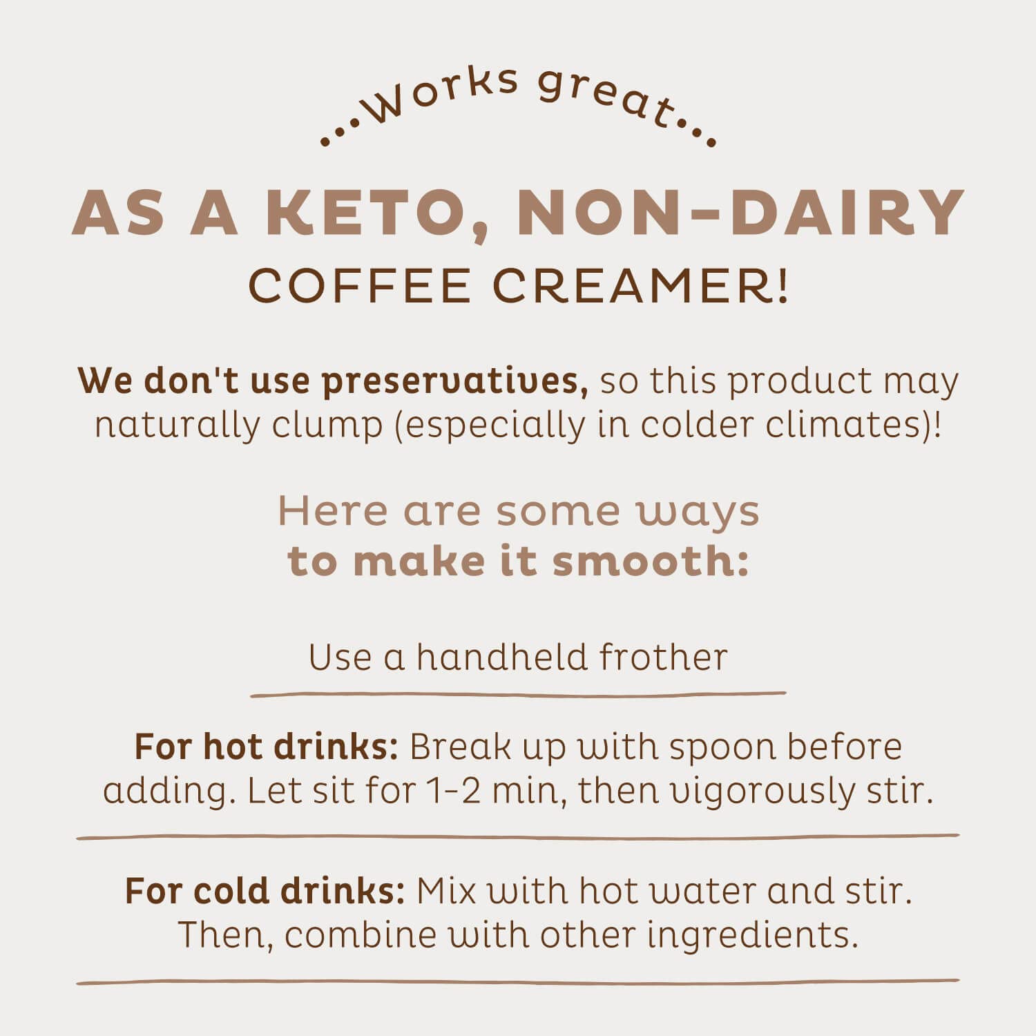 • No Preservatives or Additives: There's only one ingredient in here: pure organic coconut milk powder. We do not add in thickeners or binders, so this may naturally clump, especially in colder climates. Use a spoon or handheld frother to blend it up!
