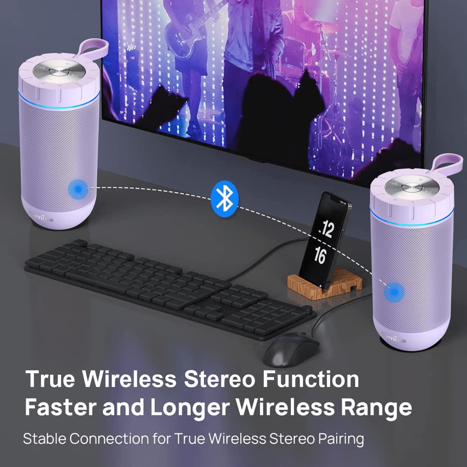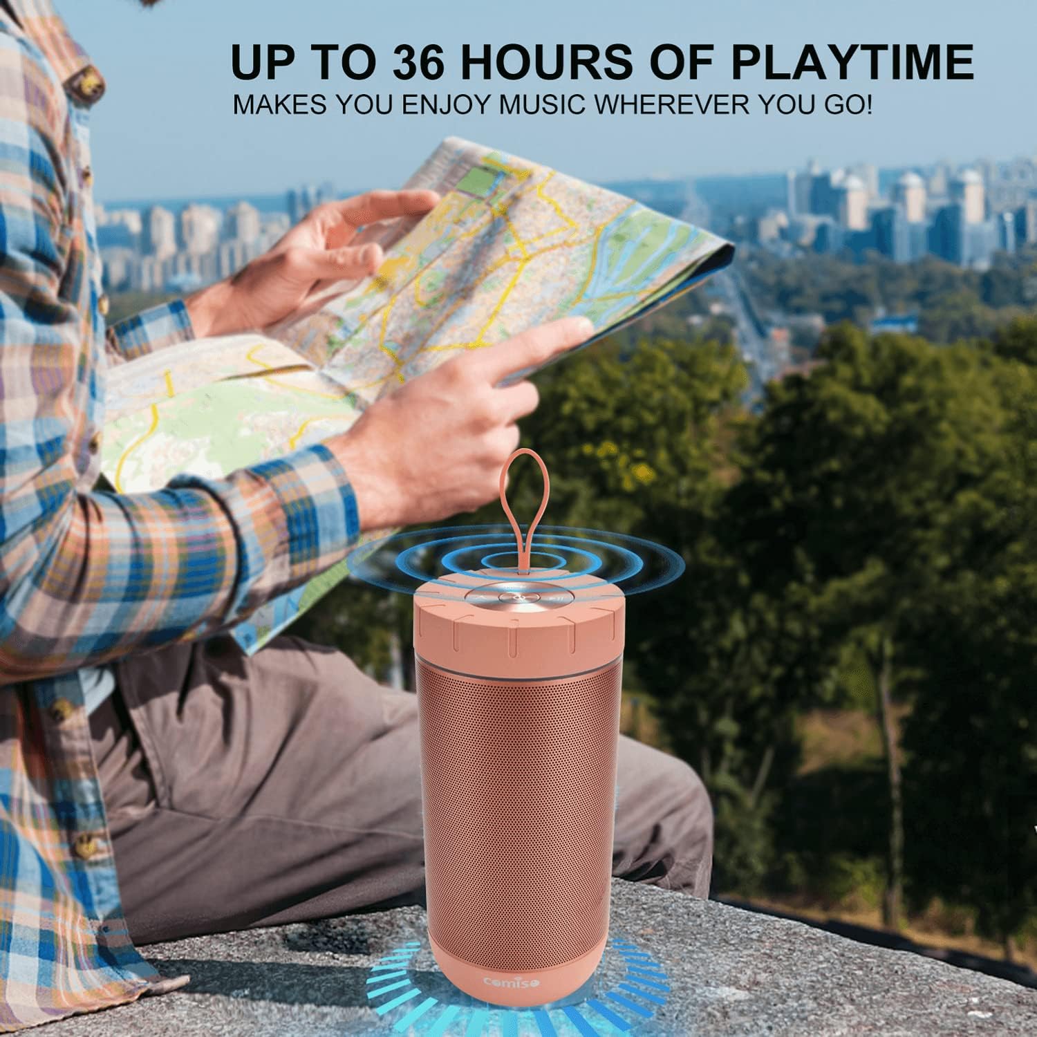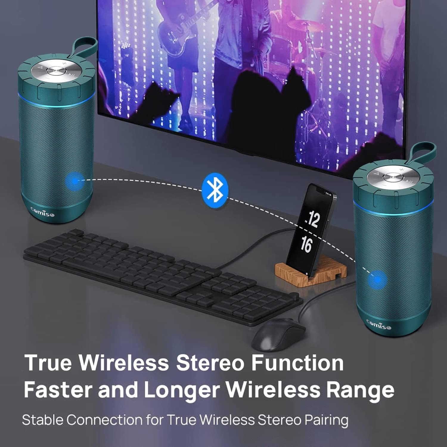 • [True Wireless Stereo Function]: Thanks to True Wireless Stereo function, pair any two COMISO X26L speakers, you can achieve true wireless Bluetooth playing for left and right channels separated of two X26L waterproof blutooth speakers. Just control the True Wireless Stereo master device, then audio can be played in sync on both devices with double enhanced stereo sound