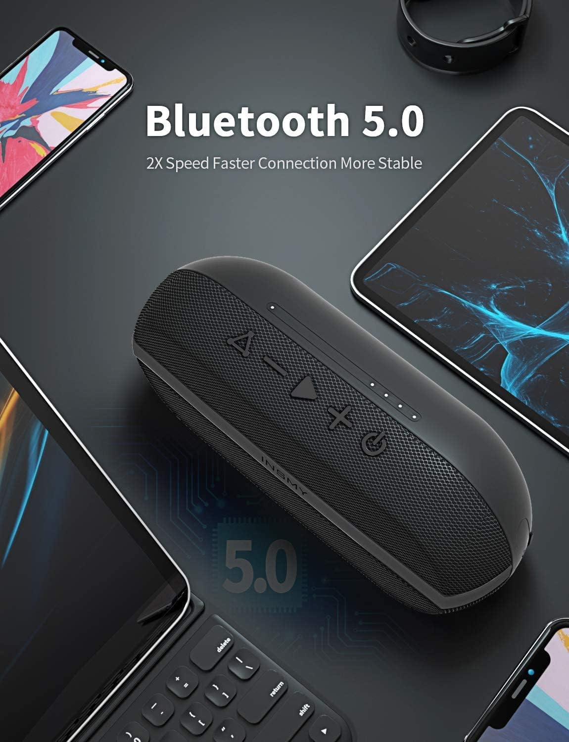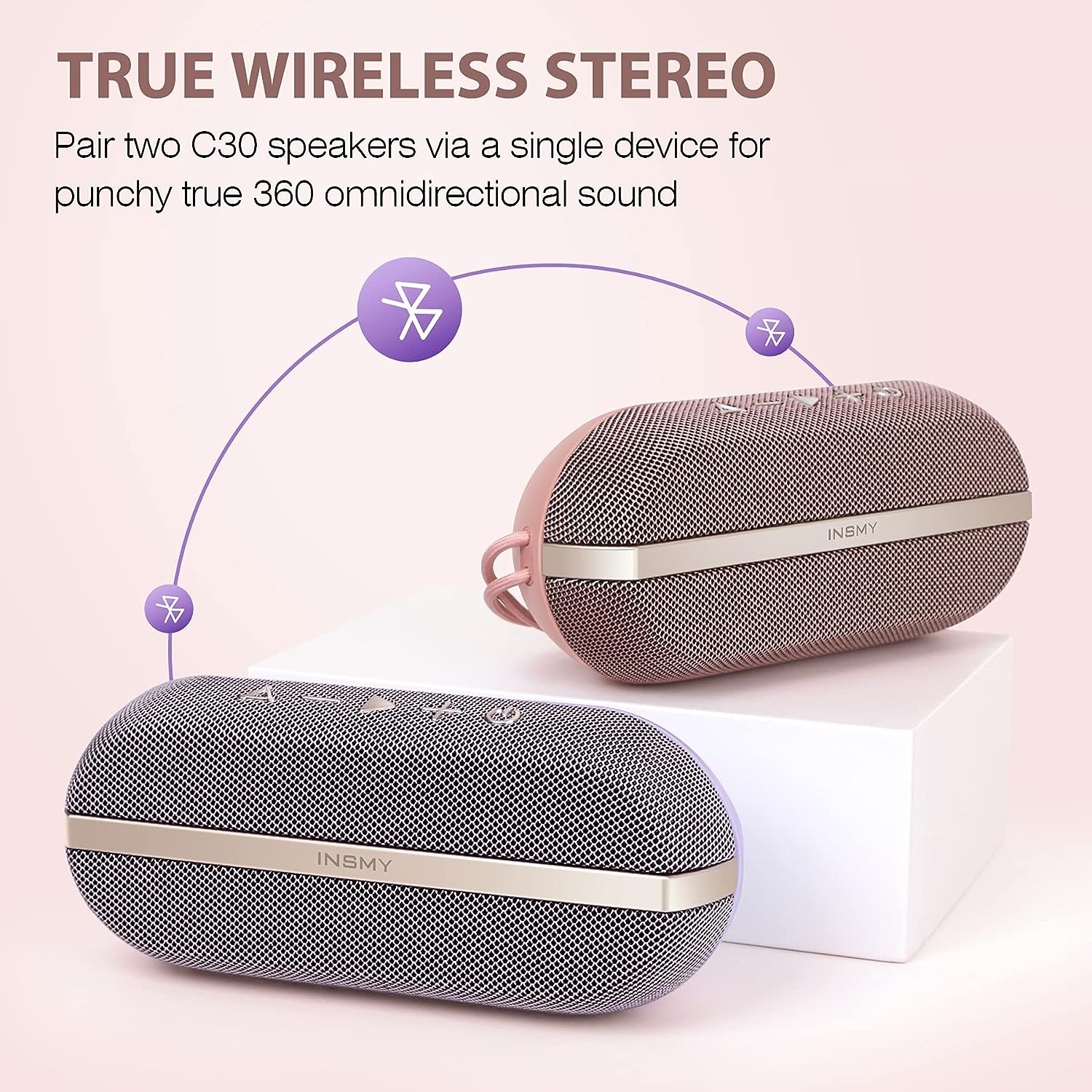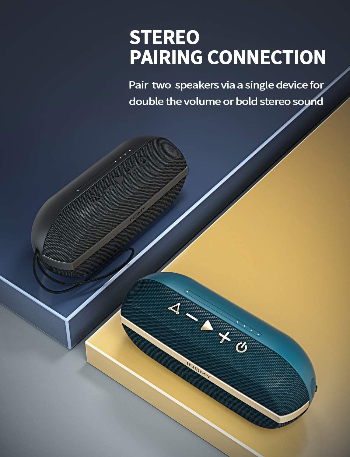 • [True Wireless Stereo Technology, Put It in Stereo] INSMY portable speaker was built with Stereo Pairing mode means you can connect two C30 speakers within seconds together for dedicated with 360-degree stereo HD sound and even more dynamic sound experience.
