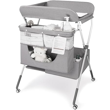 Changing Table, Portable Baby Changing Table with Adjustable Height - Foldable Changing Station with Nappy Mats, Baby Pots, Locking Wheels, Safety Belt & Large Storage, Ideal for Newborn and Infants
