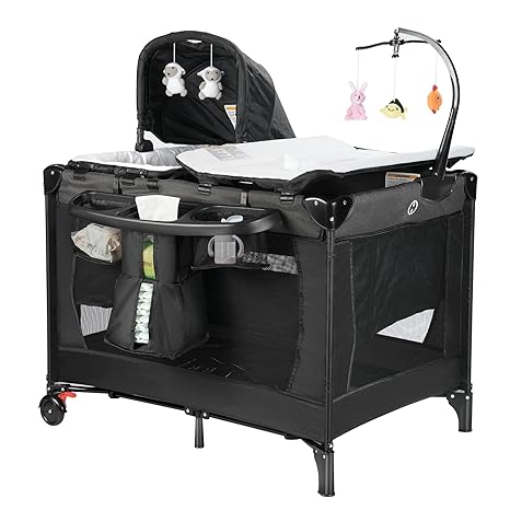 4 in-1 Pack and Play with Bassinet, Baby Crib Deluxe Nursery Center, Large Changing Table, Baby Playard with Foldable Mattress, Portable Travel Playard with Bassinet for Newborn, Infant, Toddler
