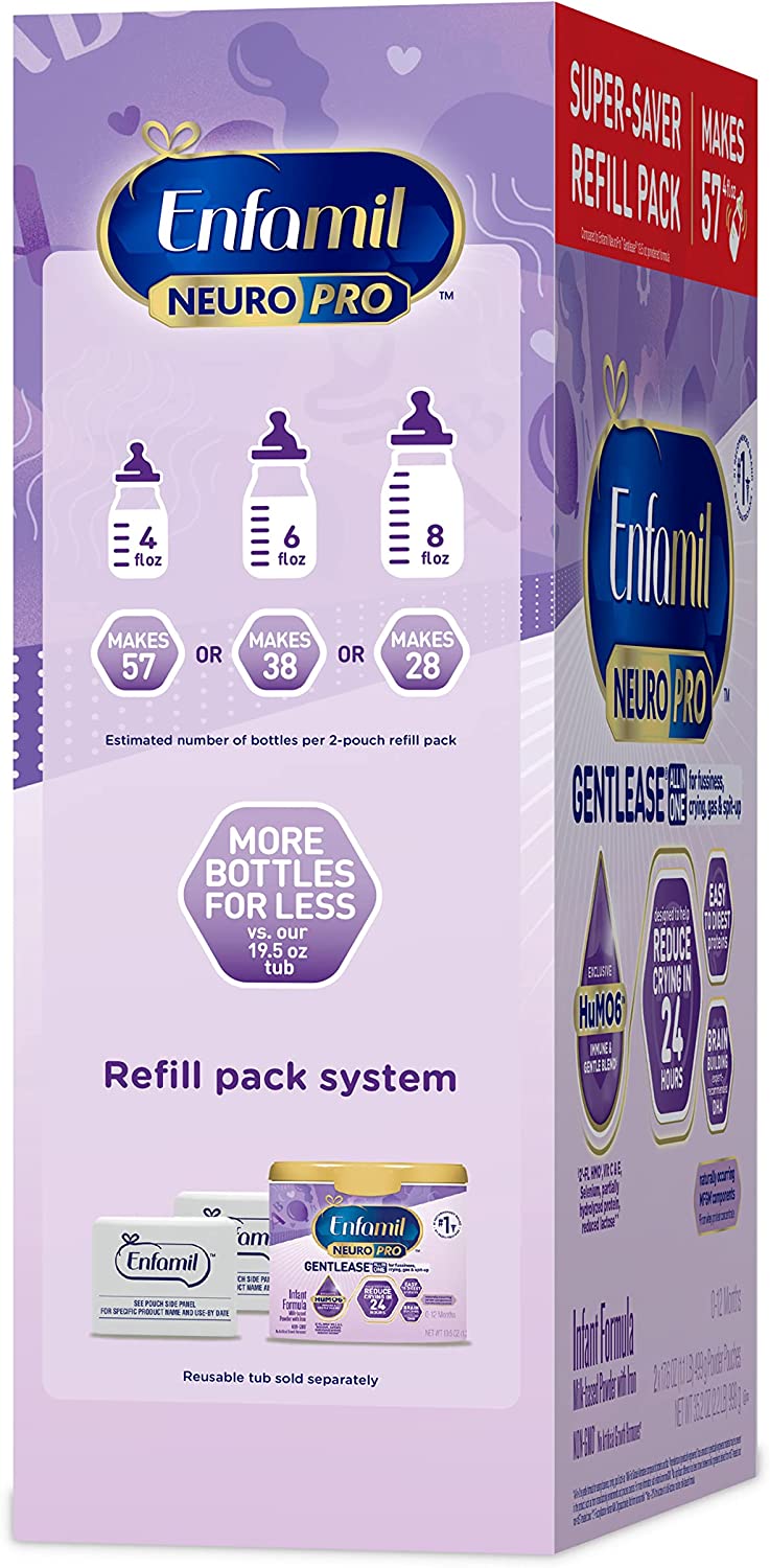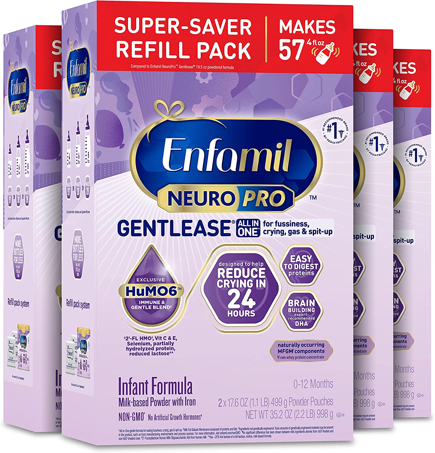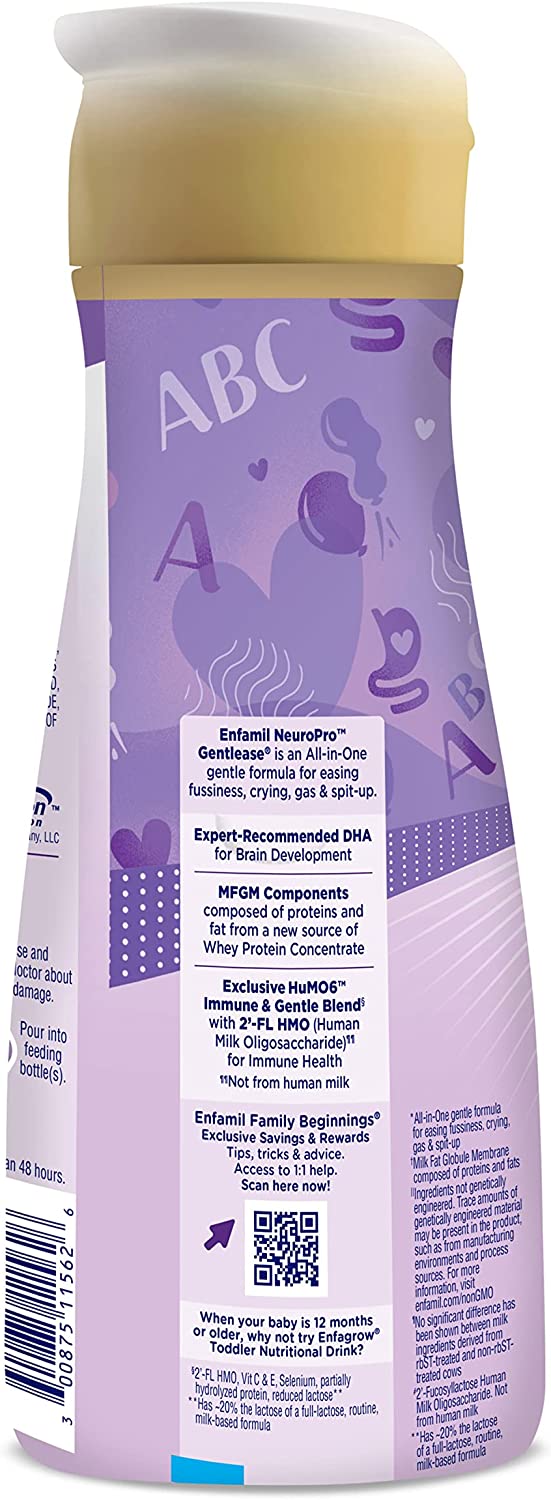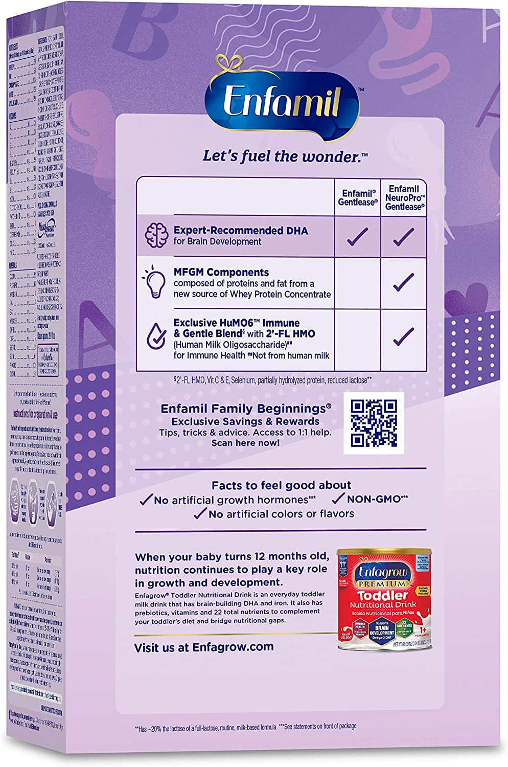 Introducing Enfamil NeuroPro Gentlease. Our trusted Gentlease formula, clinically proven to reduce fussiness, gas and crying within 24 hours, now has MFGM that nourishes the brain first. Emerging evidence from a recent clinical study showed MFGM in formula supports cognitive development similar to breast milk. NeuroPro is the only formula that has a fat-protein blend of MFGM & DHA, previously only found in breast milk. So you can get brain-building nutrition inspired by breast milk from the formula brand that's No.1 recommended by Pediatricians. It offers complete nutrition for babies through 12 months, easy-to-digest proteins and vitamins and minerals for immune health. Each packet makes an 4 fl oz bottle, perfect for feedings on the go. As measured by Bayley-III cognitive score at 12 months in a different formula with MFGM added as an ingredient. Enfamil is the No.1 pediatrician recommended brand of Infant Formula - QuintilesIMS, using the ProVoice Survey fielded from October 1, 2016 to September 30, 2017. †In amounts supported by clinical research. Not made with genetically modified ingredients, but trace amounts of genetically engineered materials may be present in the product from manufacturing environments and process sources.