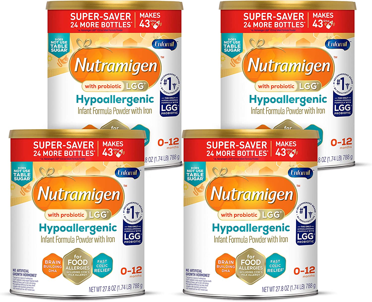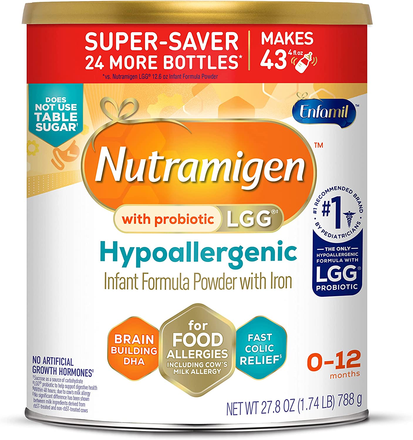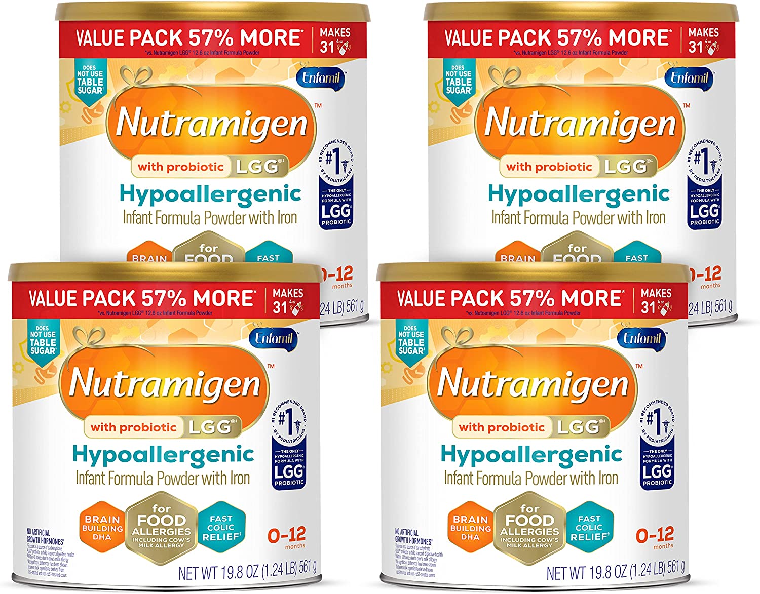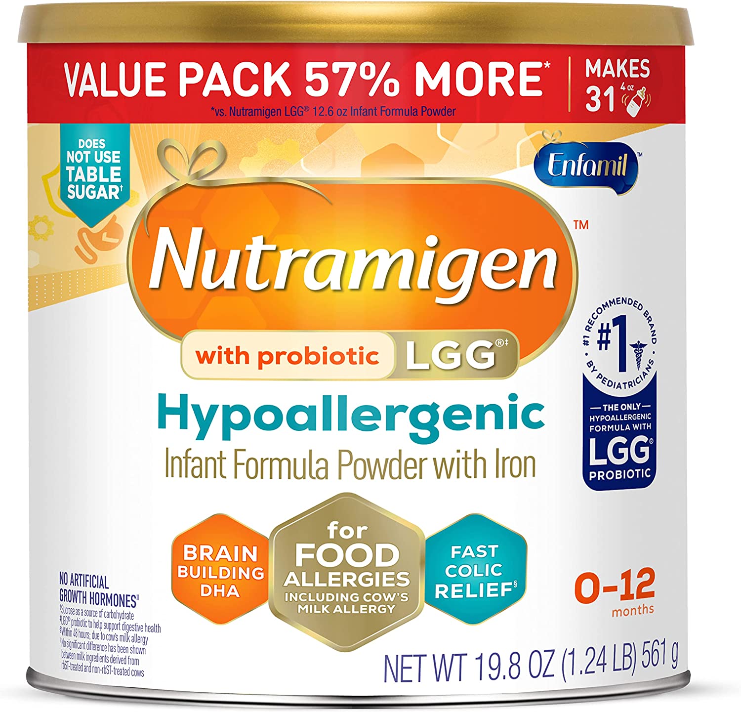 Enfamil Nutramigen Colic Baby Formula with Enflora LGG probiotics is a hypoallergenic formula proven to manage colic fast, often within 48 hours. If your baby has an allergy to the cow's milk protein in infant formula, Nutramigen contains both extensively hydrolyzed protein to provide colic relief and Enflora LGG probiotics to provide immune support to prevent allergies in the future. These two ingredients offer a more comprehensive approach working together to help babies feel better faster. The benefits of these two ingredients include: Hypoallergenic, easy to digest proteins and probiotics, proven to promote skin health in infants through 18 months of age, proven to promote digestive system health within 1 week of use, effectively manages colic in 48 hours, and promotes immune support. Nutramigen with Enflora LGG probiotics is also nutritionally balanced, lactose free, and has no added sucrose. Studied before the addition of DHA, ARA and LGG. Asthma, eczema, rhino-conjunctivitis, and urticaria at three years; in comparison to Nutramigen without LGG. ProVoice Survey fielded from January 1, 2018 to December 31, 2018 and recording recommendations for Extensively Hydrolyzed Infant Formula for cmA Patients.