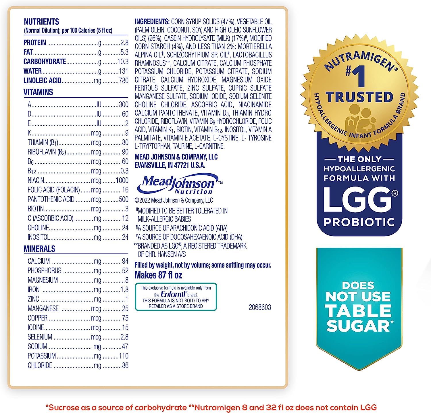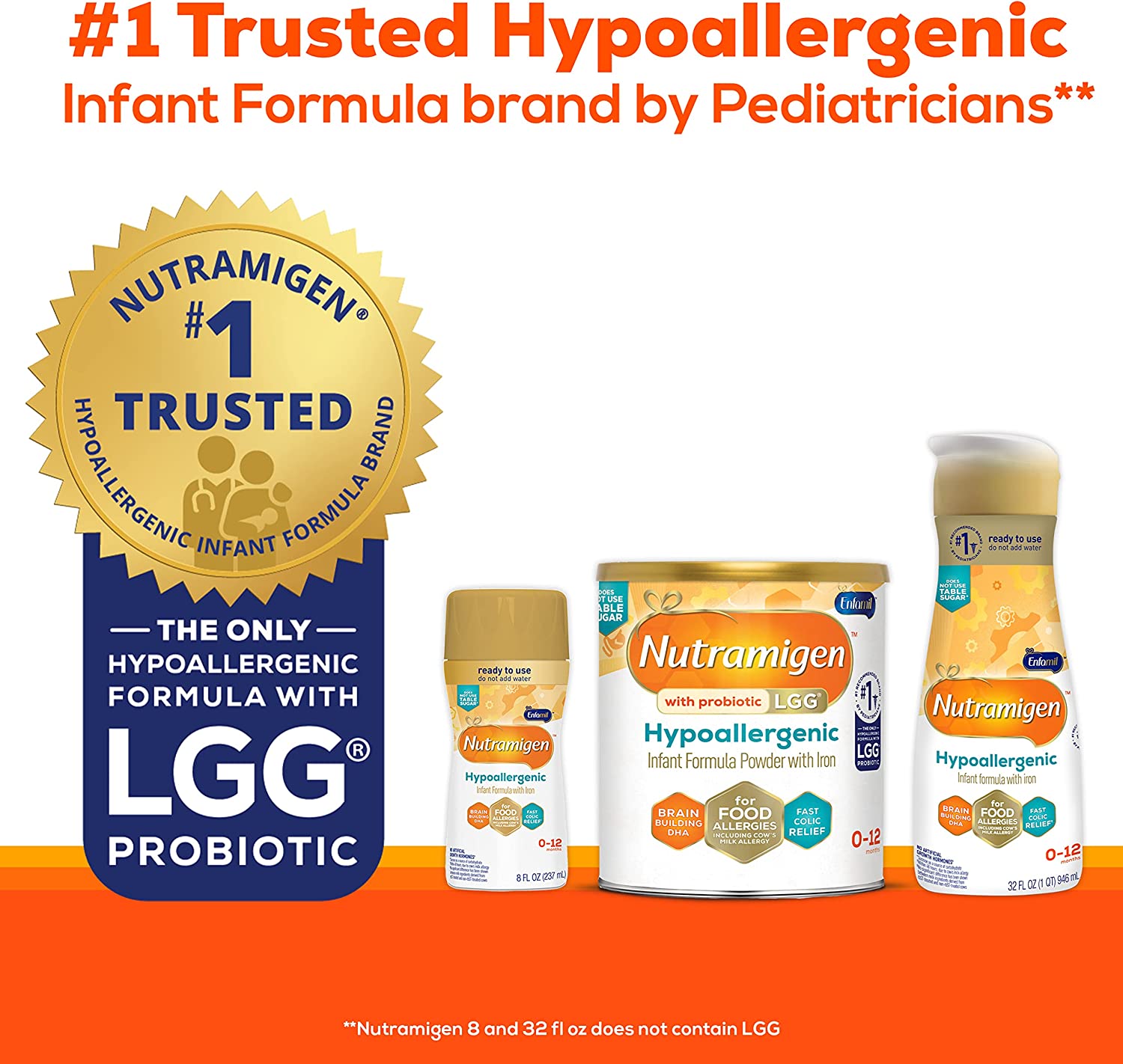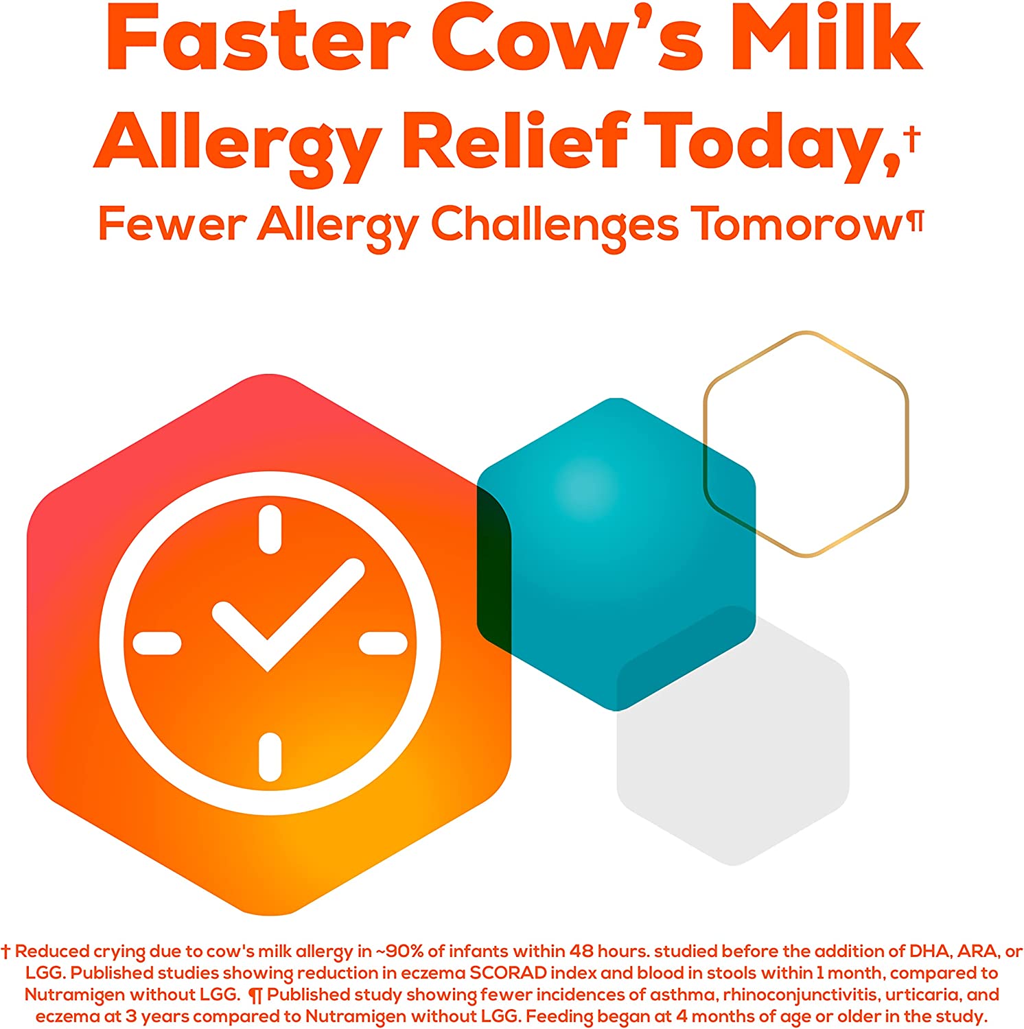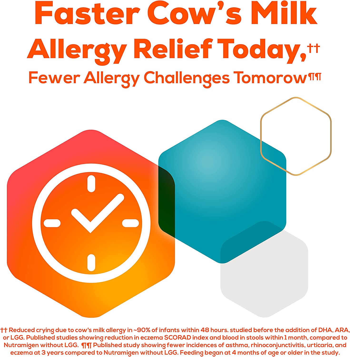 Enfamil Nutramigen Colic Baby Formula with Enflora LGG probiotics is a hypoallergenic formula proven to manage colic fast, often within 48 hours. If your baby has an allergy to the cow's milk protein in infant formula, Nutramigen contains both extensively hydrolyzed protein to provide colic relief and Enflora LGG probiotics to provide immune support to prevent allergies in the future. These two ingredients offer a more comprehensive approach working together to help babies feel better faster. The benefits of these two ingredients include: Hypoallergenic, easy to digest proteins and probiotics, proven to promote skin health in infants through 18 months of age, proven to promote digestive system health within 1 week of use, effectively manages colic in 48 hours, and promotes immune support. Nutramigen with Enflora LGG probiotics is also nutritionally balanced, lactose free, and has no added sucrose. Studied before the addition of DHA, ARA and LGG. Asthma, eczema, rhino-conjunctivitis, and urticaria at three years; in comparison to Nutramigen without LGG. ProVoice Survey fielded from January 1, 2018 to December 31, 2018 and recording recommendations for Extensively Hydrolyzed Infant Formula for cmA Patients.