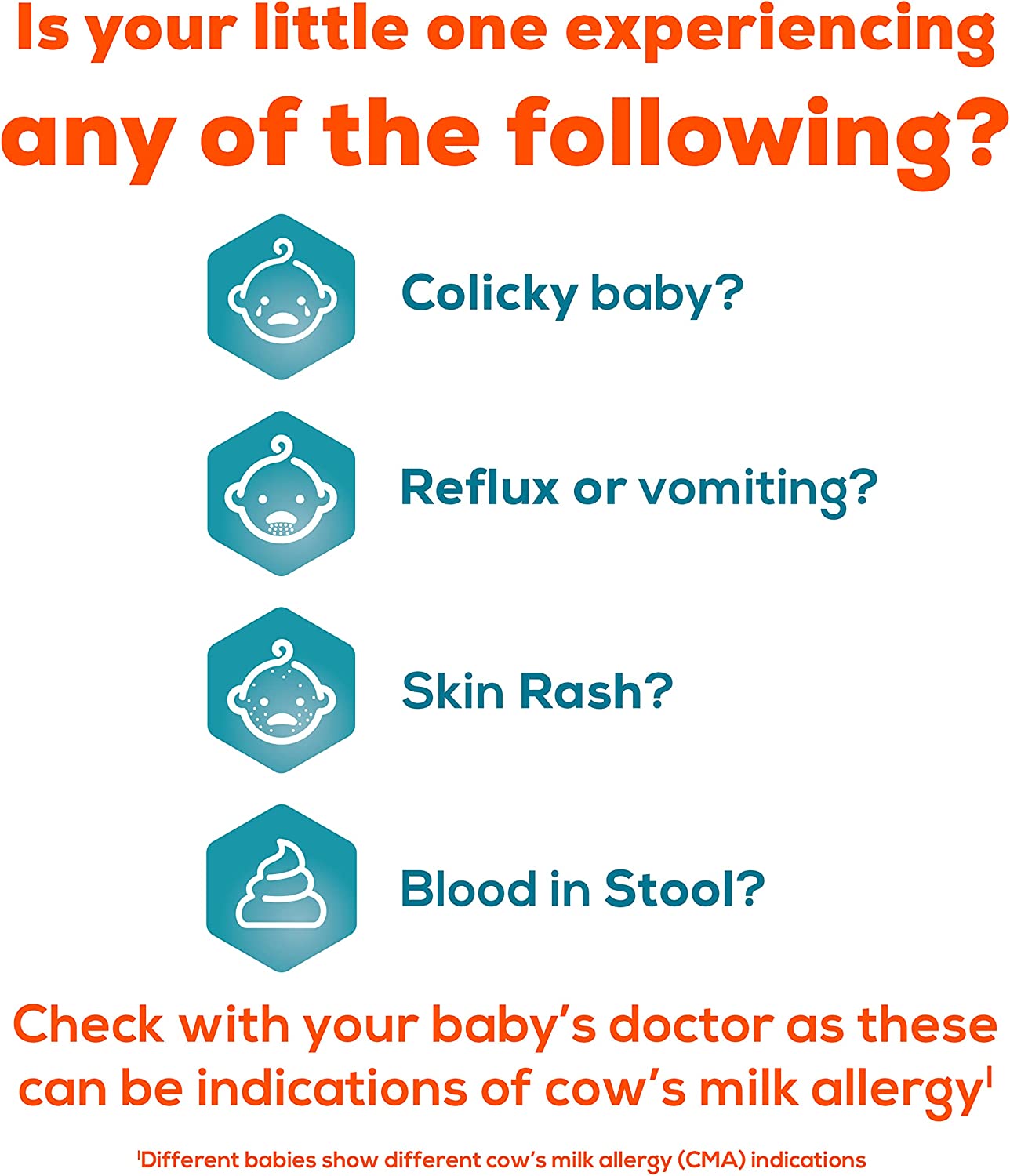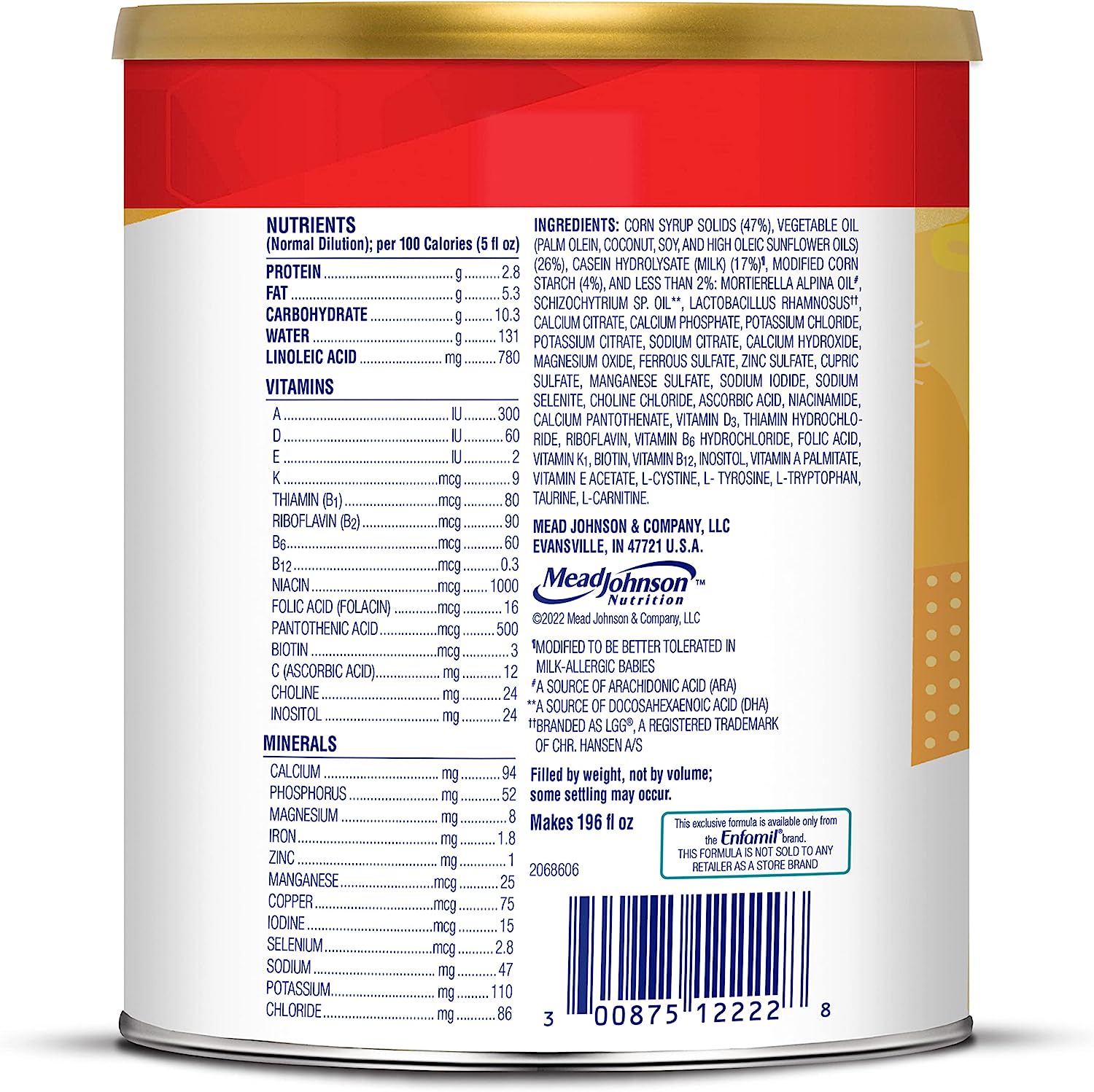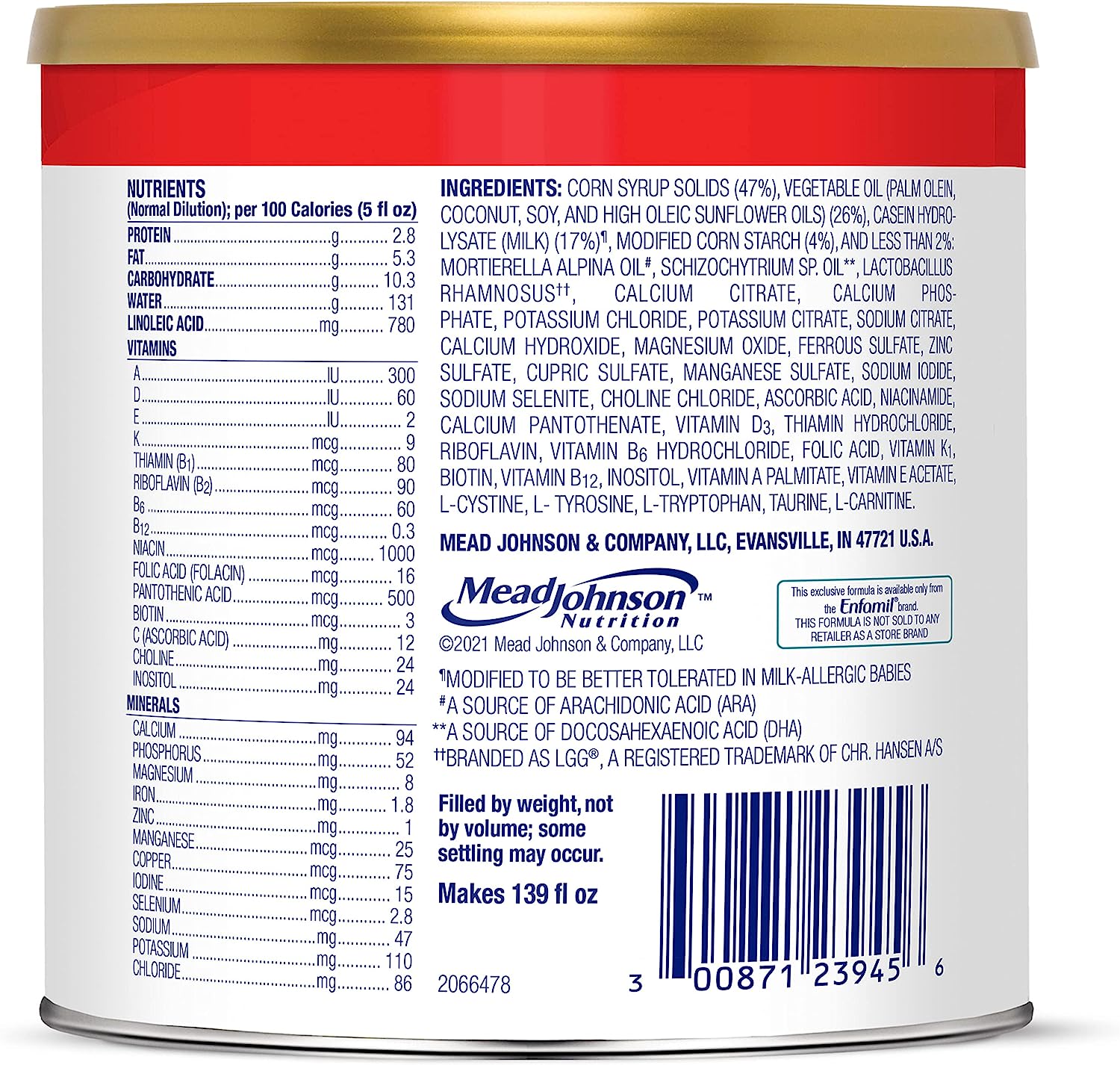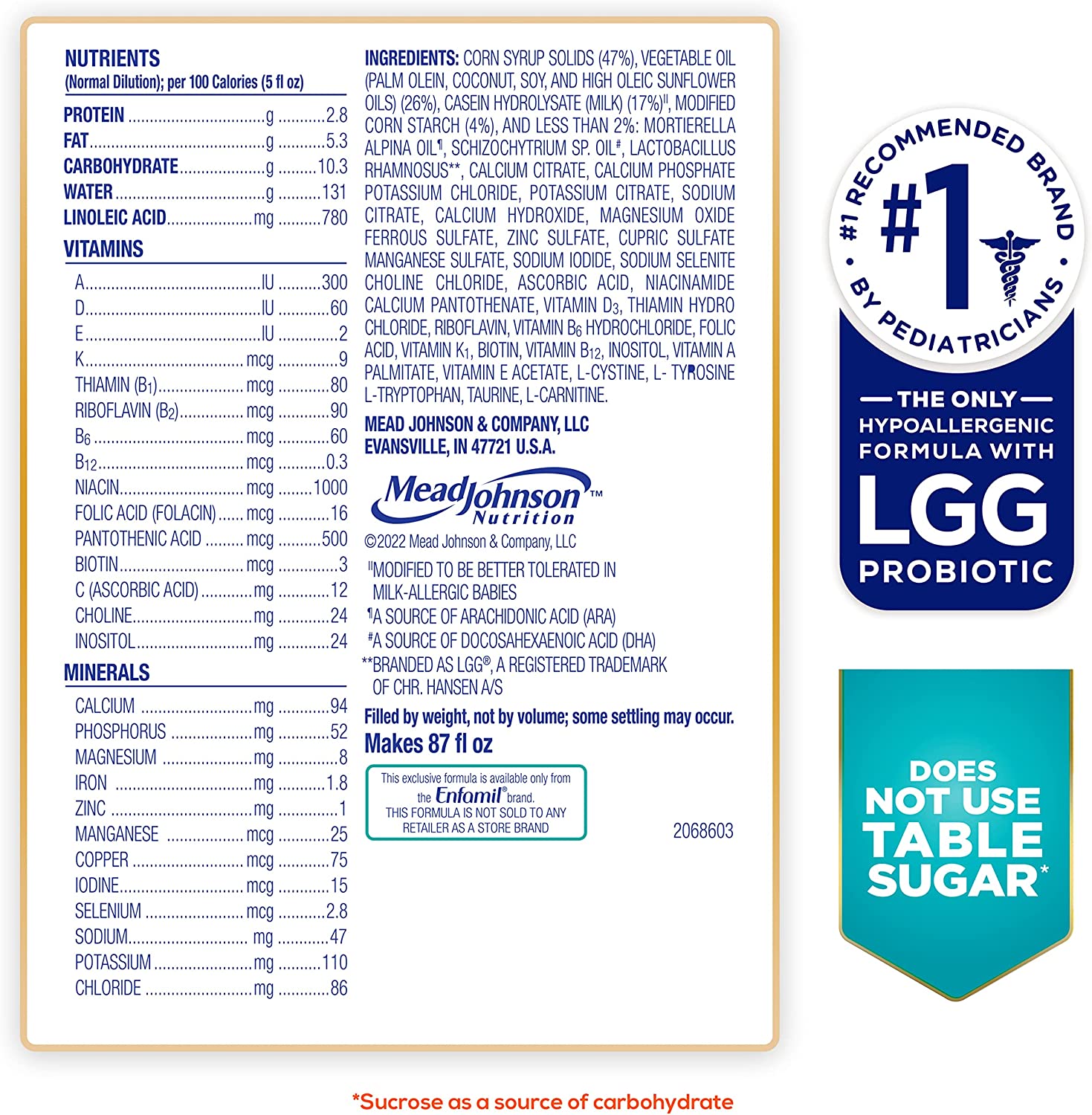 Enfamil Nutramigen Colic Baby Formula with Enflora LGG probiotics is a hypoallergenic formula proven to manage colic fast, often within 48 hours. If your baby has an allergy to the cow's milk protein in infant formula, Nutramigen contains both extensively hydrolyzed protein to provide colic relief and Enflora LGG probiotics to provide immune support to prevent allergies in the future. These two ingredients offer a more comprehensive approach working together to help babies feel better faster. The benefits of these two ingredients include: Hypoallergenic, easy to digest proteins and probiotics, proven to promote skin health in infants through 18 months of age, proven to promote digestive system health within 1 week of use, effectively manages colic in 48 hours, and promotes immune support. Nutramigen with Enflora LGG probiotics is also nutritionally balanced, lactose free, and has no added sucrose. Studied before the addition of DHA, ARA and LGG. Asthma, eczema, rhino-conjunctivitis, and urticaria at three years; in comparison to Nutramigen without LGG. ProVoice Survey fielded from January 1, 2018 to December 31, 2018 and recording recommendations for Extensively Hydrolyzed Infant Formula for cmA Patients.