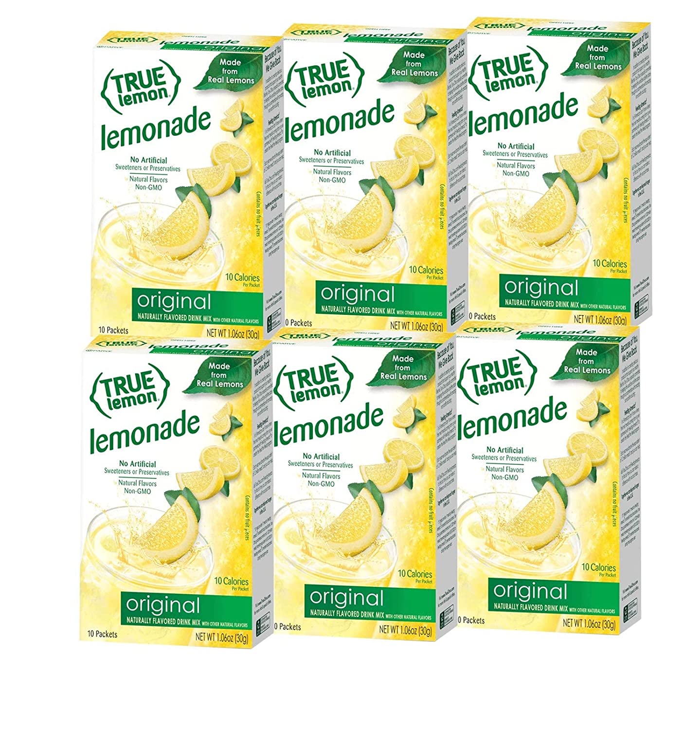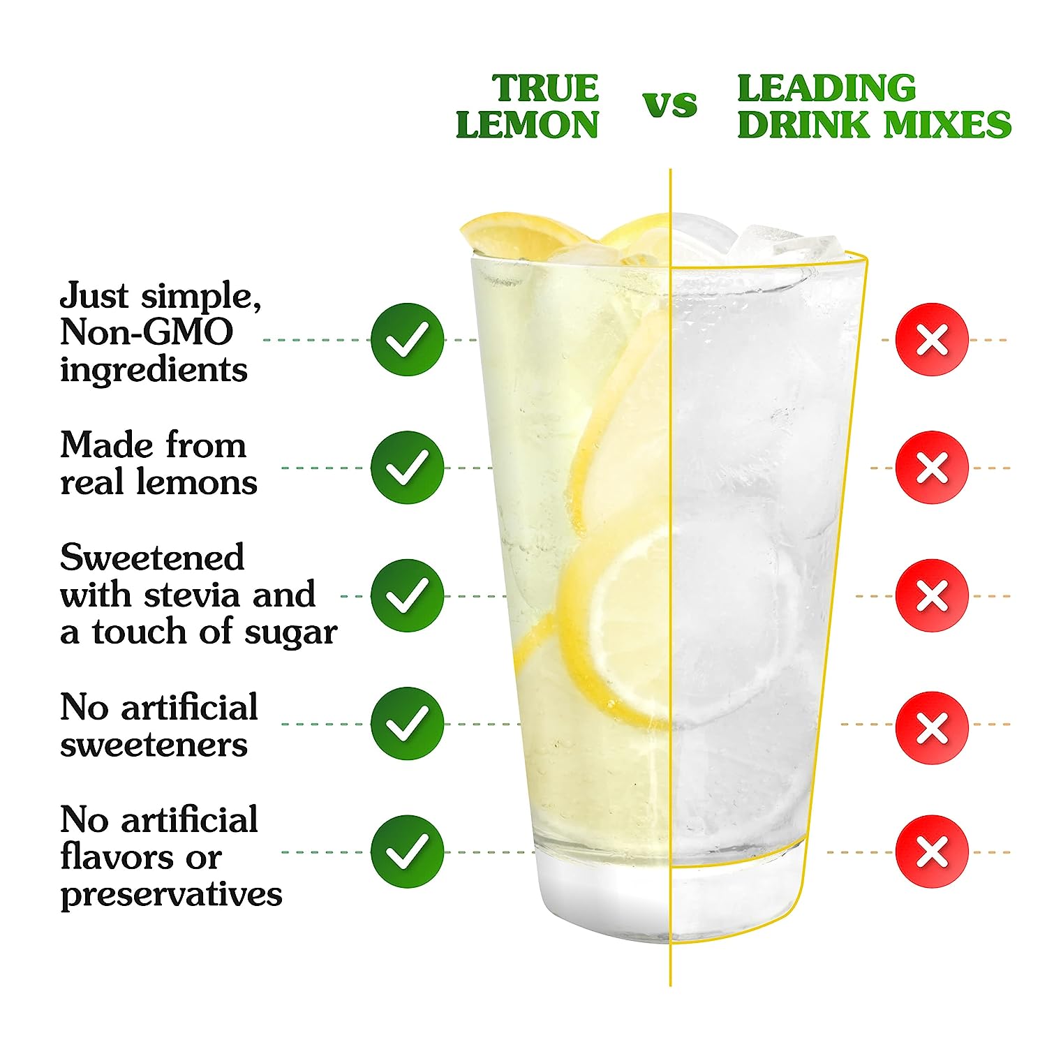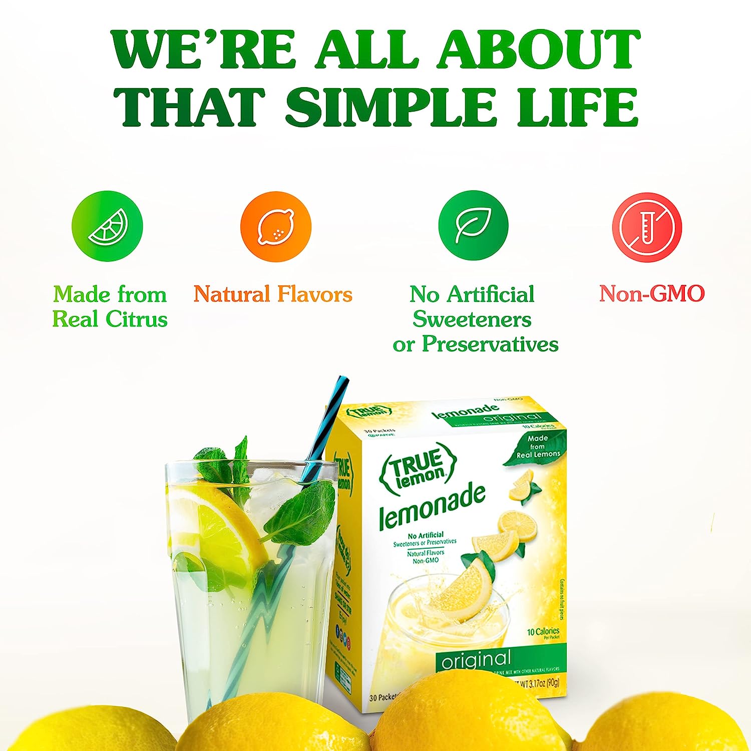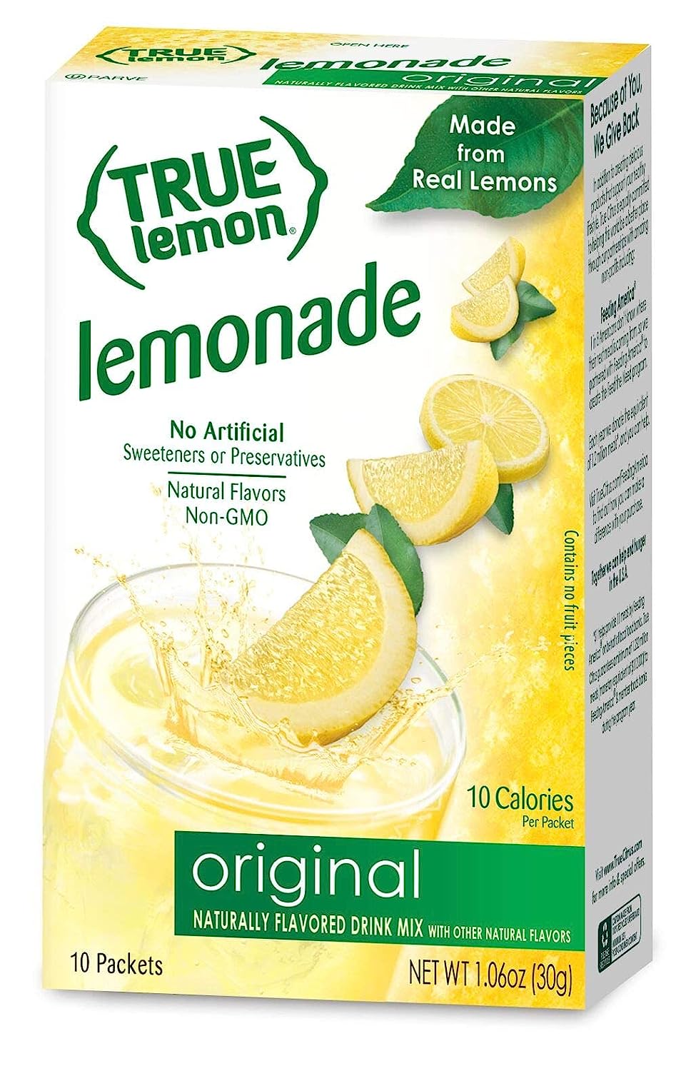 "TRUE LEMON Original Lemonade Drink Mix is made from real lemon juice and oils and naturally sweetened with stevia. Made with simple and clean ingredients that you can pronounce, this award-winning lemonade mix will enhance the flavor of your water so you can drink more of it and help fight dehydration. Our TRUE LEMON Original Lemonade Drink Mix contains only 10 calories per powdered drink mix stick packet (or 5 calories per serving for 2 quart size box). TRUE CITRUS was founded as a way to answer the question: why hasn’t anyone been able to put quality, fresh-squeezed lemon taste into a packet form so it’s convenient for everyone, everywhere? Today, the TRUE CITRUS family includes over 100 delicious and refreshing products. These include our tasty and hydrating low-calorie Drink Mixes and our flavorful salt-free Seasoning Blends."