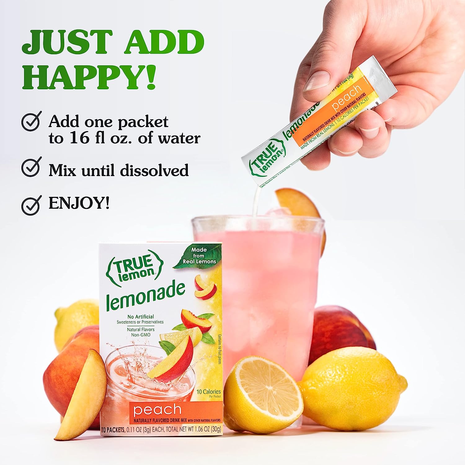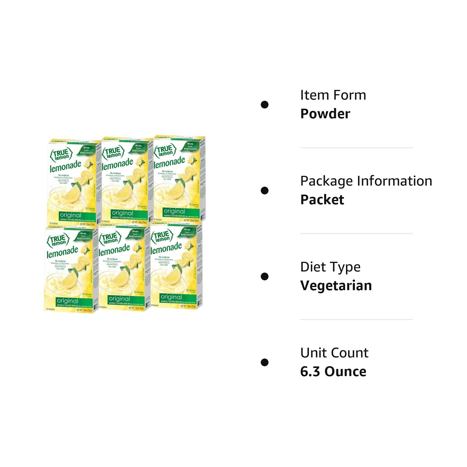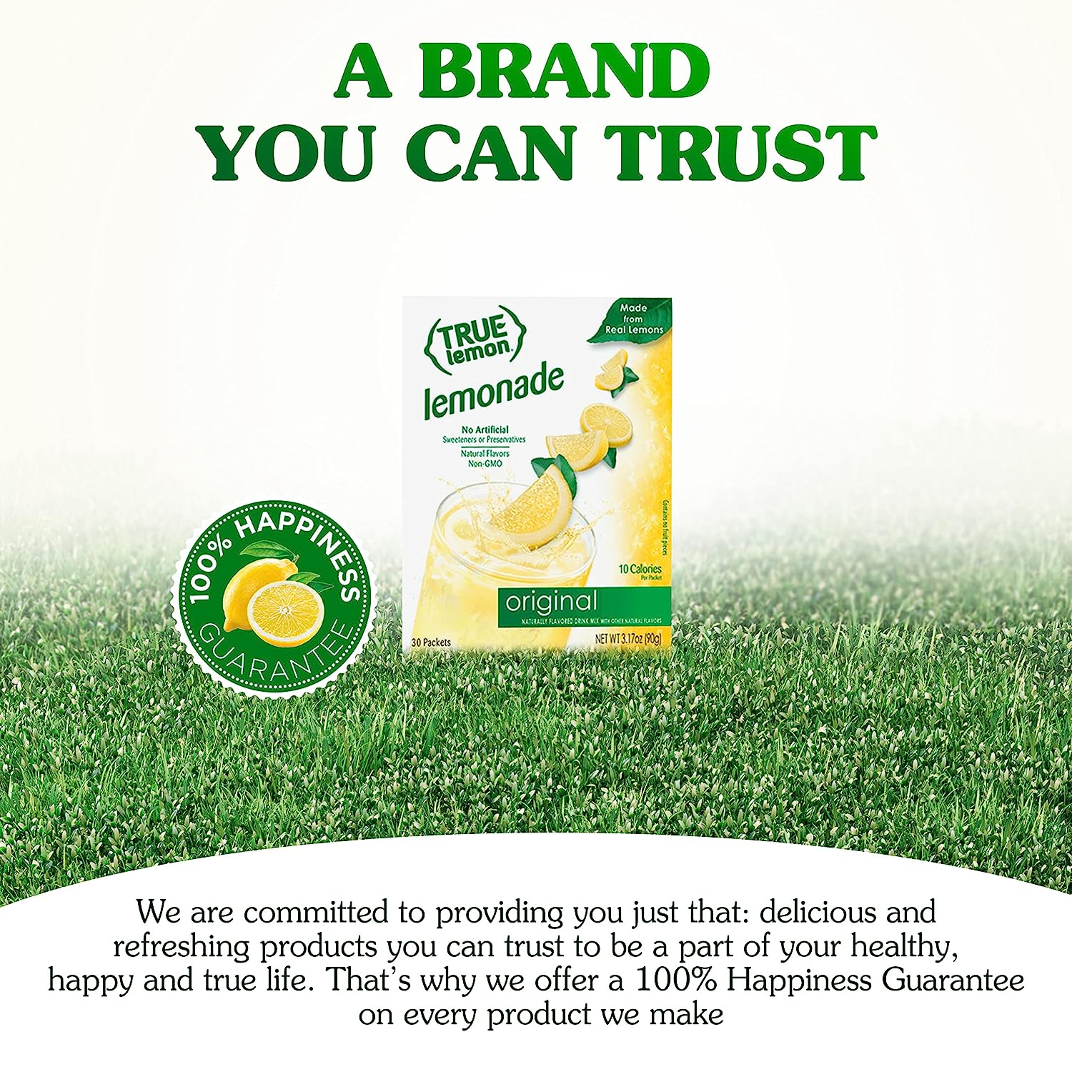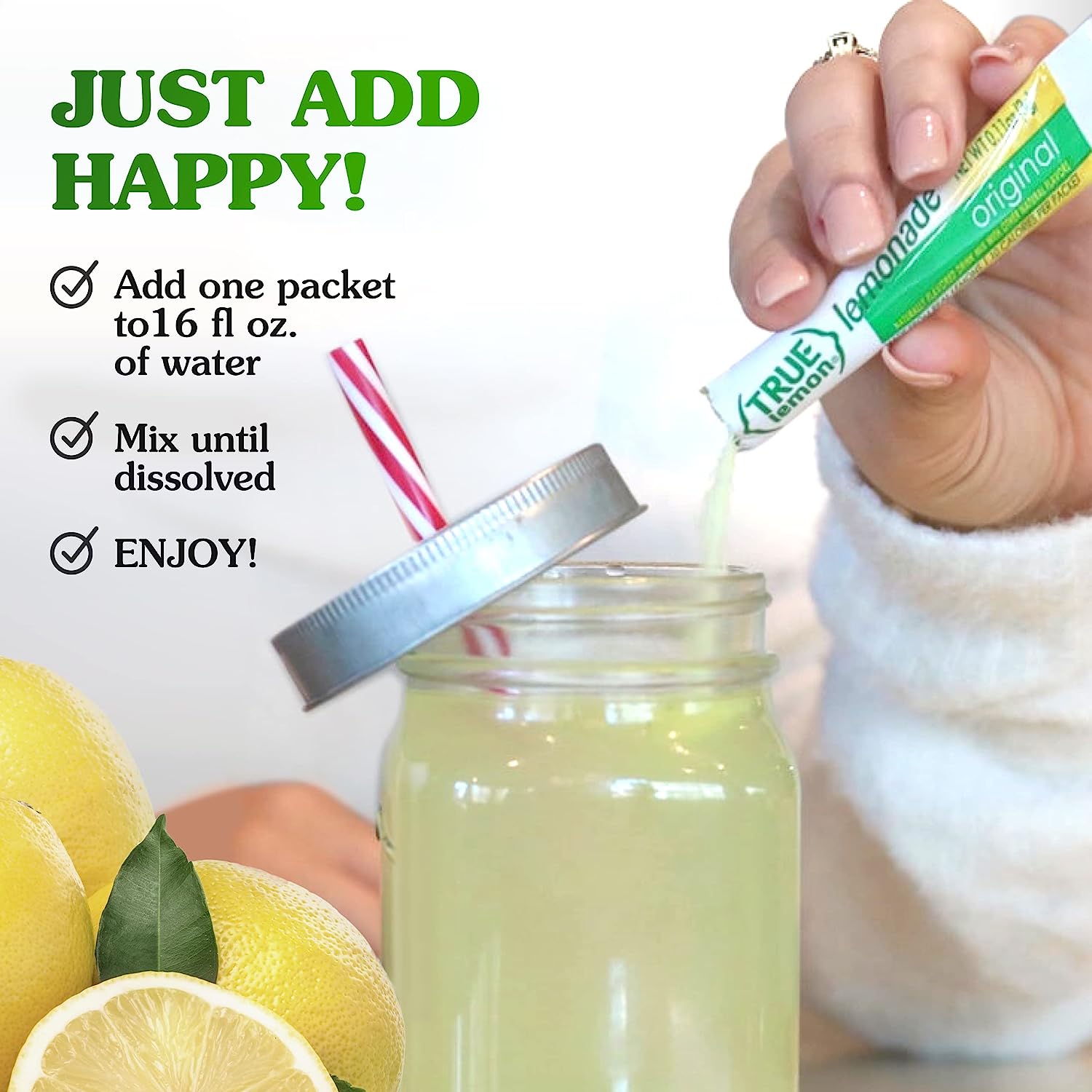 "TRUE LEMON Original Lemonade Drink Mix is made from real lemon juice and oils and naturally sweetened with stevia. Made with simple and clean ingredients that you can pronounce, this award-winning lemonade mix will enhance the flavor of your water so you can drink more of it and help fight dehydration. Our TRUE LEMON Original Lemonade Drink Mix contains only 10 calories per powdered drink mix stick packet (or 5 calories per serving for 2 quart size box). TRUE CITRUS was founded as a way to answer the question: why hasn’t anyone been able to put quality, fresh-squeezed lemon taste into a packet form so it’s convenient for everyone, everywhere? Today, the TRUE CITRUS family includes over 100 delicious and refreshing products. These include our tasty and hydrating low-calorie Drink Mixes and our flavorful salt-free Seasoning Blends."