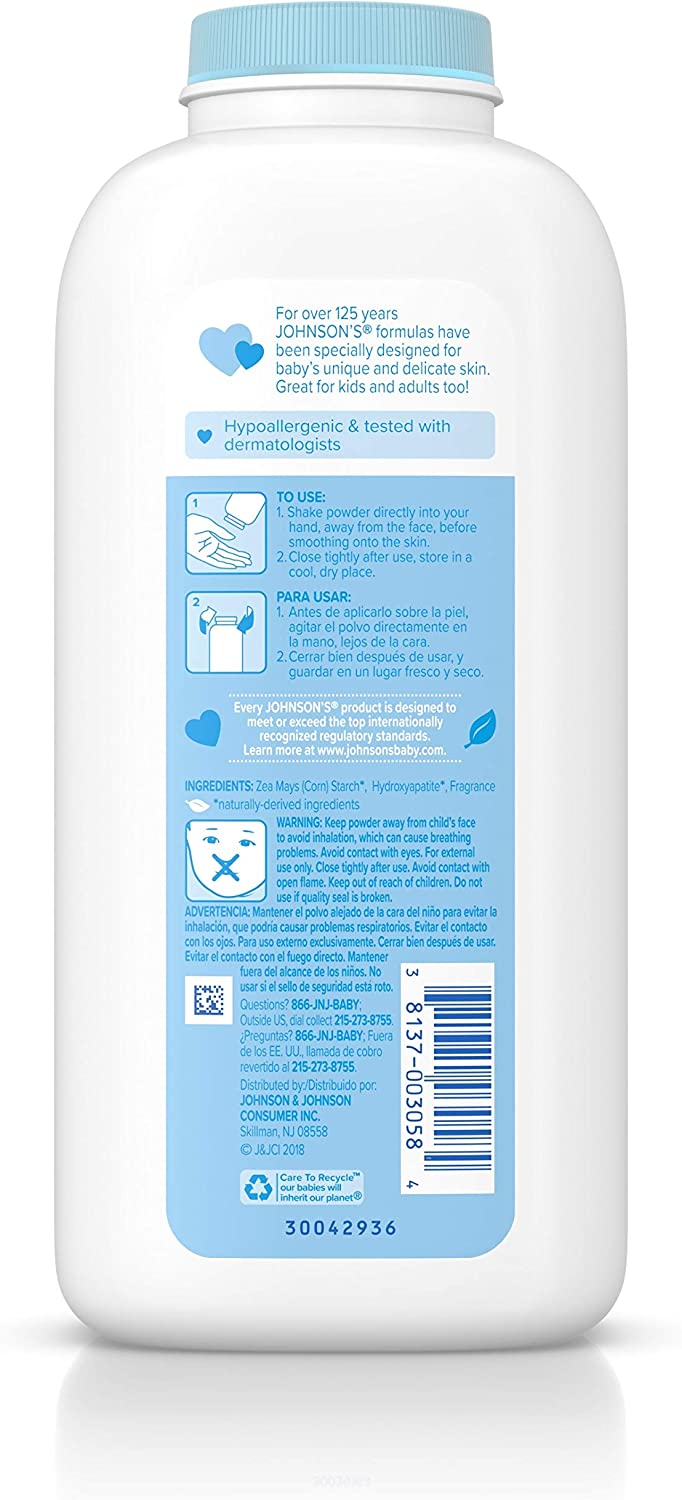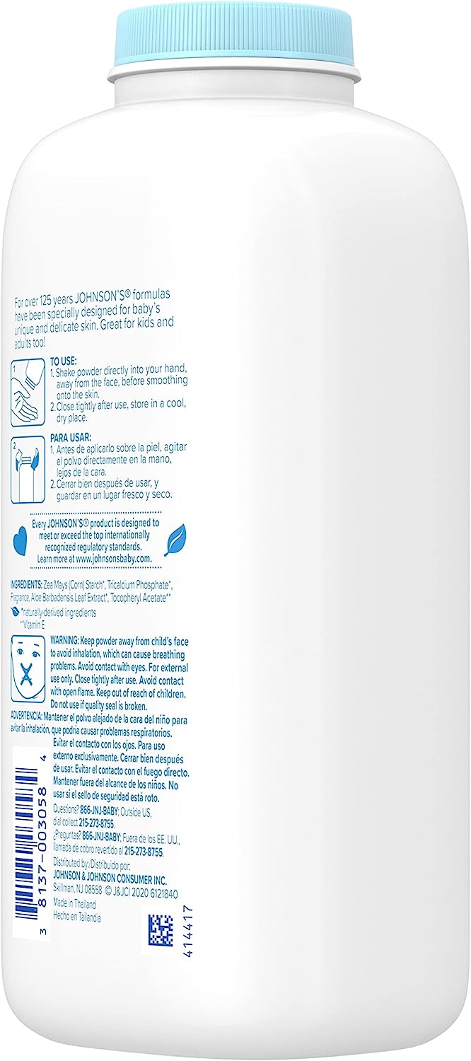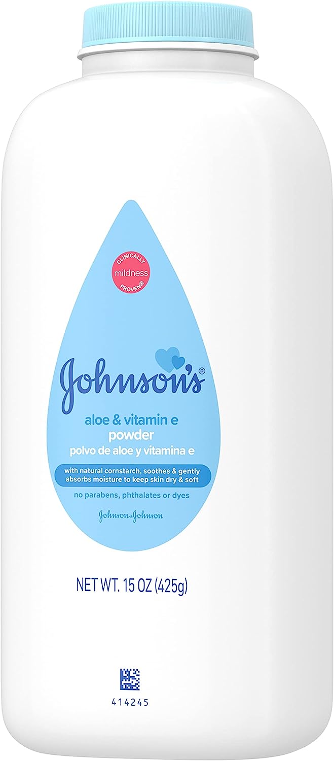 Johnson's Aloe & Vitamin E naturally derived cornstarch baby powder gently absorbs moisture to soothe delicate skin, and leave it feeling soft and smooth. Specially formulated for babies, this naturally derived cornstarch baby powder is dermatologist tested and clinically proven mild and gentle. This hypoallergenic baby powder is free of parabens, phthalates, dyes, and harsh fragrances. Formulated to be gentle, never harsh, this powder has a light, silky texture for easy application. It's great for kids and adults, too! Try it at the beach to help easily remove sand or use it as a dry shampoo alternative for adults.
