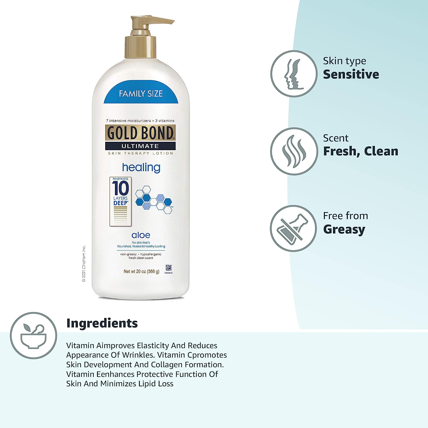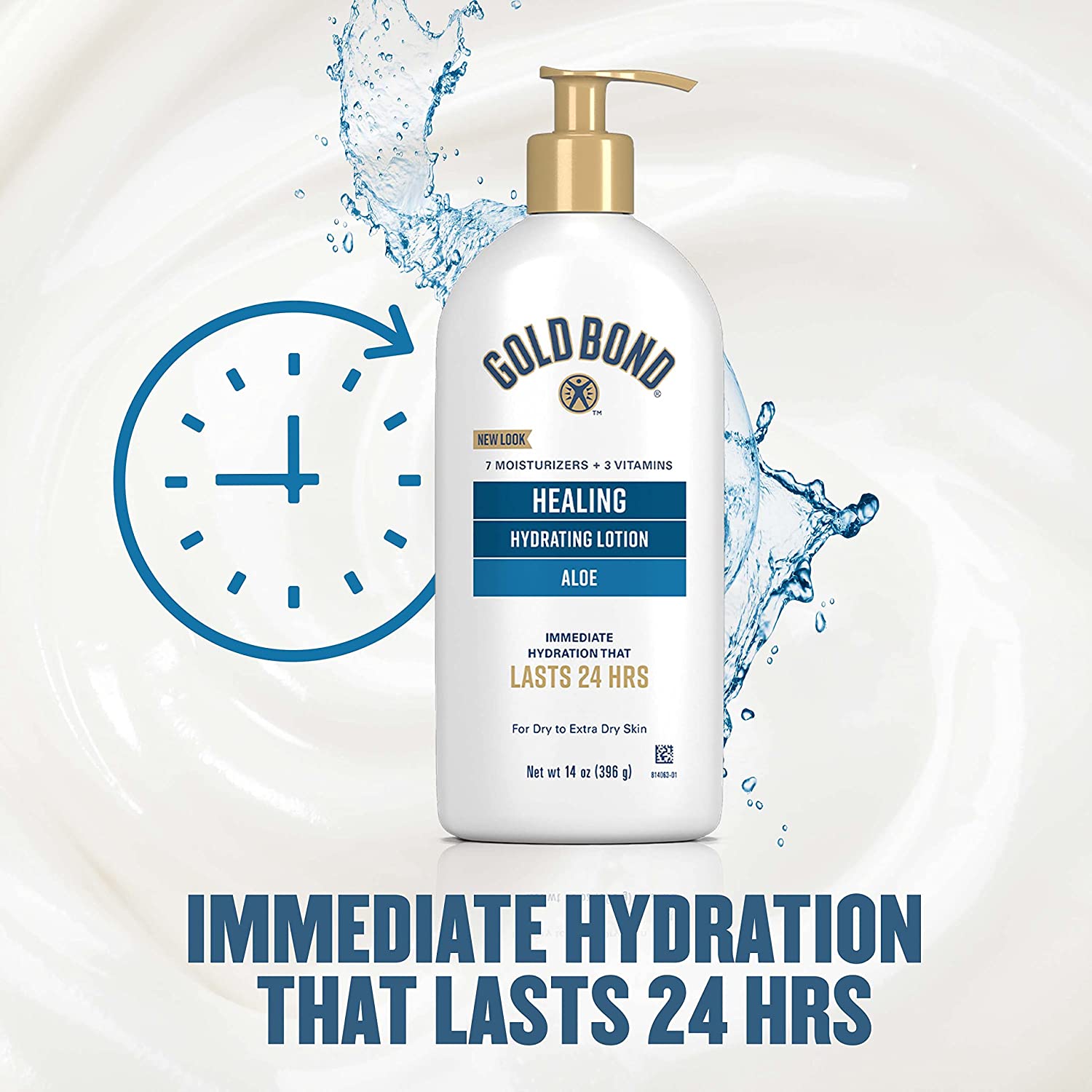 Hydrate and nourish dry skin for a full 24 hours with Gold Bond Healing Skin Therapy Lotion with aloe. This daily moisturizer has a fresh, clean scent and provides long lasting moisture for skin that looks and feels noticeably healthier. This lotion has seven intensive moisturizers with vitamins A, C and E to help stop dry skin before it starts. The Gold Bond Healing formula is non-greasy, hypoallergenic, and dermatologist-tested for everyday use. Stock up on large bottles of Gold Bond Healing Lotion so you always have soothing dry skin relief on hand. Your skin is a champion. One that never settles for silver. Gold Bond is high performance skin care for real life so you can be your best while keeping your skin at its best.