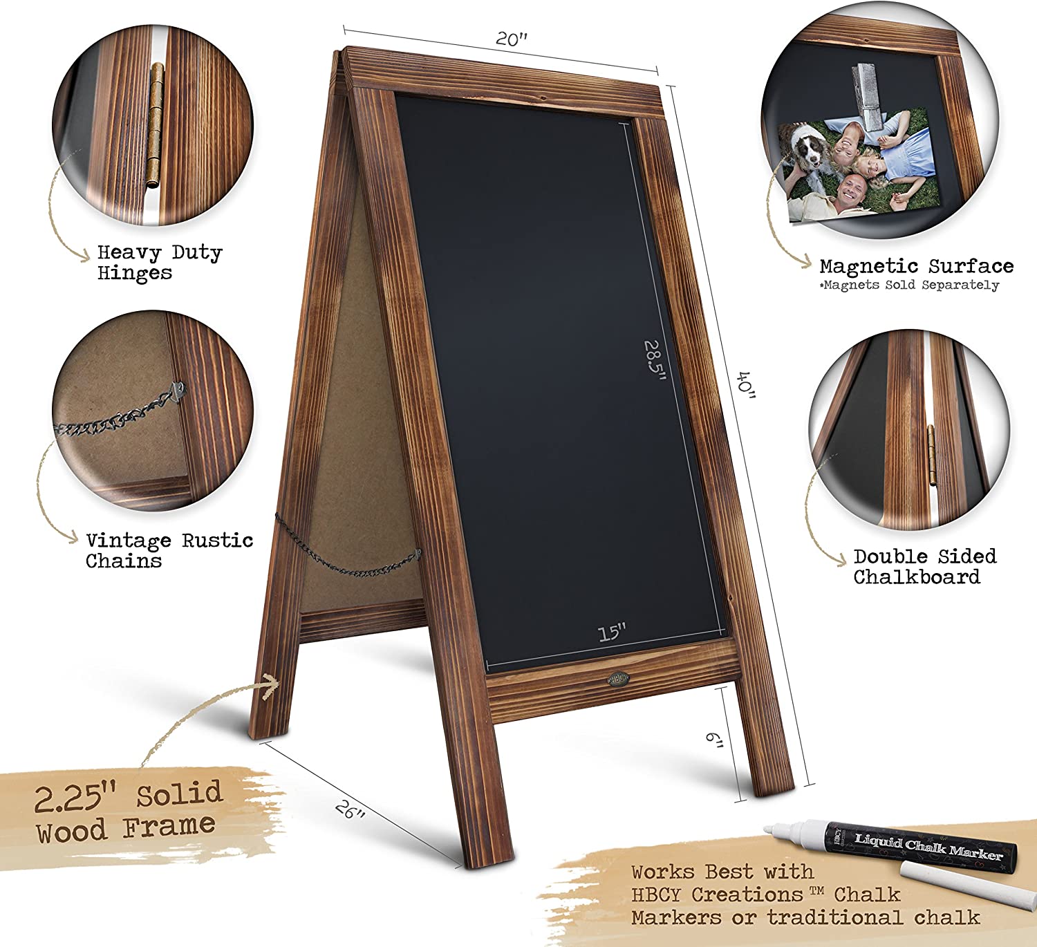 • Exquisite craftsmanship: Our magnetic A-frame sidewalk sign is meticulously handcrafted with great attention to detail. The double-sided rustic chains further enhance the aesthetic beauty of our rustic-style chalkboard wood sign.