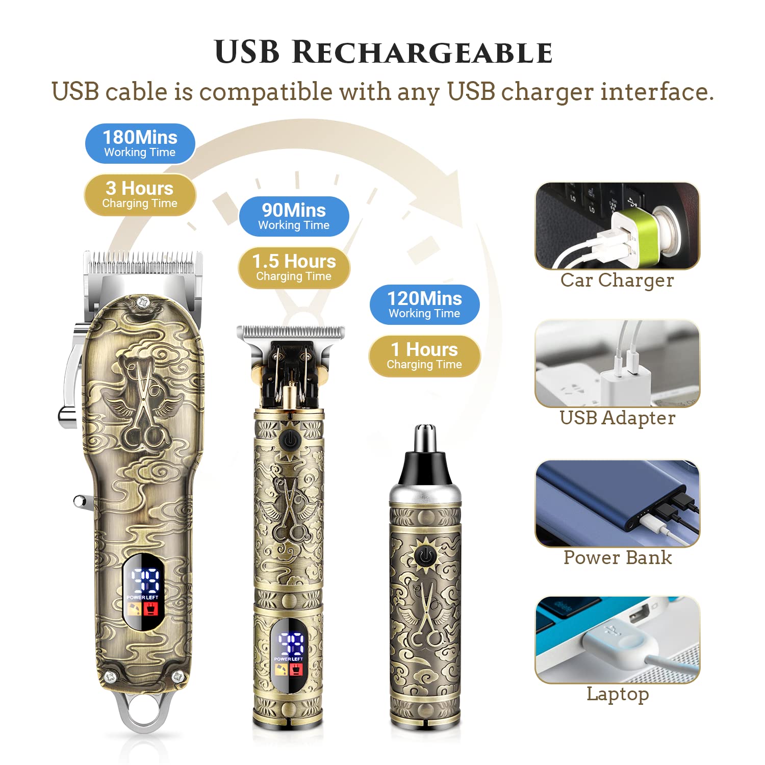 • 【LCD Display & USB Fast Charging】The Qhou hair clipper has a built-in LED display to indicate when your clipper needs to be charged. The built-in battery is high-quality and safe, and a 3-hour charge of the hair clipper provides up to 180 minutes of running time. Charging the hair trimmer for 1.5 hours provides up to 90 minutes of runtime. A 1-hour charge of the nose hair trimmer provides up to 120 minutes of runtime.