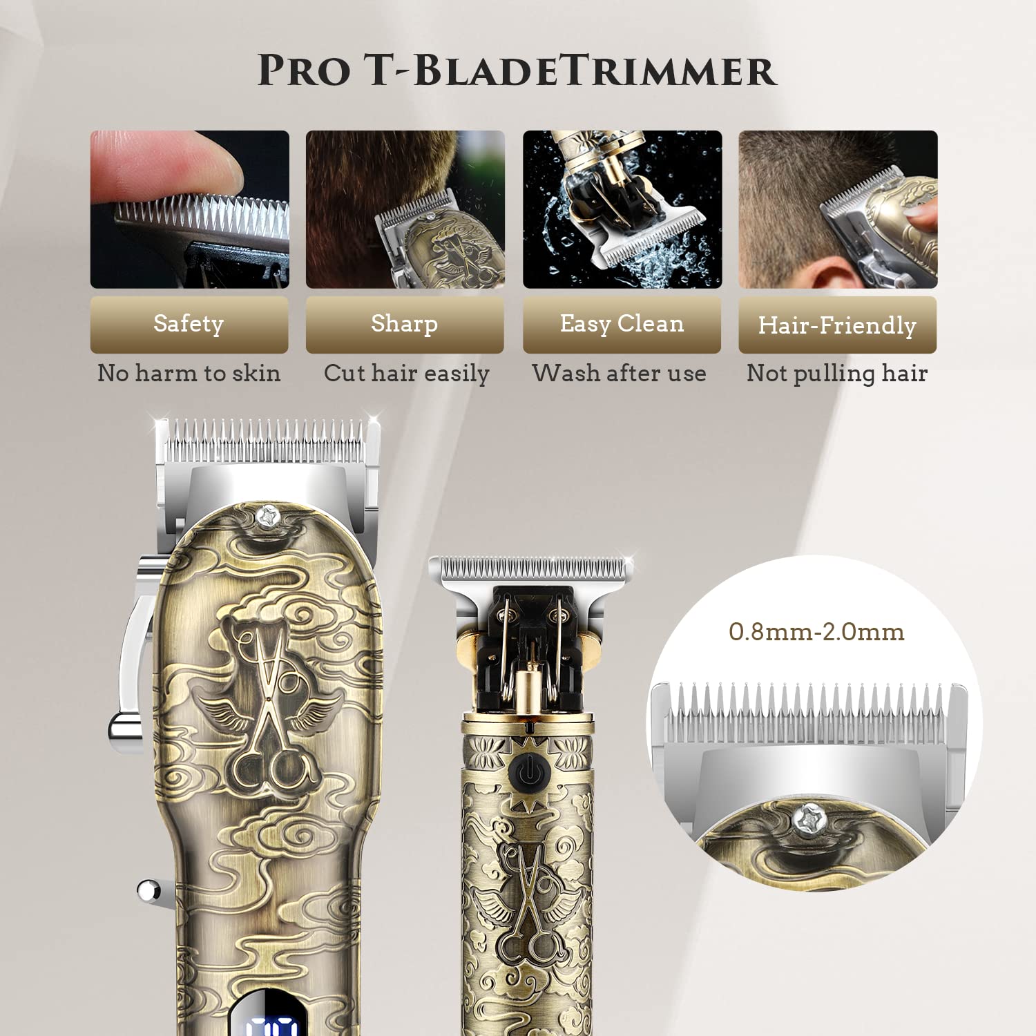 • 【Powerful Motor & Low Noise】This trimmer has 10W powerful motor, with a non-slip surface and easier to hold. The sharp and durable precision stainless steel T-blade can efficiently achieve smooth and close cutting. When you get up for work in the morning or need to cut your hair, shave or trim your nose hair after overtime at night, you don't need to worry about disturbing your family's sleep. The noise of this product is below 60 decibels.