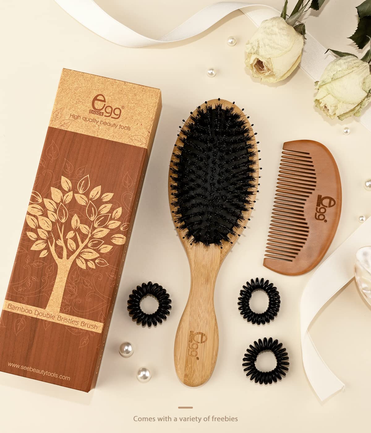 BLACK EGG Boar Bristle Hair Brush for Women Men Kid, Soft Natural Bristles Brush for Thin and Fine Hair, Restore Shine and Texture, Set includes Bamboo comb and 3 hair ties
