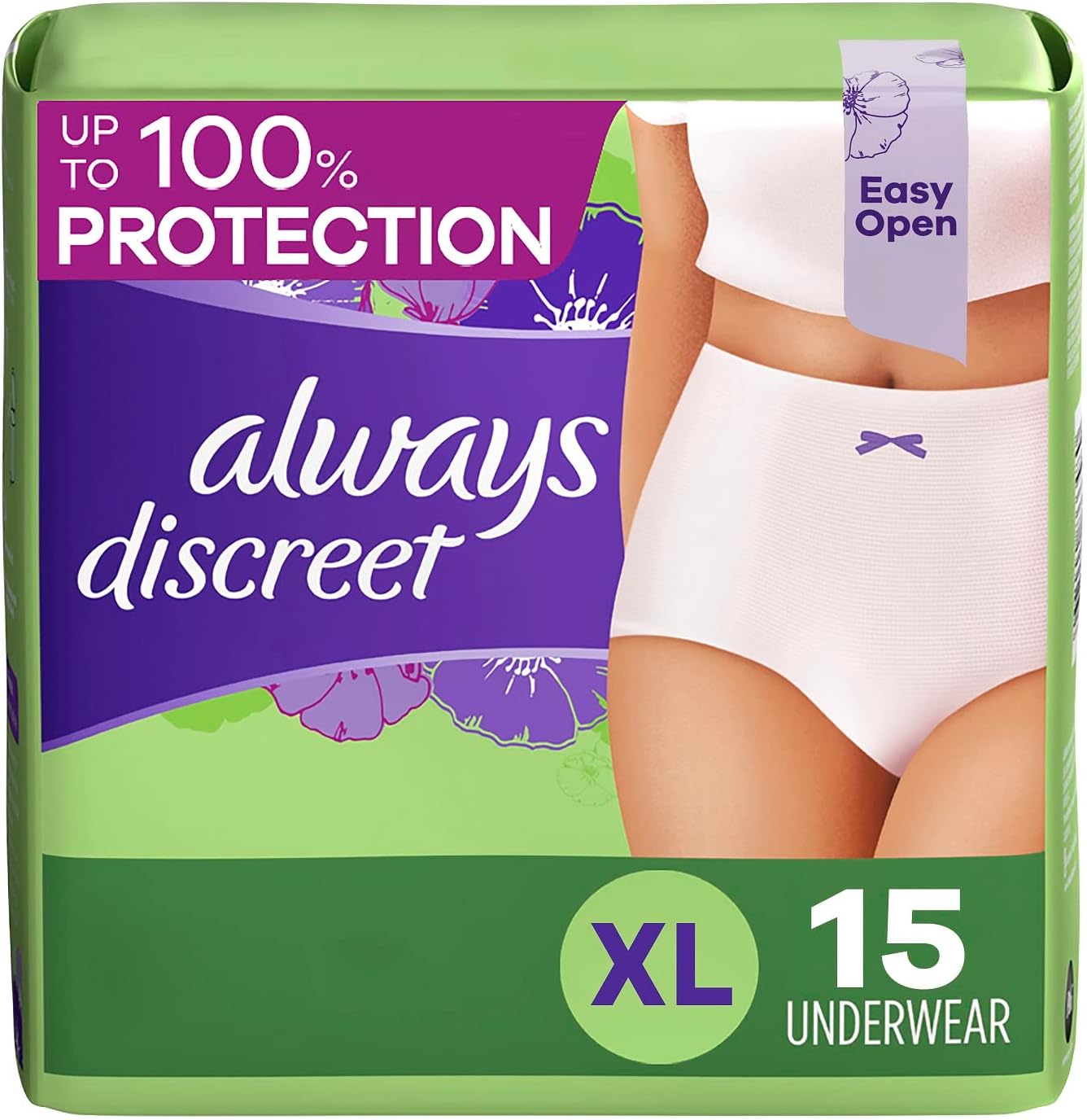 Finally, long-lasting bladder leak protection that feels as good as it looks. Say 'never again' to bulky adult diapers and 'hello' to Always Discreet disposable incontinence underwear for women with a smooth and secure fit that looks and feels like real underwear. The form-fitting design of Always Discreet Incontinence and Postpartum Underwear for women hugs your curves with a soft, silk-like fabric so you can walk with poise and confidence. It’s the delicate, barely noticeable look you want in disposable panties for women, paired with the leak-proof protection you deserve. The super absorbent core turns liquid to gel to stop bladder leaks in seconds for up to 12 hours of reliable leak-free protection. Exclusive OdorLock Technology neutralizes odors instantly and continuously, to help you feel confidently fresh and dry all day long. Unexpected leaks don’t stand a chance with the special side LeakGuard design that helps stop bladder leaks at the leg, where they happen most. Get incredible protection with the disposable underwear women can depend on. Specially designed to fit all kinds of curves, Always Discreet Incontinence Underwear is available in sizes Small / Medium – Large / Extra Large/ XXL, so you’ll be sure to get the protection you deserve with Always Discreet incontinence and postpartum underwear. Easy Open Bags for extra convenience. Incontinence panties for women ship discreetly and are Available in bulk. FSA and HSA eligible.