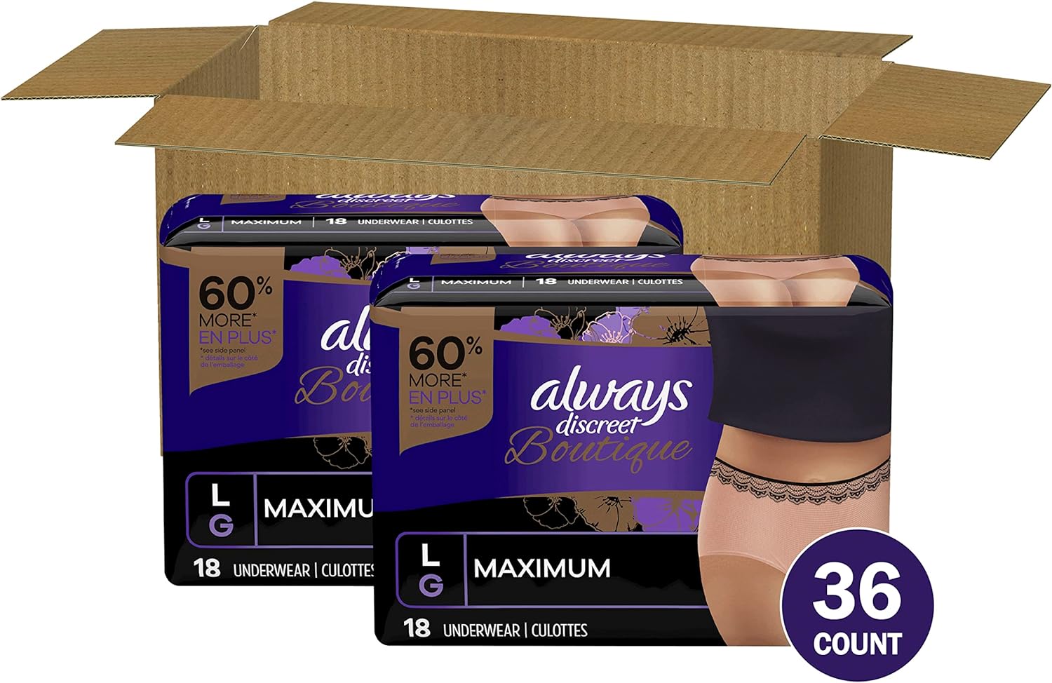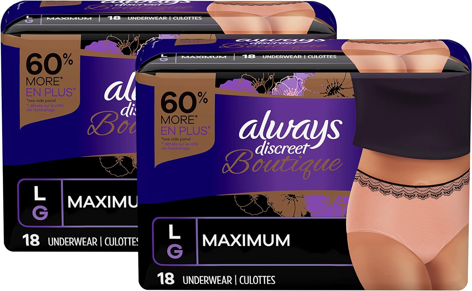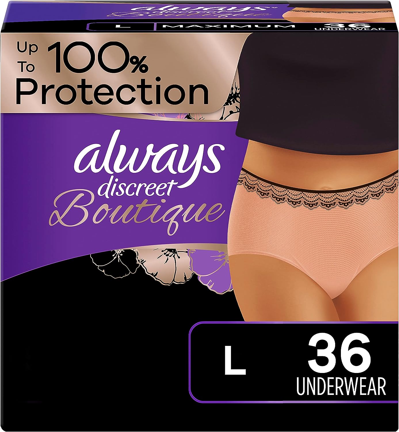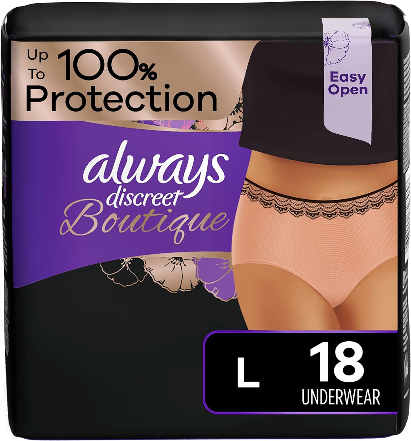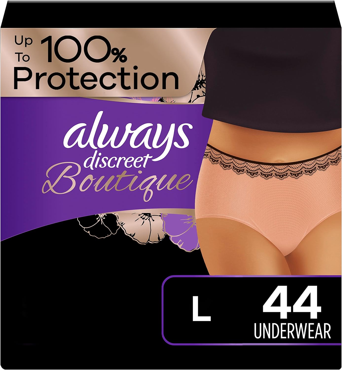 Looking for disposable women's incontinence underwear that gives you maximum protection? Tired of bulky adult diapers that don't look and feel like "real" panties? Try Always Discreet Boutique Incontinence Underwear, which gives our most sophisticated fit along with a soft feel you'll love. The form-fitting design hugs a woman's curves with a soft, silk-like fabric so you can walk with poise and confidence. The ultra-thin core turns liquid to gel and locks away wetness in seconds for maximum protection that leaves you feeling secure for hours. Plus, these panties feature a special side LeakGuard to help stop leaks where they happen most: at the leg. Whether you have an overactive bladder or you're experiencing postpartum urine leaks, the exclusive OdorLock technology neutralizes odors instantly and continuously so you can stay fresh all day long. Get incredible and reliable protection with ladies' disposable Always Discreet incontinence underwear, available in sizes S/M - XL to fit all kinds of curves. Don't let leaks get in the way of your day, simply find your right size with the Always Discreet My Fit chart and get the protection you can depend on. Then, choose between two different yet equally stylish options - Black Low-Rise and Rosy High-Rise - to better personalize your look.