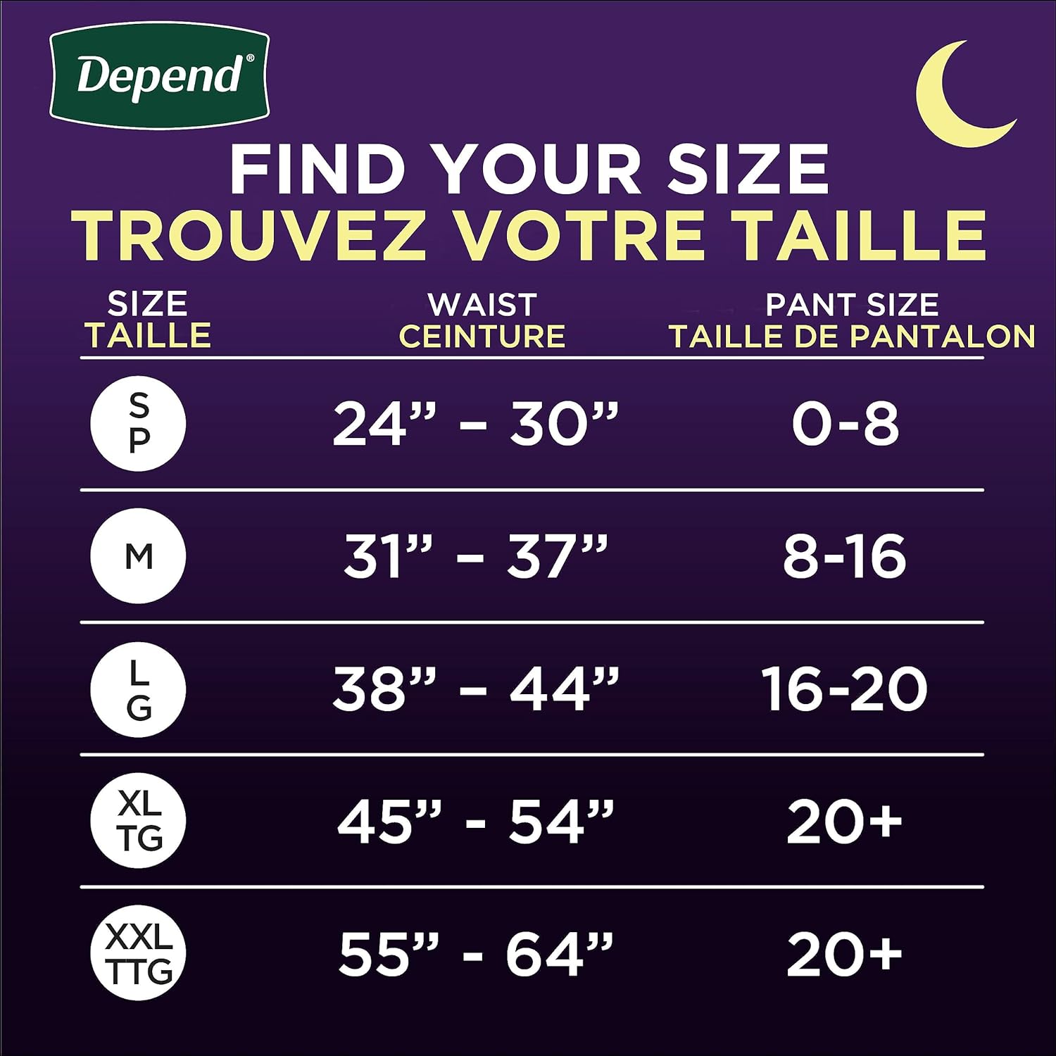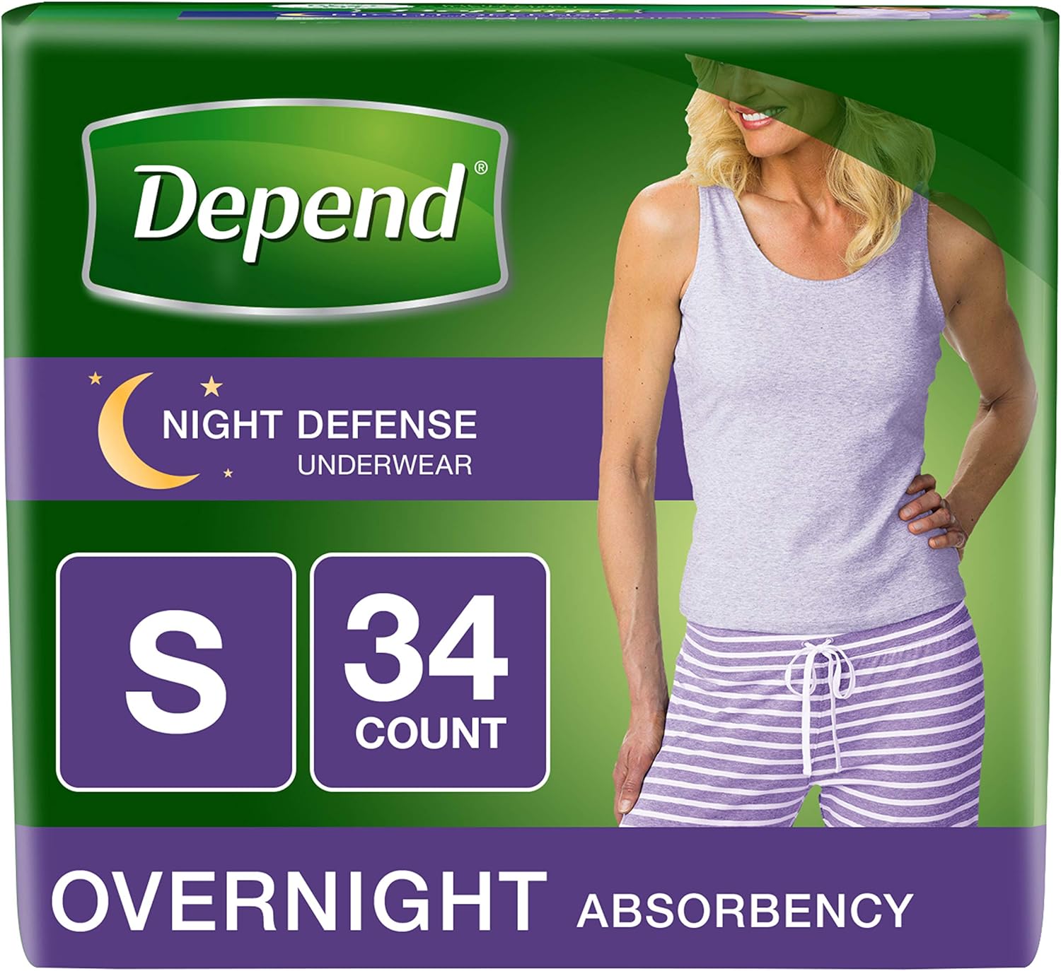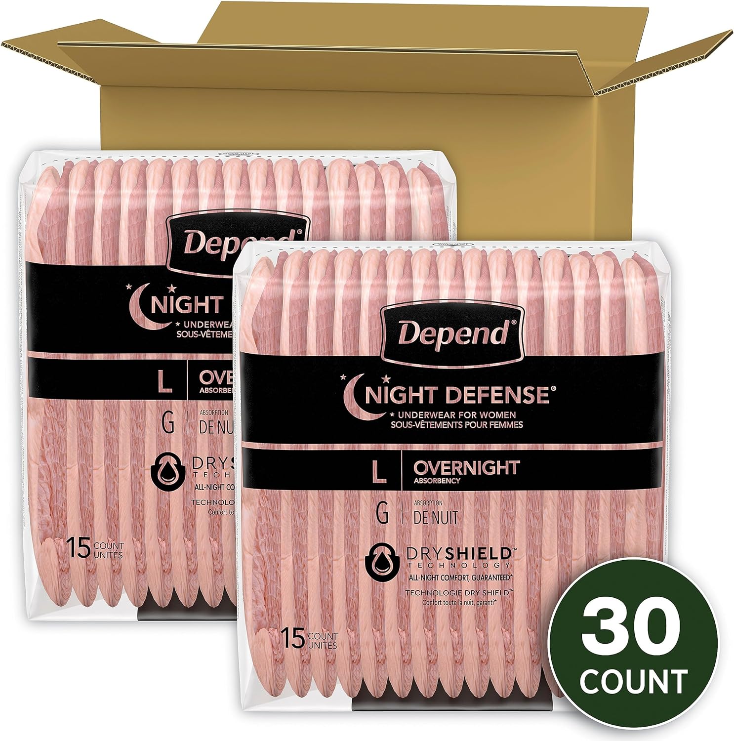 Sleep through the night with Depend Night Defense Women’s Incontinence Overnight Underwear with DryShield Technology, providing you all-night comfort, guaranteed.* Featuring a beautiful blush color and three feminine designs, this disposable underwear is ideal for bladder incontinence for nighttime use, with up to 12 hours of protection. Extremely soft, yet strong, material instantly locks in wetness and odors, helping to keep you dry and worry-free through the night. A comfortable, underwear-like fit – it is designed with the SureFit waistband to keep underwear in place and the form-fitting elastic strands provide a smooth, discreet fit under pajamas, unlike bulky overnight adult diapers. Absorbent protective underwear is soft, quiet and breathable. Depend Night Defense for Women with Overnight Absorbency is available in four sizes - size small (24-30” waist), size medium (31-37” waist), size large (38-44” waist) and size extra-large (45-54” waist). Depend adult incontinence supplies always ship in a discreet box and are FSA/HSA-eligible in the U.S. Packaging may vary from images shown. *If you're not completely satisfied with the fit of your Depend Underwear, we can help. Original receipt/UPC required. Restrictions apply. See Depend website for details. Purchase by 12/31/24. Mail in by 1/31/25.**vs. the leading bargain brand