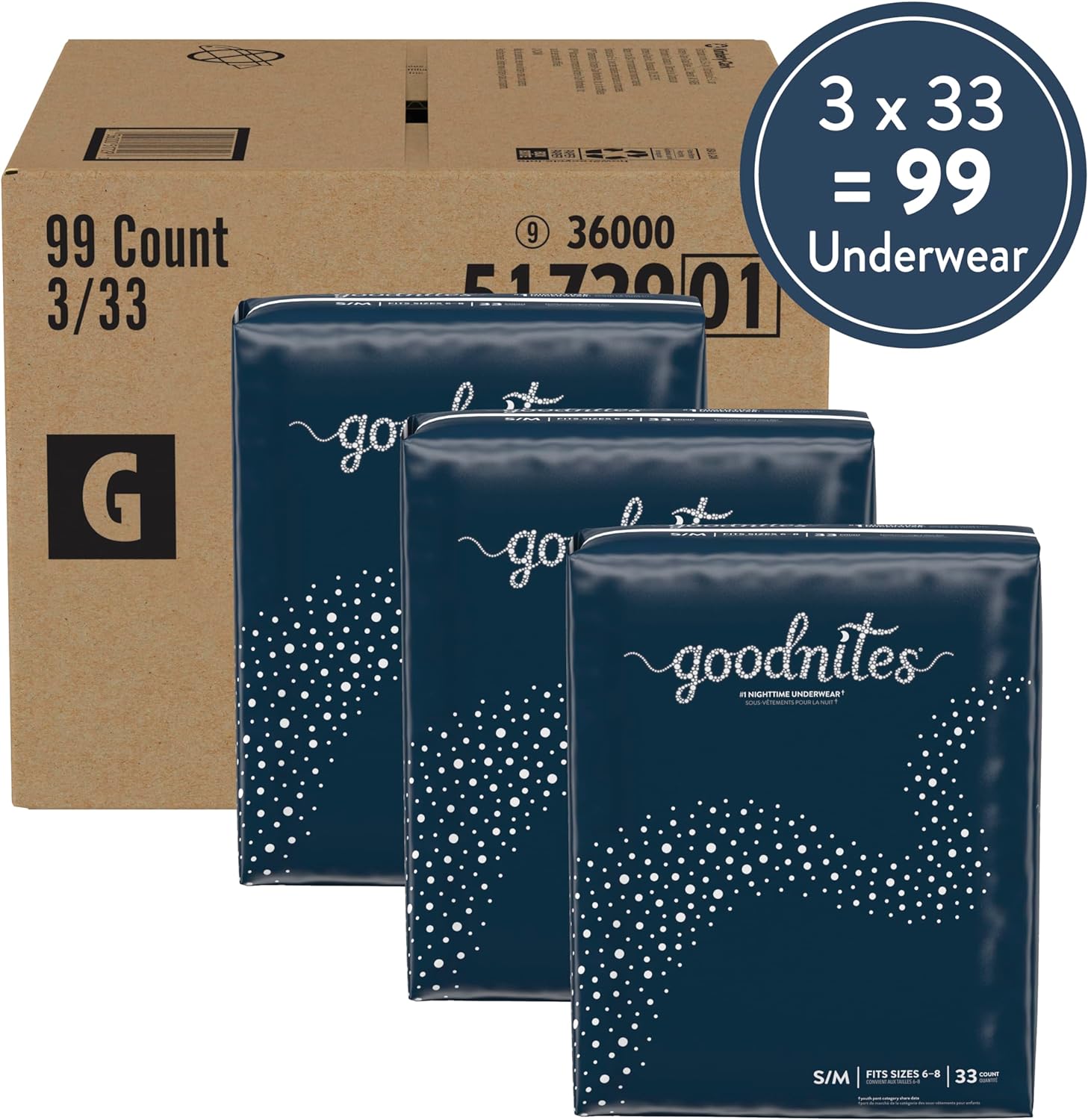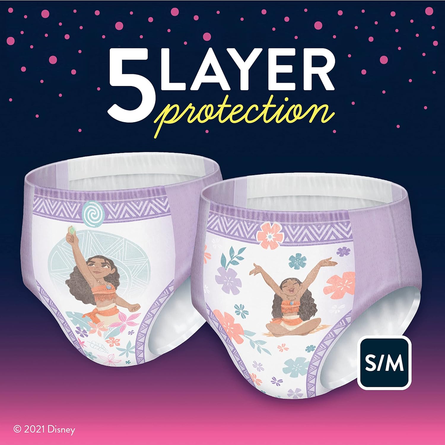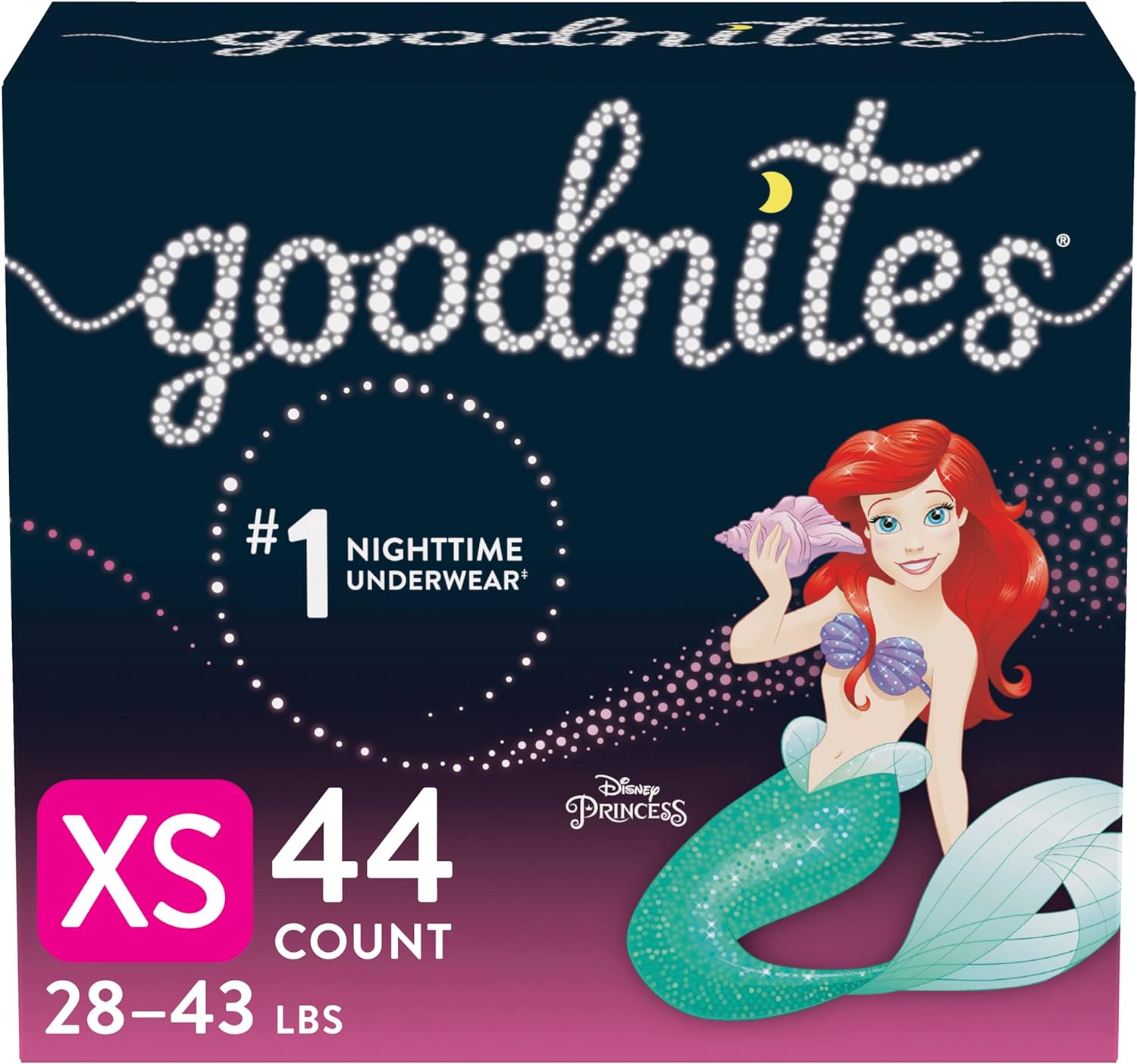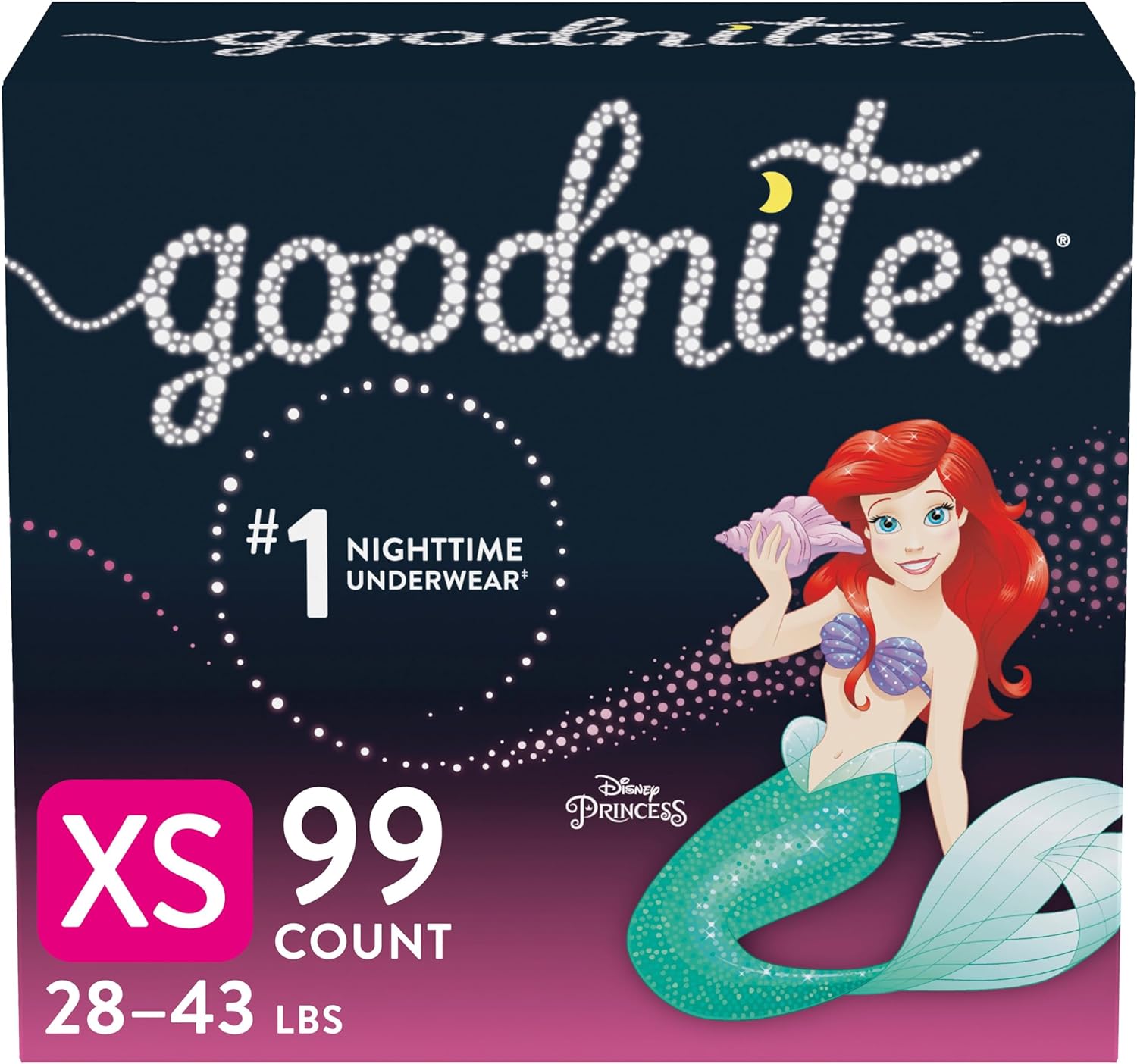 Goodnites is the #1 Nighttime Underwear* for bedwetting and helps your kids wake up feeling awesome. Goodnites Nighttime Bedwetting Underwear for Girls provides our best fit and protection guaranteed** for kids ages 3 and up. These disposable bedwetting pants are made with 5 Layer Protection and reinforced Double Leg Barriers. As our most comfortable nighttime protection, Goodnites Overnight Bedwetting Pants feature super stretchy sides to fit many body shapes and sizes. Unlike training pants, Goodnites disposable bedwetting underwear discreetly absorb odor and offer 40% more protection vs. the leading training pant. Plus, our nighttime bedwetting pants are clinically proven to be hypoallergenic and are free of added fragrances, parabens and elemental chlorine bleaching. Featuring Disney designs, Goodnites Girls' Bedwetting Underwear offer more sizes for a comfortable, tailored fit up to 140+ lbs and are available in Size XS (28-43 lbs), S/M (43-68 lbs), L (68-95 lbs) and XL (95-140+ lbs). FSA/HSA-eligible in the US. (*Youth Pant category share data) (**If you're not completely satisfied with the fit of your Goodnites Underwear, we can help. Original receipt/UPC required. Restrictions apply. See Goodnites website for details. Purchase by 12/31/2023. Mail in within 30 days of purchase, no later than 02/28/2024)