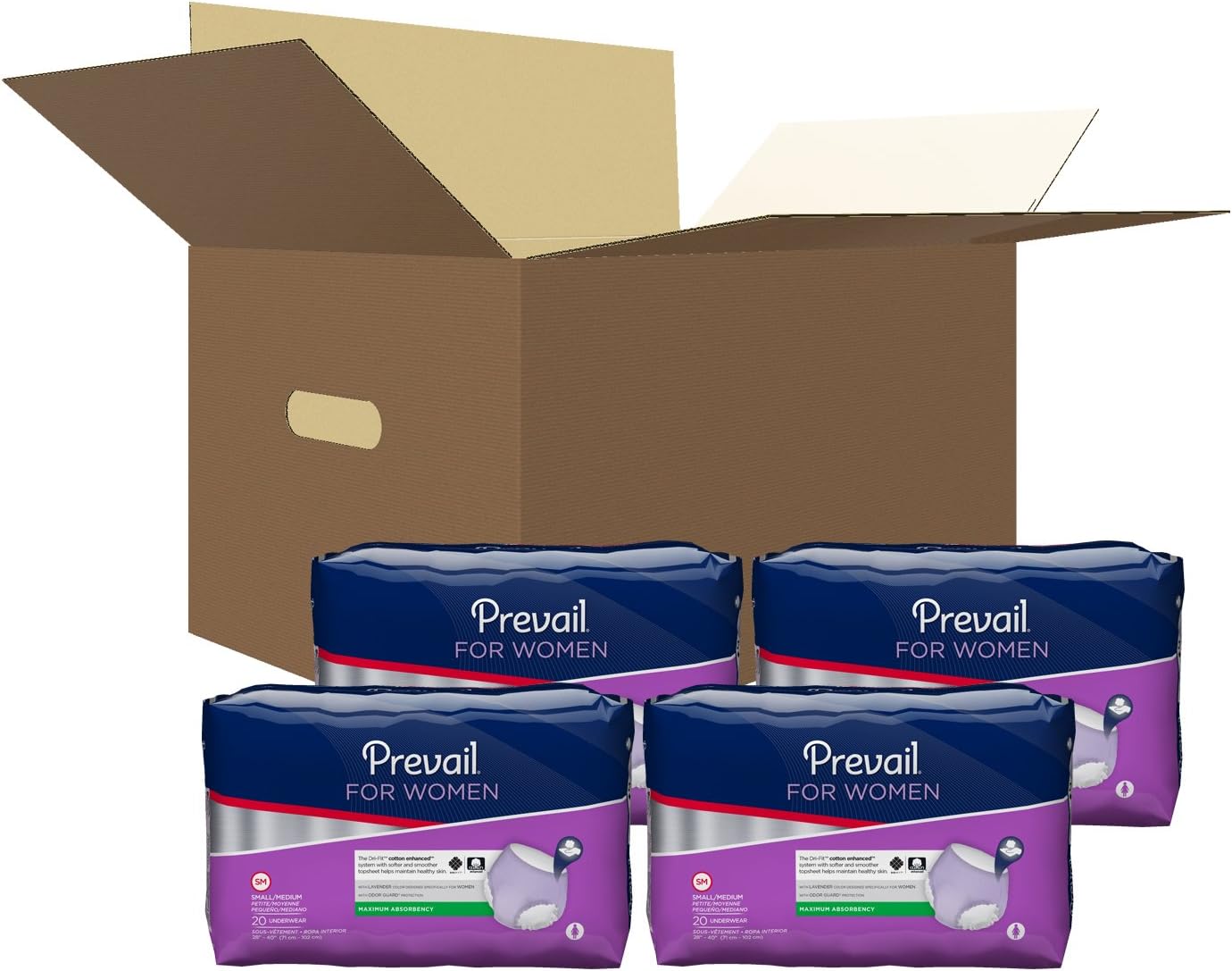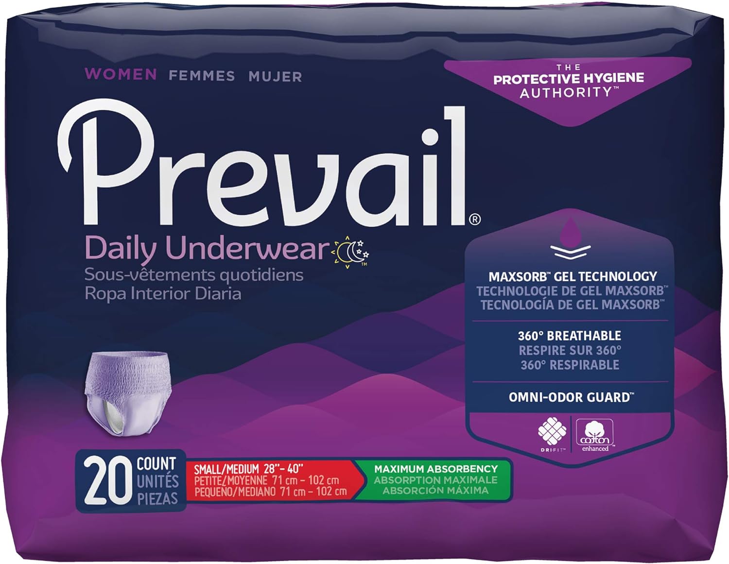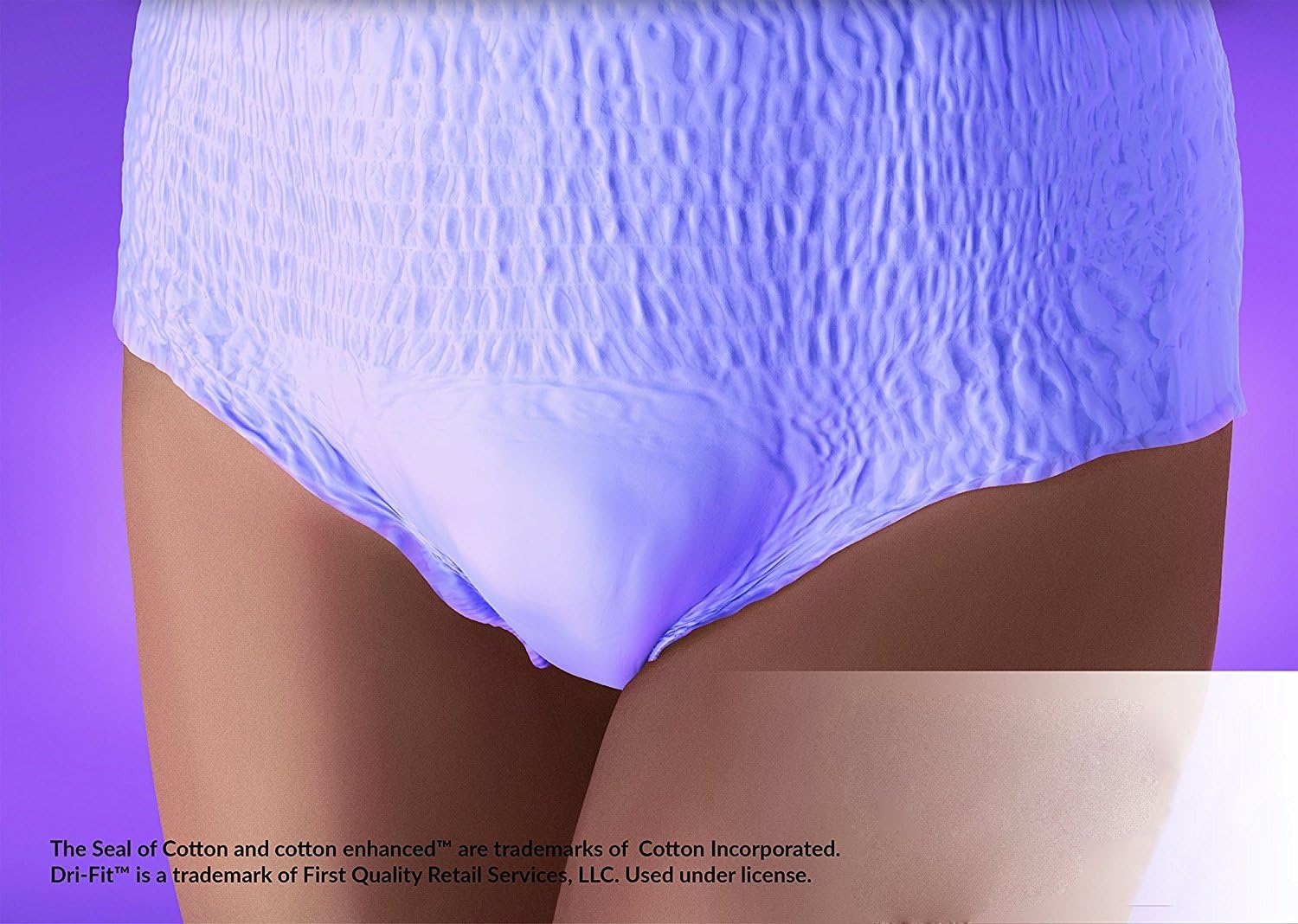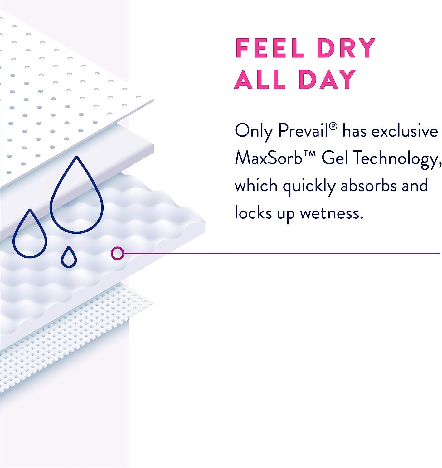 Take on every day with confidence in pretty lavender Prevail for Women: Maximum Absorbency Underwear. Specifically designed for women who need moderate to heavy leakage protection, it has the look and feel of regular underwear. Features include: 1) Dri-Fit cotton enhanced system to support healthy skin, 2) Comfort-Shape Plus with gentle elastics that shape to your body, 3) Breathable Zones that allow skin to breathe, 4) QUICK WICK with MaxSoft to rapidly absorb wetness, 5) Odor Guard to help prevent odors, 6) Cloth-Like Outer Fabric that is soft against the skin, and 7) Back Label with size like real underwear.