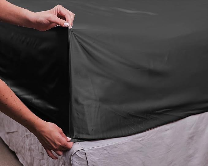 100% Mulberry Silk Fitted Sheet Only, 19 Momme Grade 6A Mulberry Silk, 16'' Deep Pocket, Luxury Soft Seamless Silk Bottom Sheet, Machine Washable (Black, Queen)