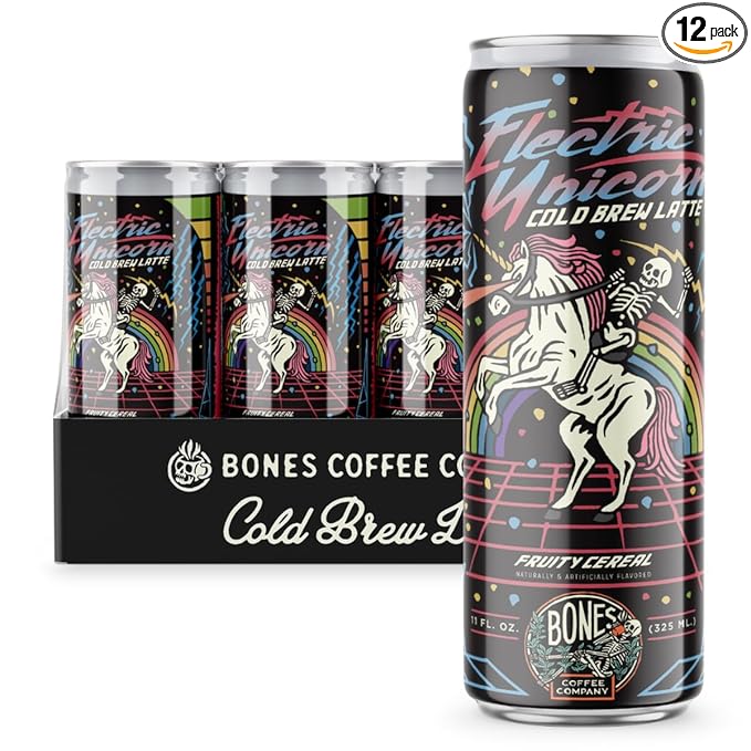 Bones Coffee Company Electric Unicorn Cold Brew Latte Fruity Cereal Flavored Coffee | 100% Ready To Drink Cold Brew Coffee Can | Smooth & Sweet Blend in Cans | 11 Fl Oz Can (12 Pack)