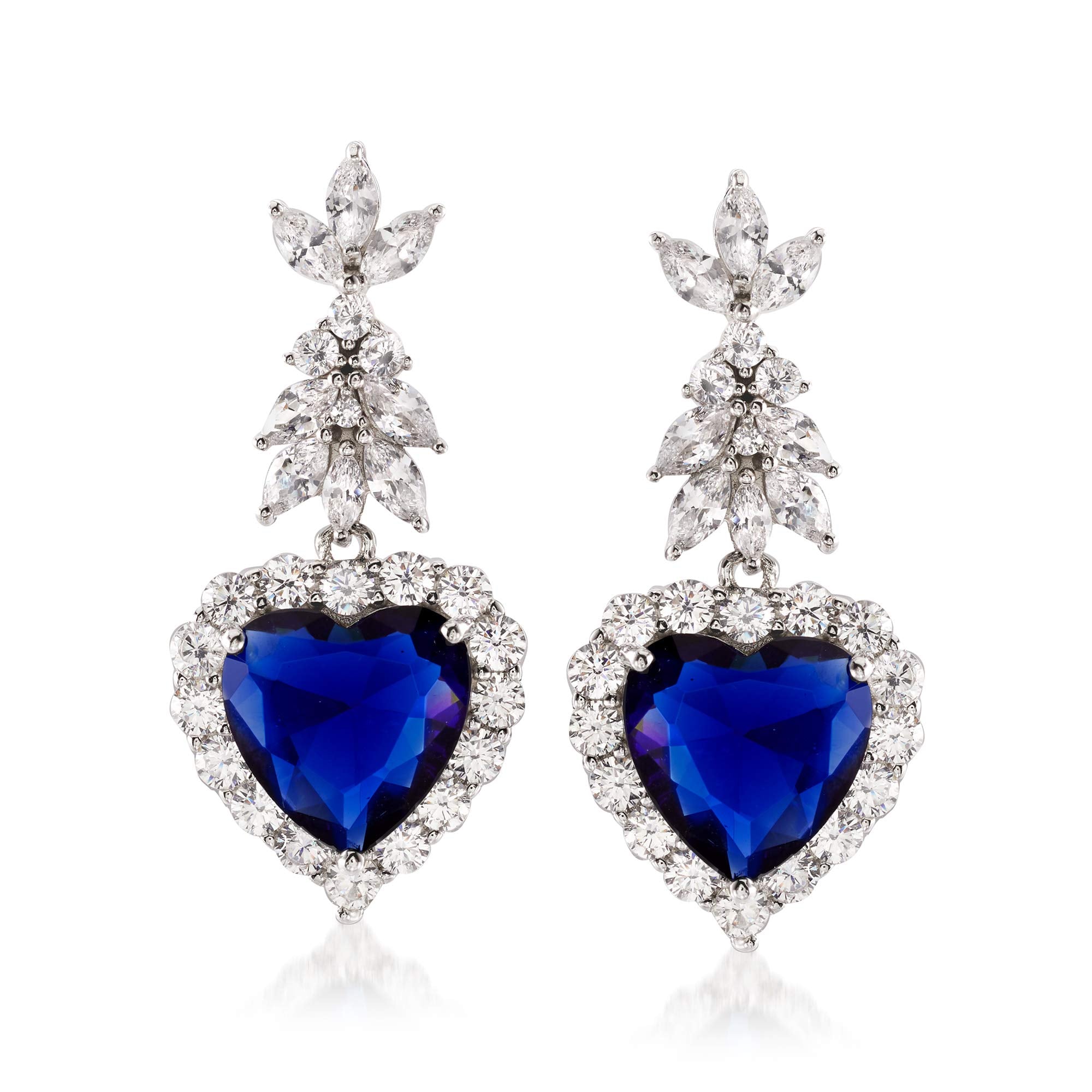 Details: Ross-Simons is the authority on fashionable must-haves. Regal and romantic, these drop earrings look just as luxurious as sapphires and diamonds. Features 14.50 ct. t.w. heart-shaped simulated sapphires in a flourish of marquise and round brilliant-cut CZs totaling 5.26 carats. Set in polished sterling silver. Hanging length is 1 1/4". Post/clutch, CZ and simulated sapphire heart drop earrings. Carat weights are diamond equivalents. Each Ross-Simons item arrives in a fine jewelry presentation box. Shop Ross-Simons jewelry risk-free as all items include a 30-day, 100% money-back guarantee.