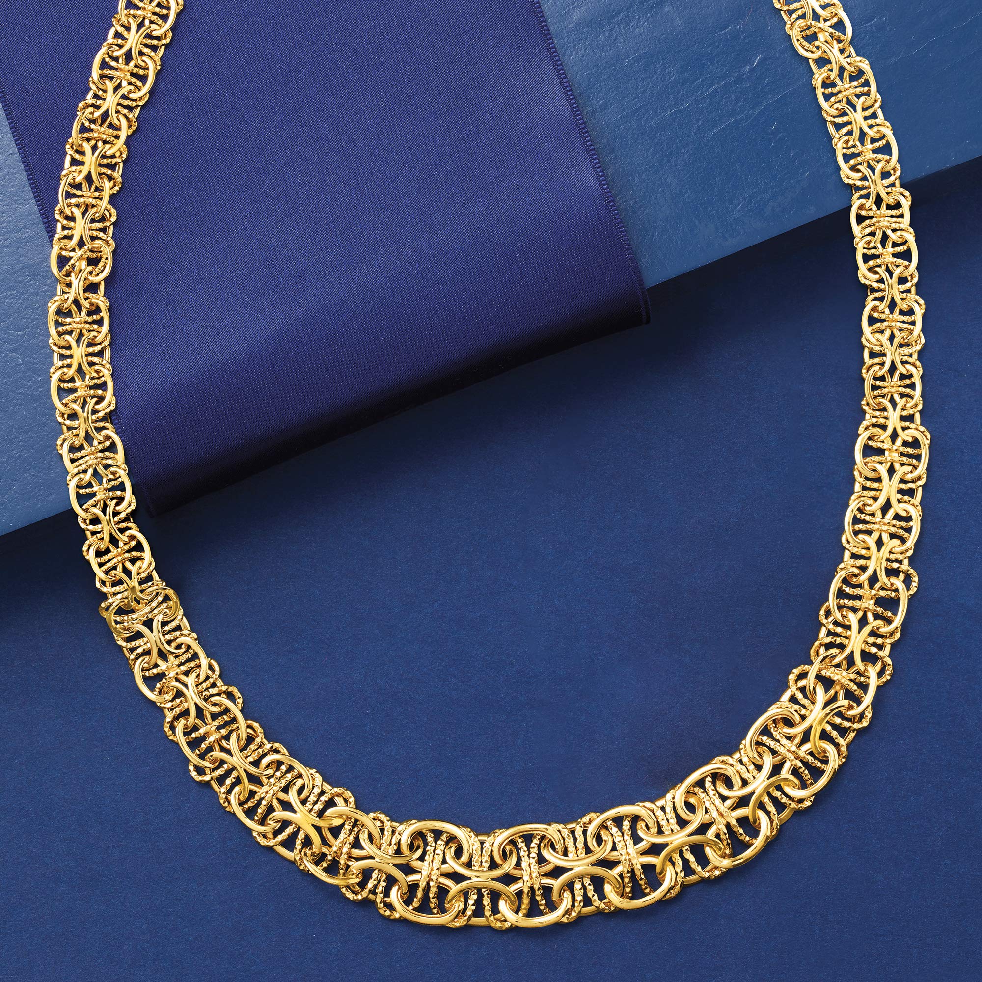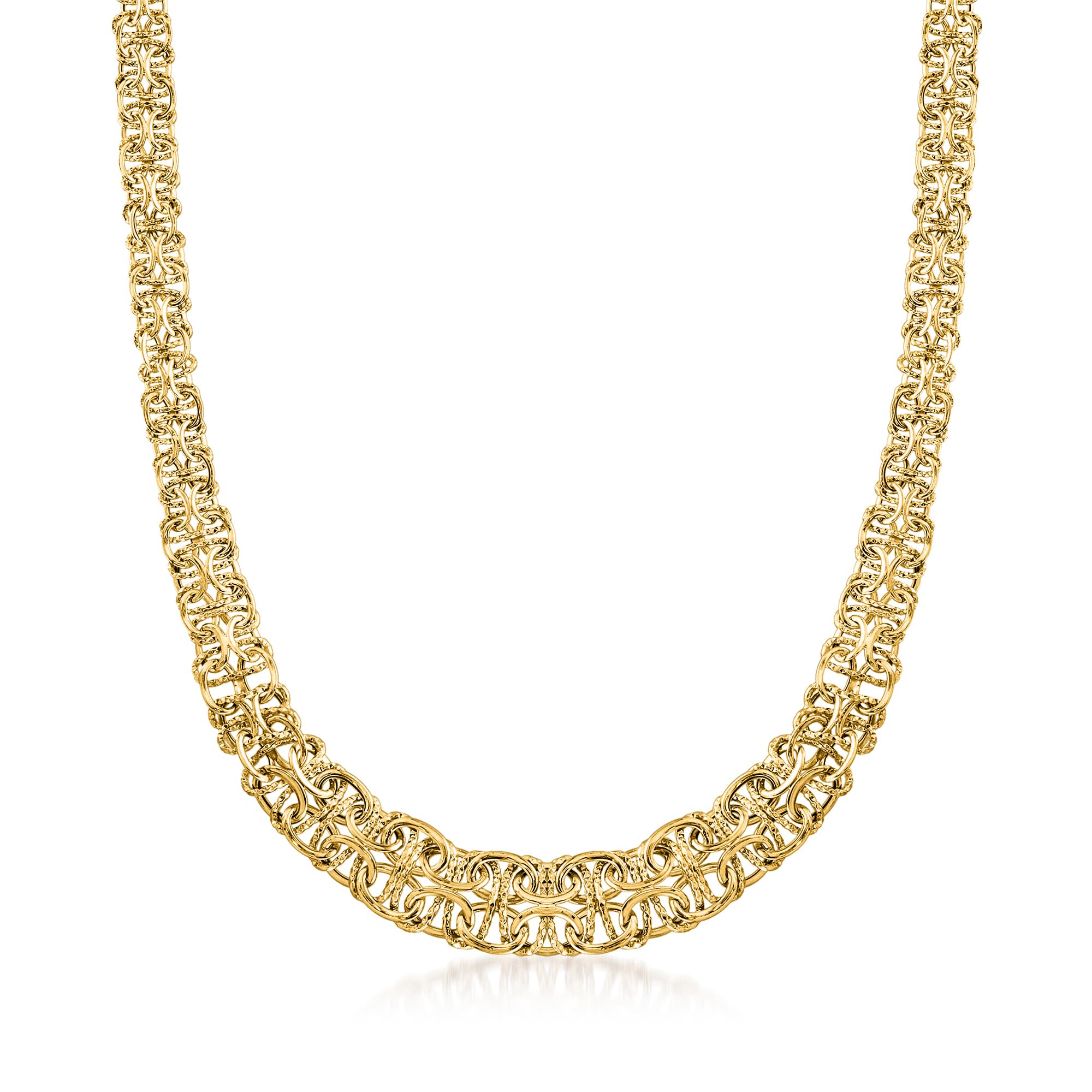 Details: Established in 1952, Ross-Simons presents contemporary styles with a timeless appeal. Handcrafted in textured and polished 14kt yellow gold, this Byzantine necklace features an appealing graduated design. Graduates from 3/8" to 1/2" wide. Lobster clasp, 14kt yellow gold graduated Byzantine necklace. Each Ross-Simons item arrives in a fine jewelry presentation box.