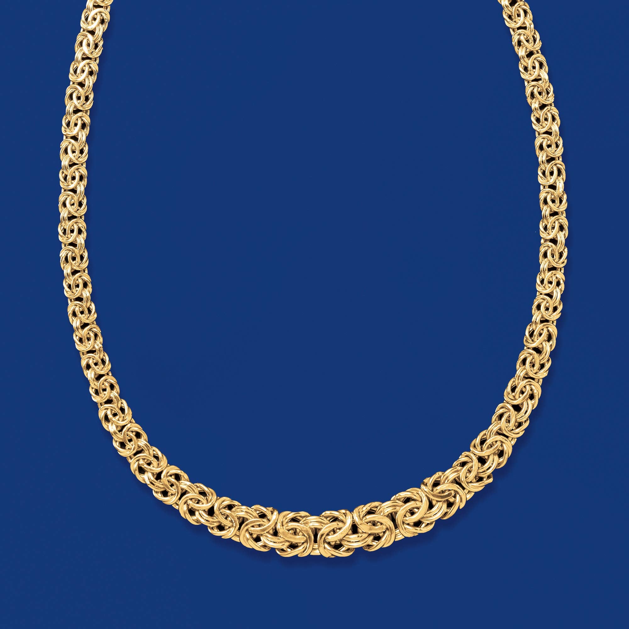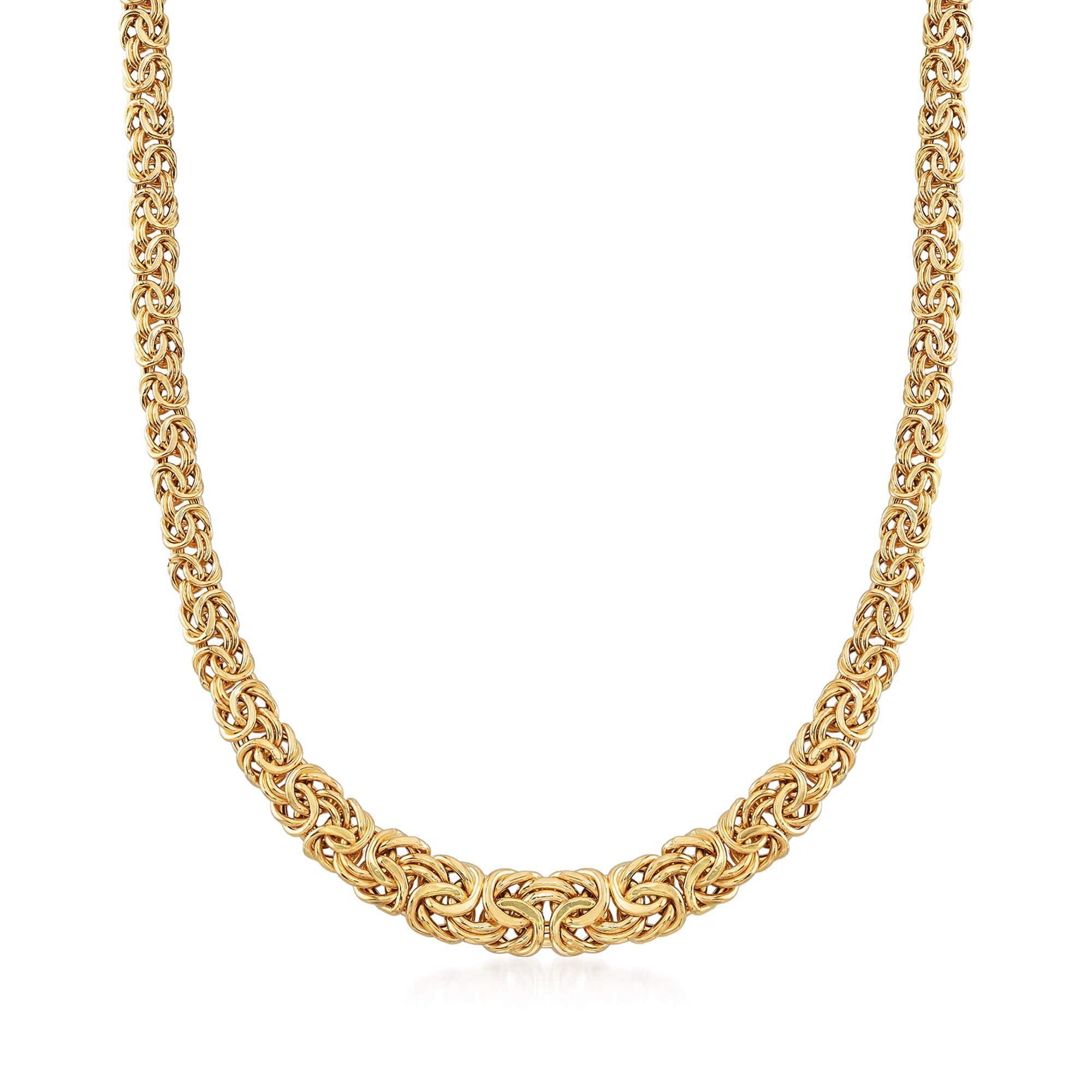 Details: Ross-Simons is always looking for new ways to reinvent essential jewelry styles. Love Byzantine? We know you do! This 18kt yellow gold Byzantine necklace is handcrafted and gorgeous, too! Wear it day or night or layered with others for an on-trend, tiered look. Graduates from 1/4" to 1/2" wide. Lobster clasp, 18kt gold Byzantine necklace. Each Ross-Simons item arrives in a fine jewelry presentation box.