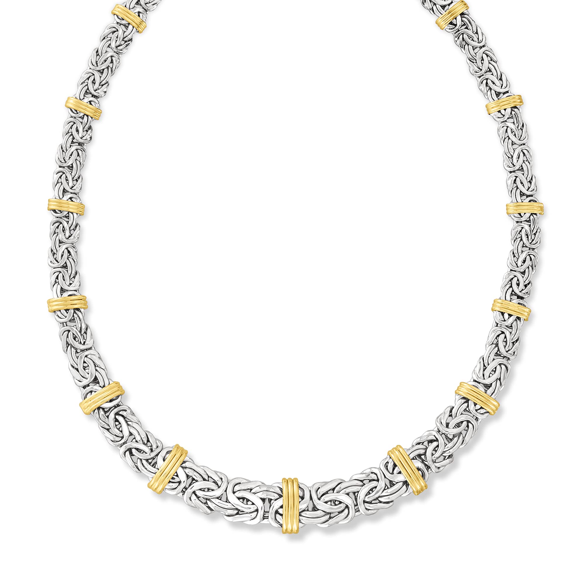 Details: Ross-Simons is always looking for new ways to reinvent essential jewelry styles. Handcrafted links of sterling silver host stationed 14kt yellow gold bars in this two-tone Byzantine classic. A necklace perfect for any occasion! Polished finish. Graduates from 1/4" to 1/2" wide. Lobster clasp, sterling silver and 14kt yellow gold Byzantine necklace. Each Ross-Simons item arrives in a fine jewelry presentation box.