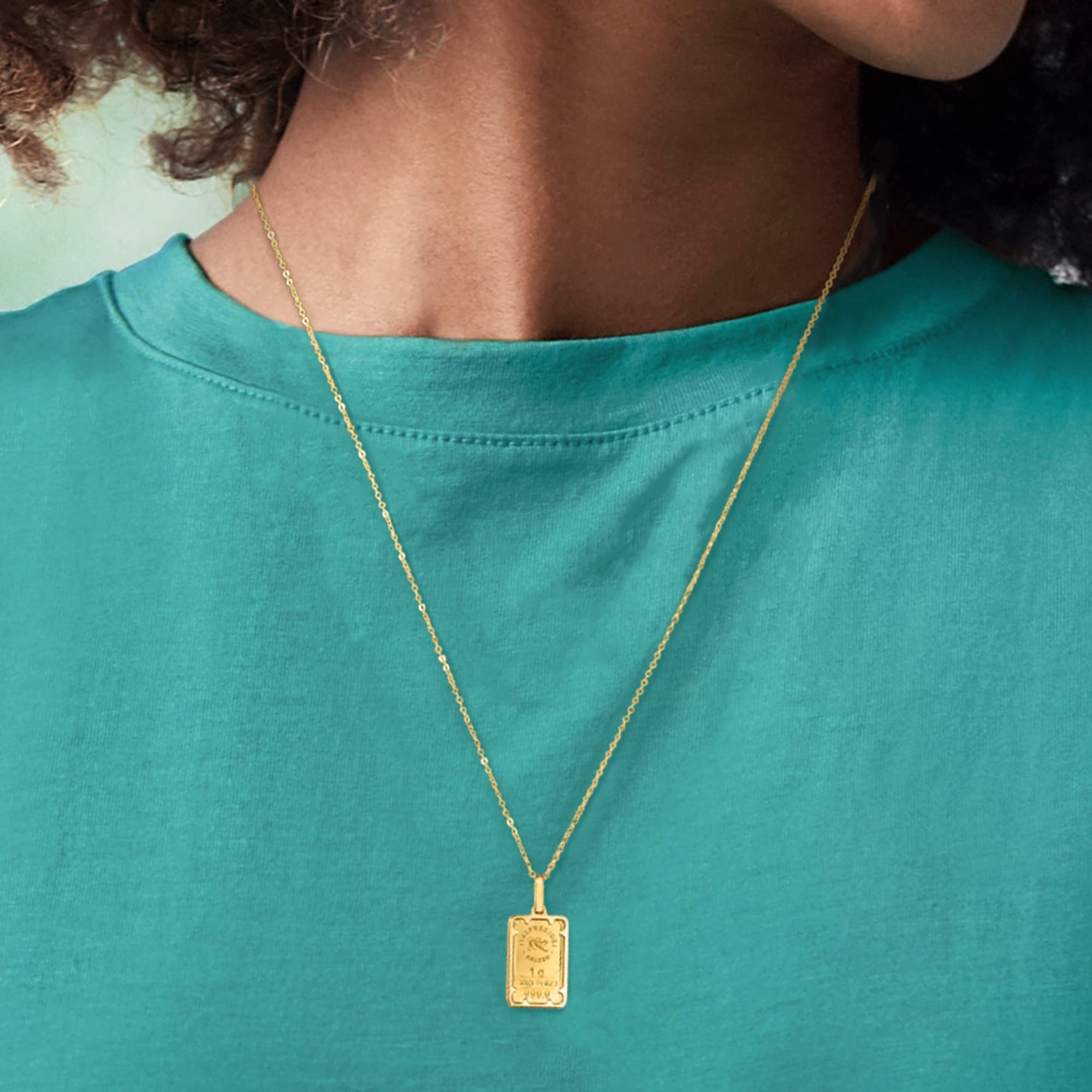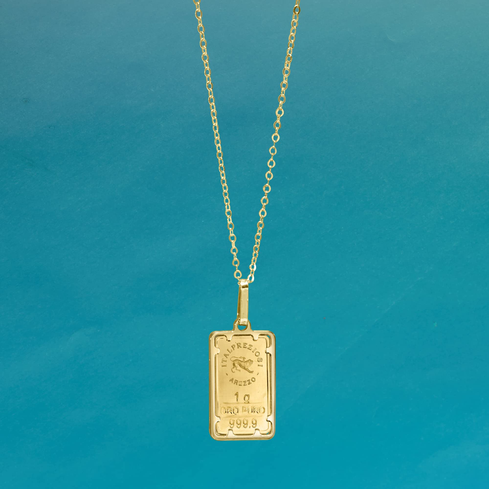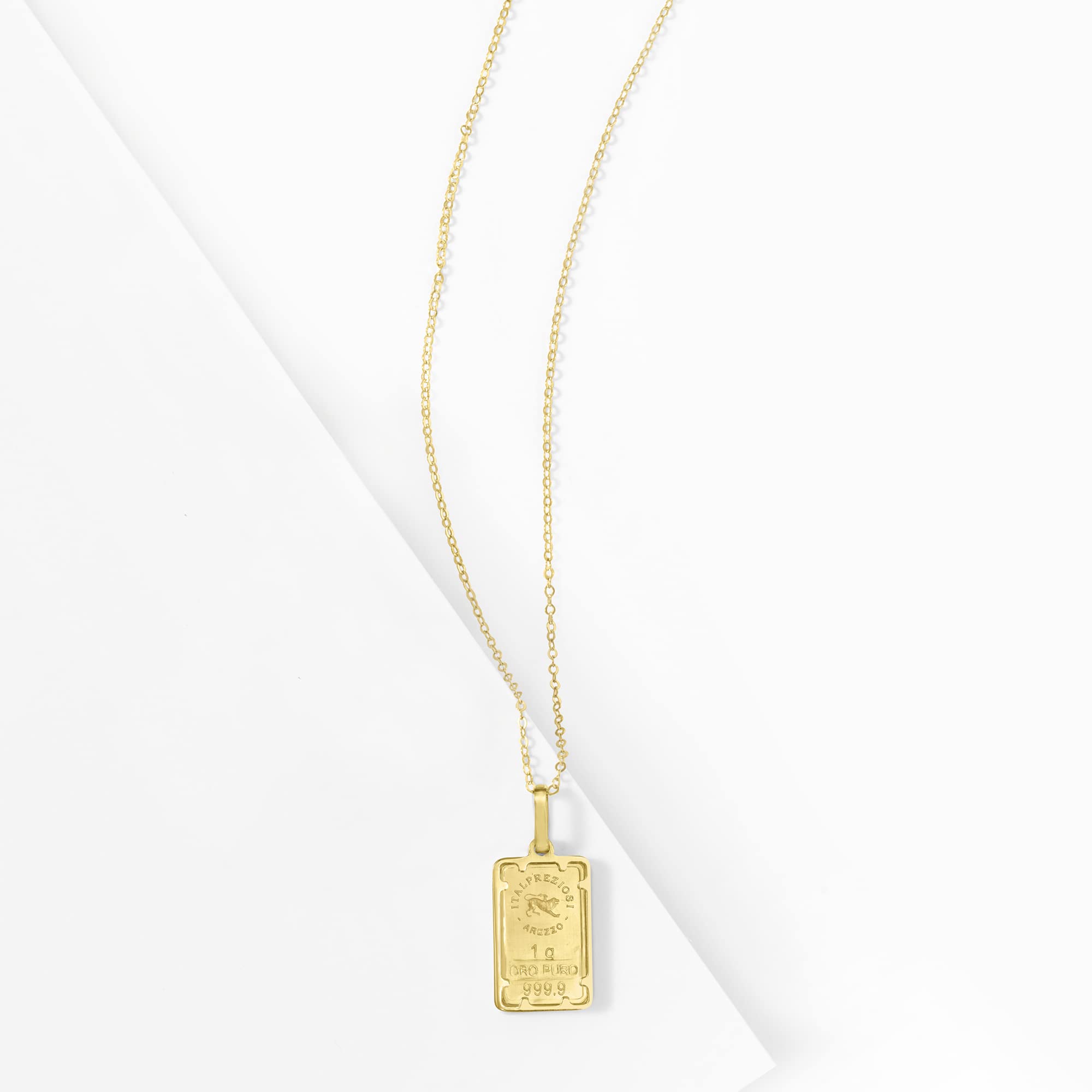 Details: Ross-Simons is the authority on fashionable must-haves. This Italian beauty makes a subtle yet sophisticated statement. Here, one gram ingot of 24kt yellow gold is set inside a 14kt yellow gold frame. Suspends from a cable chain. Springring clasp, 24kt yellow gold and 14kt yellow gold ingot necklace. Necklace drop length - 7/8 inch long. Necklace drop width - 3/8 inch wide.
