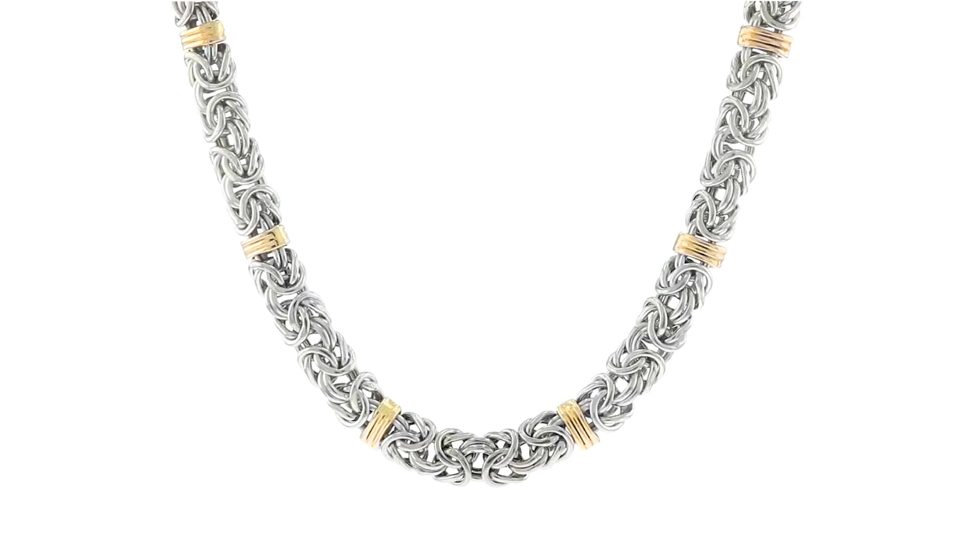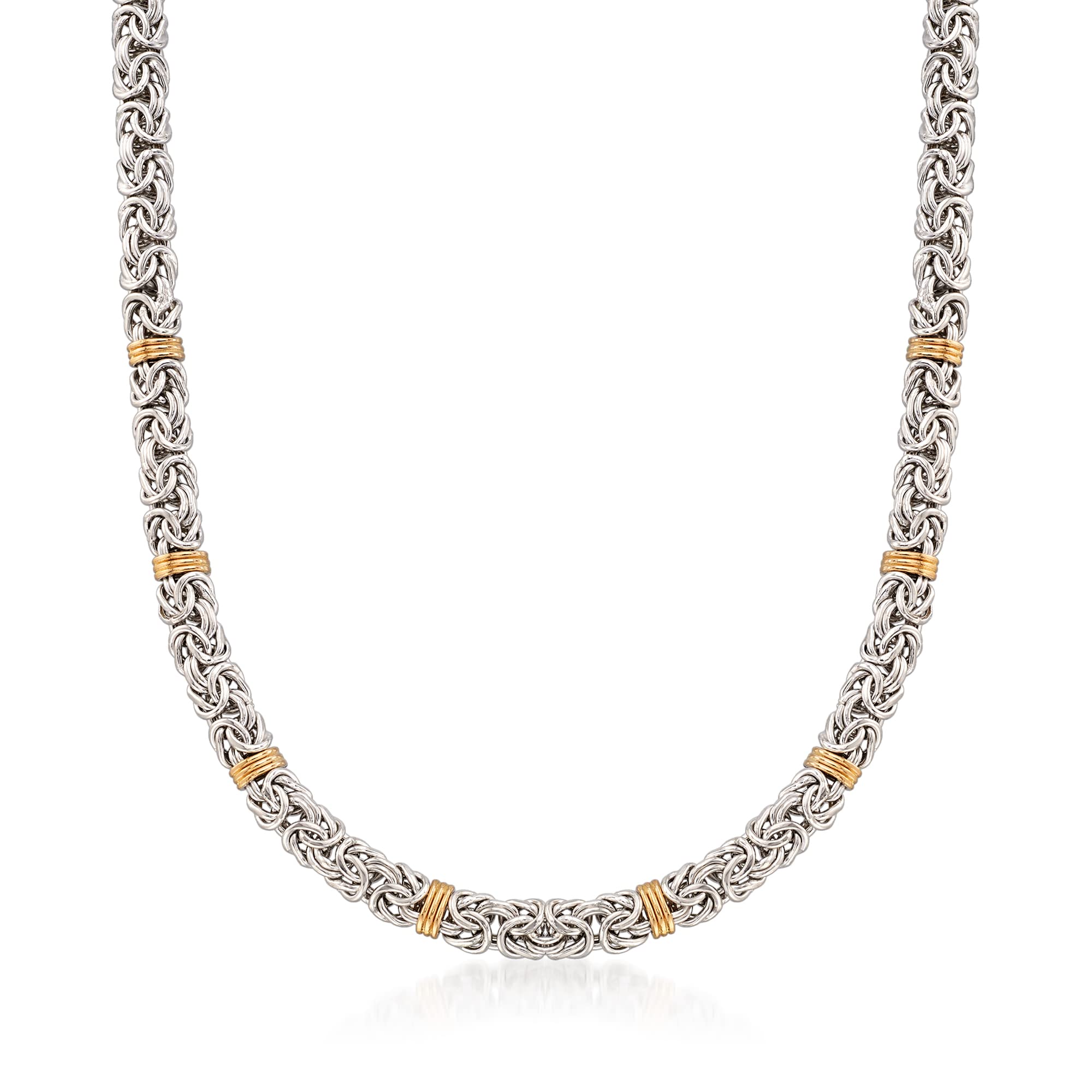Details: A top-rated jeweler since 1952, Ross-Simons travels the world to find high-quality styles at the best prices. Handcrafted links of sterling silver host stationed 14kt yellow gold bars in this two-tone Byzantine classic. A necklace to be worn wherever, whenever. Polished finish. Lobster clasp, sterling silver Byzantine necklace.