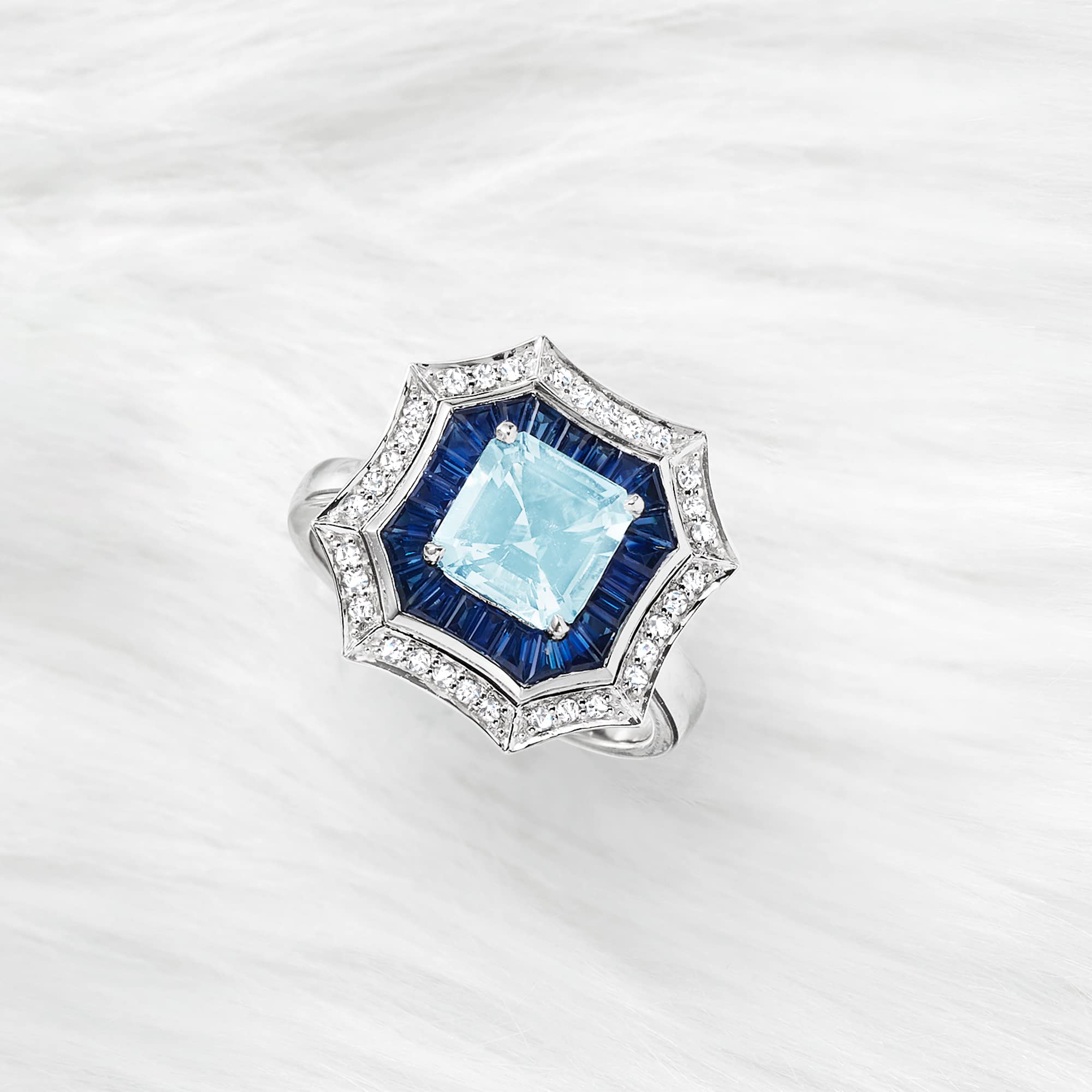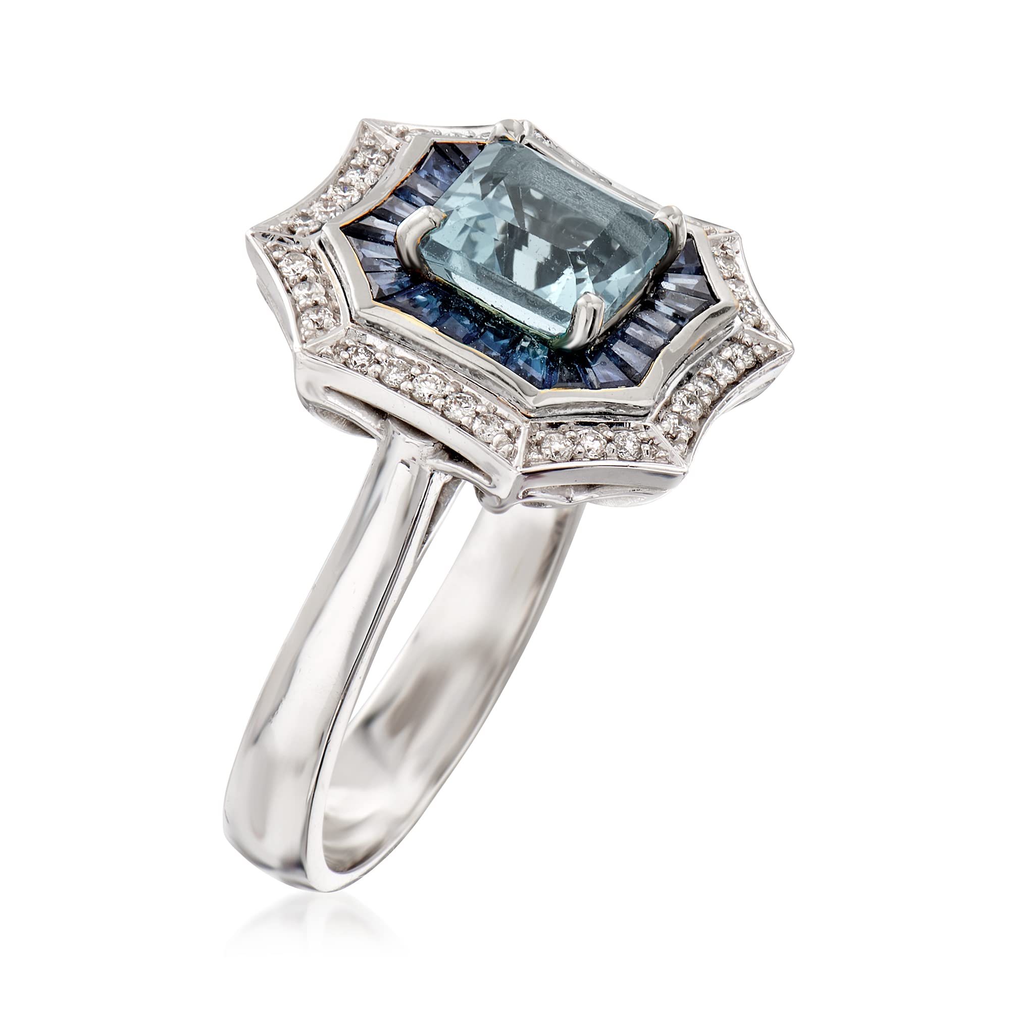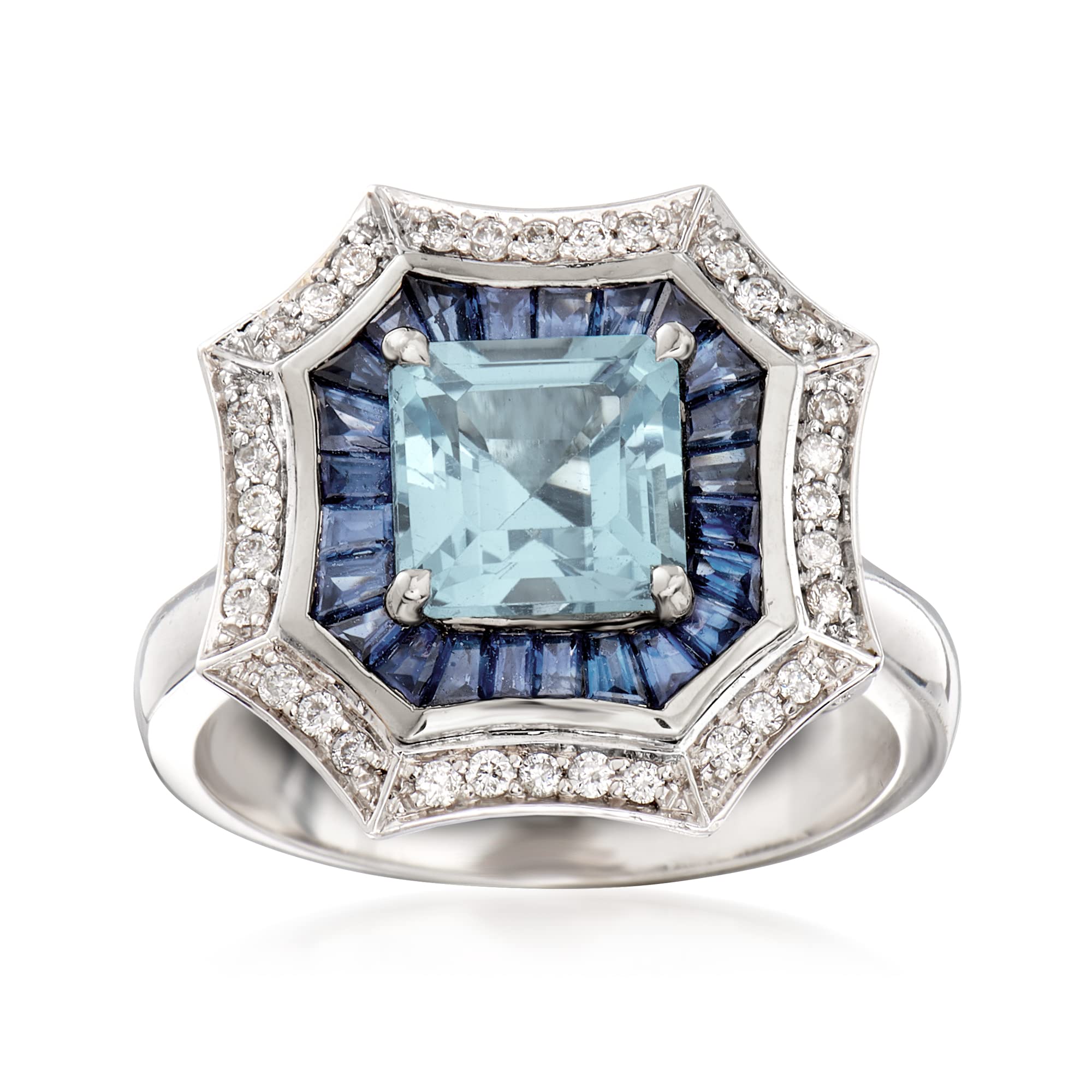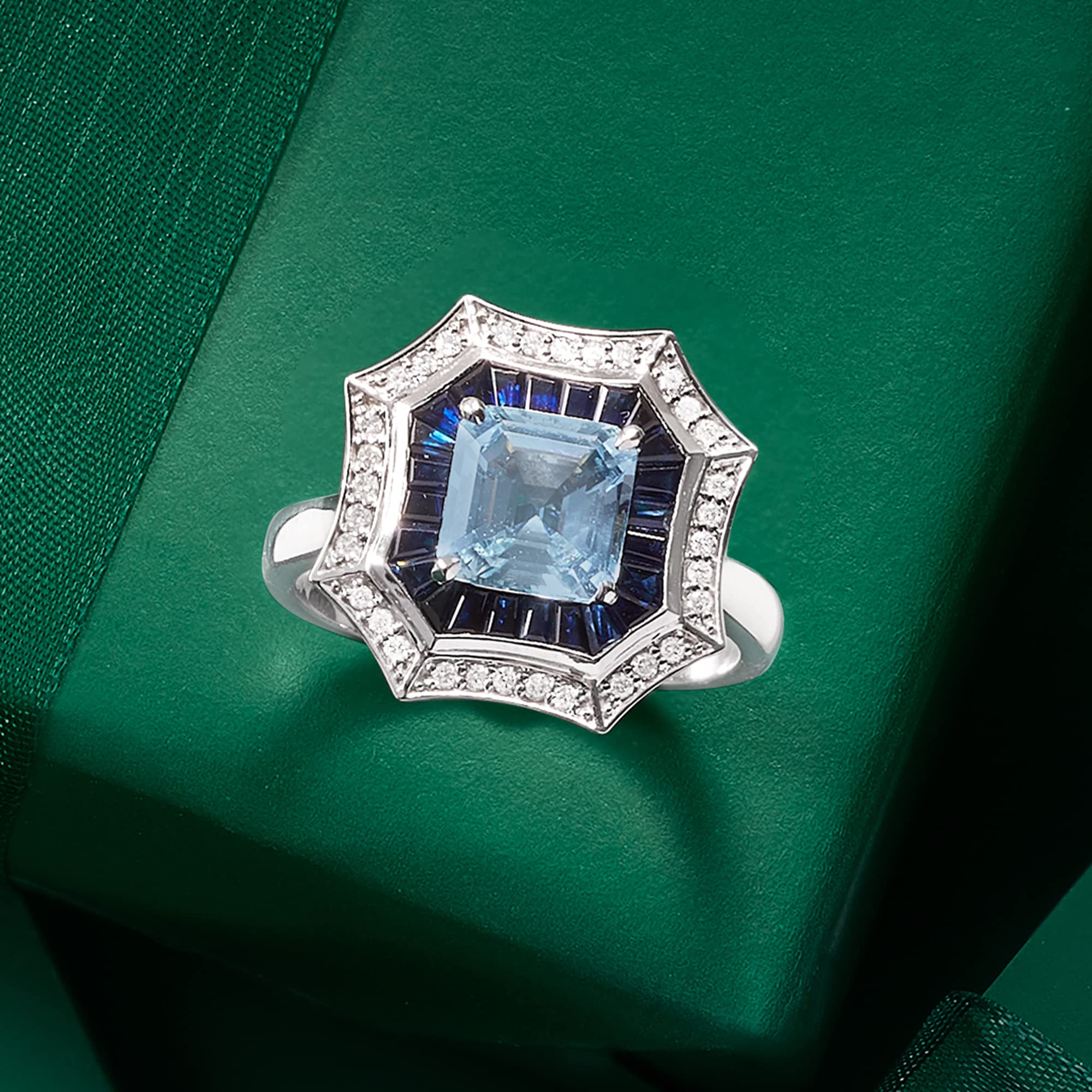 Details: A top-rated jeweler since 1952, Ross-Simons travels the world to find high-quality styles at the best prices. Make a splash with gorgeous hues of brilliant blues. Sitting front and center is a stunning 1.10 carat aquamarine complimented by 2.90 ct. t.w. baguette sapphires. Glistening light and dark blues are framed by icy .17 ct. t.w. round brilliant-cut diamonds for a stunning design. Set in polished 14kt white gold. 5/8" wide. Diamond, sapphire and aquamarine ring. Each Ross-Simons item arrives in a fine jewelry presentation box. Shop Ross-Simons jewelry risk-free as all items include a 30-day, 100% money-back guarantee.