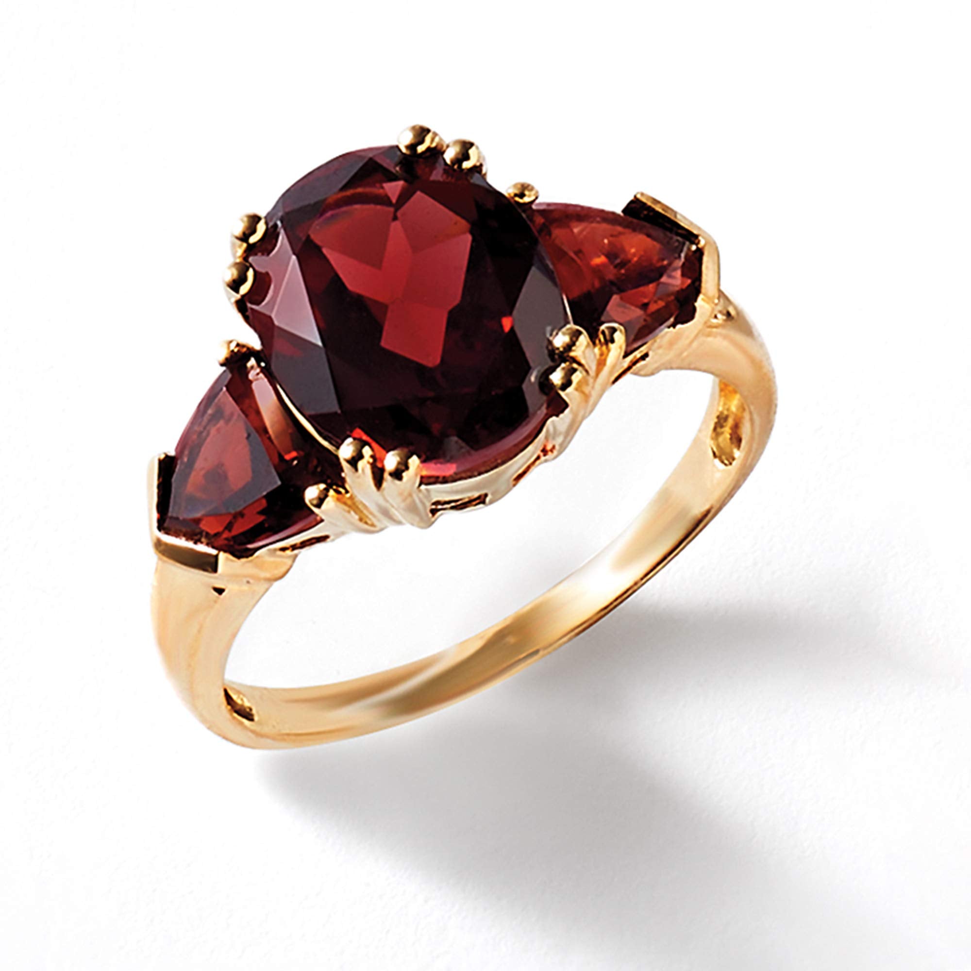 Details: At Ross-Simons, we recognize the style power of versatile classics. You'll be captivated by the deep and intense red hue of this ring. Rich, lush color envelops this three-stone 14kt yellow gold ring. A 4.00 carat oval garnet is flanked by two trillion-cut garnets together totaling 1.20 carats. 3/8" wide. Three-stone garnet ring.