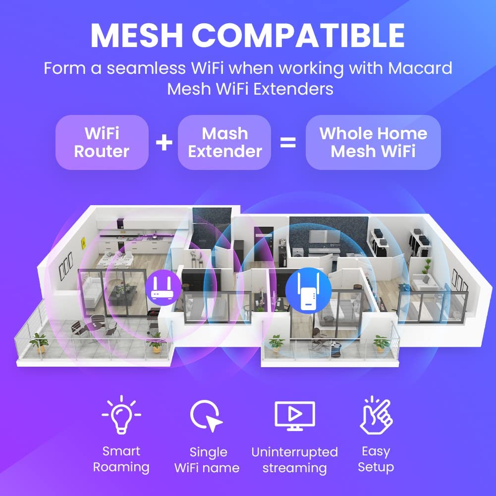 • The USA Engineered - While most WiFi extenders signal booster for home get stuck behind thick walls, appliances, and cement floors, MACARD delivers ultra-stable bandwidth for online gaming, video conferences, and even laggy free streaming even 4K video.