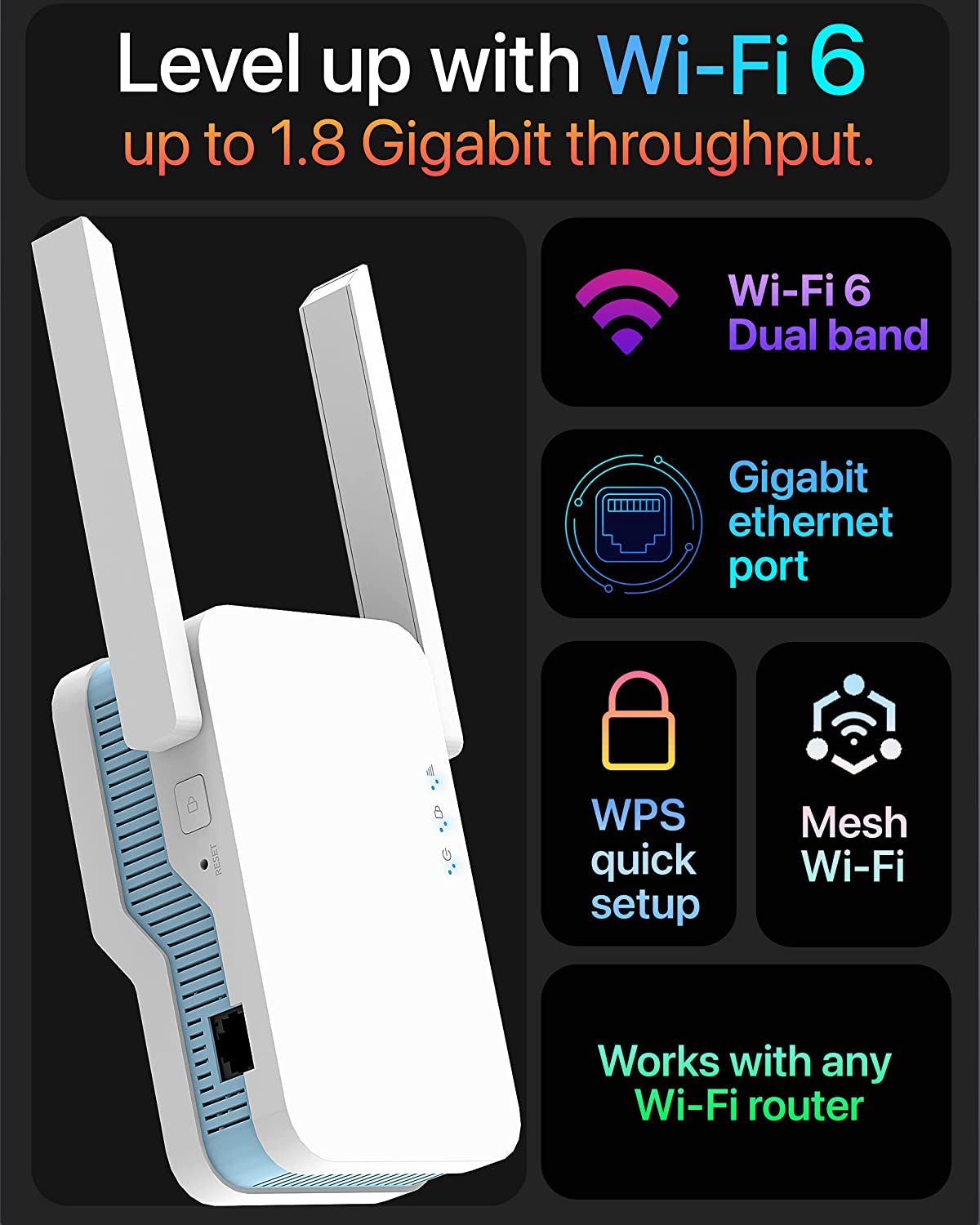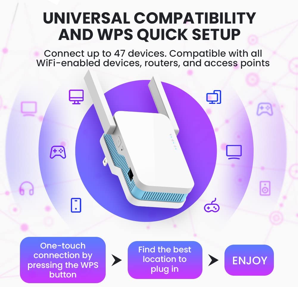 • Made for humans. Set up as 123. You must not be Tech-savvy. Can you press a button? You’re set! Just tap the WPS button to pair wifi repeater with your wifi router or modem. Unbox. Plug in. Hold by the router. Tap. Enjoy!