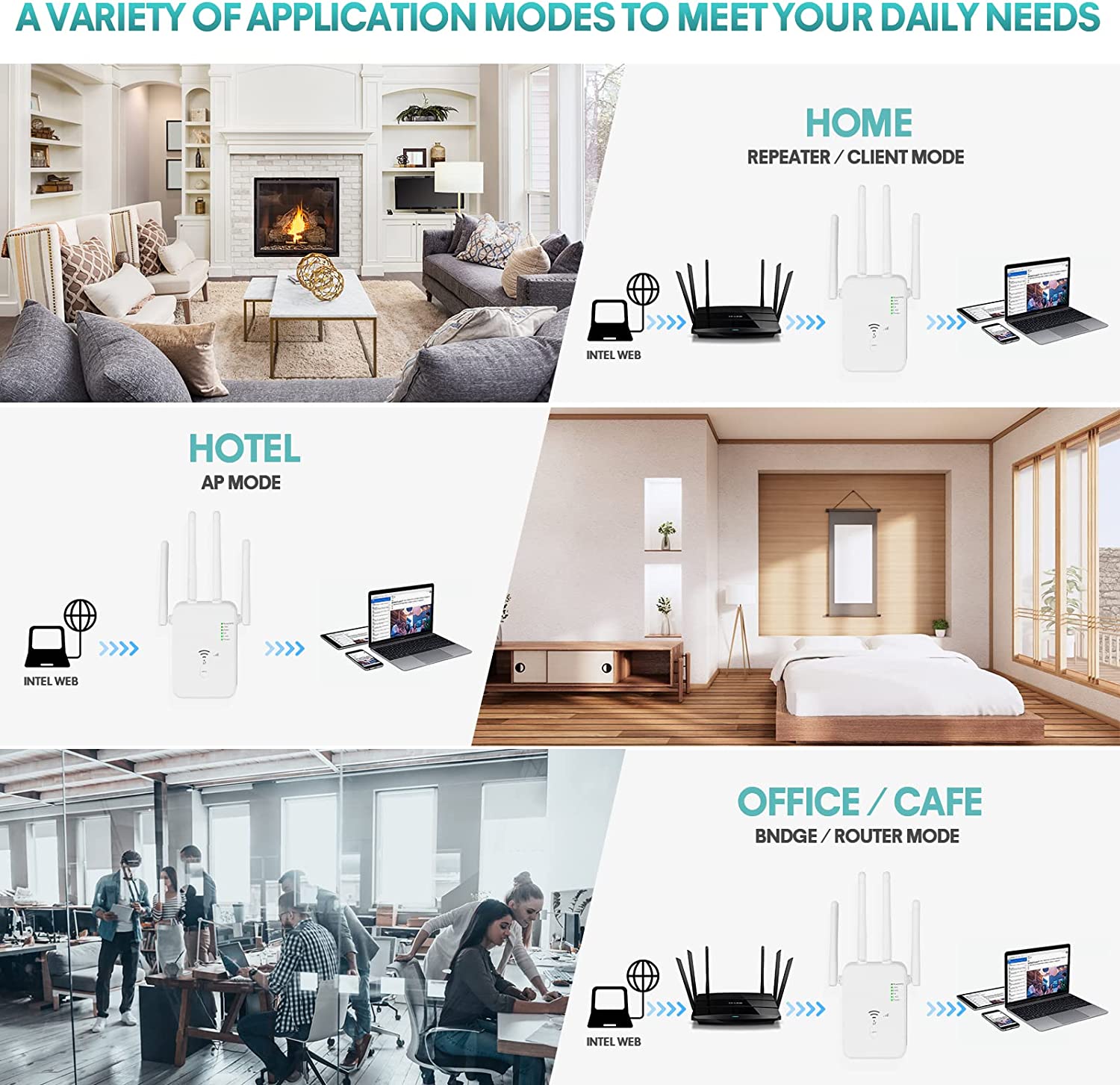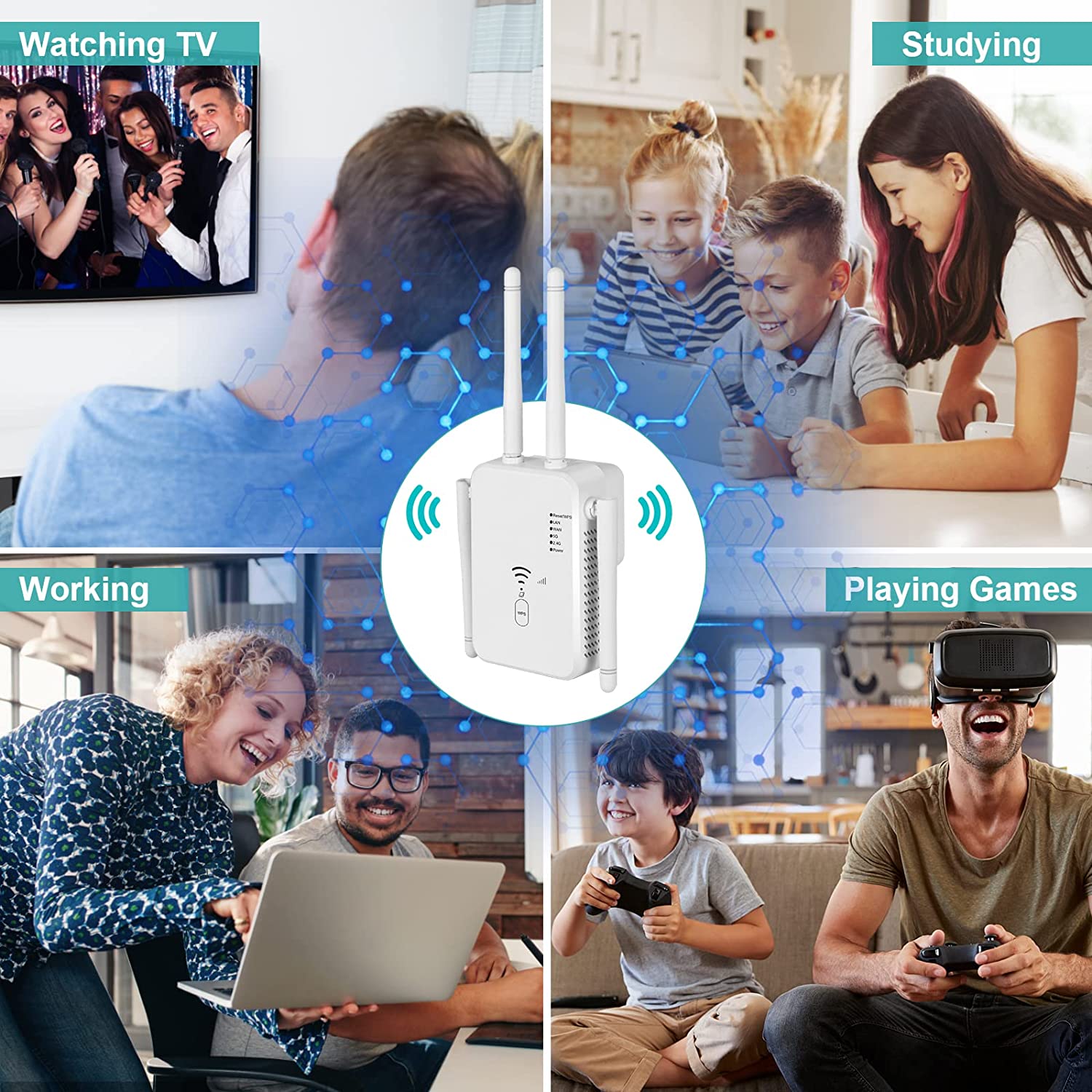 • Wide Compatibility : Wifi extender booster, supports up to 80 devices. Including streaming, compatible with mobile phones, tablets, laptop, smart TV, online gaming, video conferencing, schooling, Alexa devices compatible. Wireless repeater wifi extender, easily extend the range of your home WiFi network and keep all your mobile devices connected without having to purchase more equipment. Everyone can enjoy HD video, transfer large digital files and move data along at blazing fast speeds.