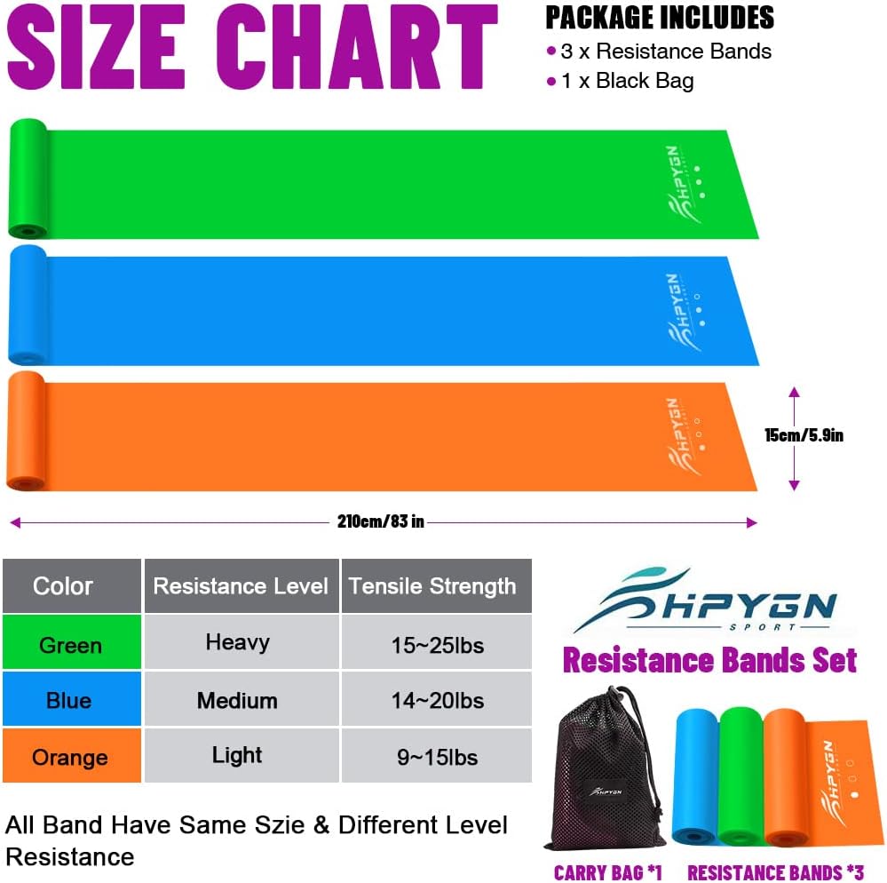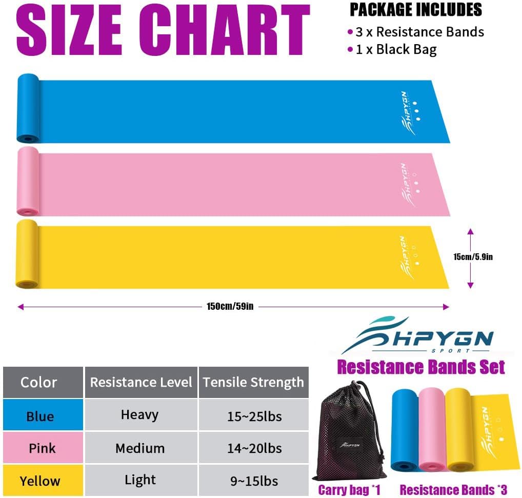 • ❥【Different Level of Resistance】- The resistance bands for working out is divided into 3 different levels of resistance:Yellow band(Light, 0.35mm), Pink band(Medium, 0.45mm), Blue band(Heavy, 0.55mm).Never worry about the Physical Therapy Bands too hard, easily switch between the 3 levels to your preference anytime.