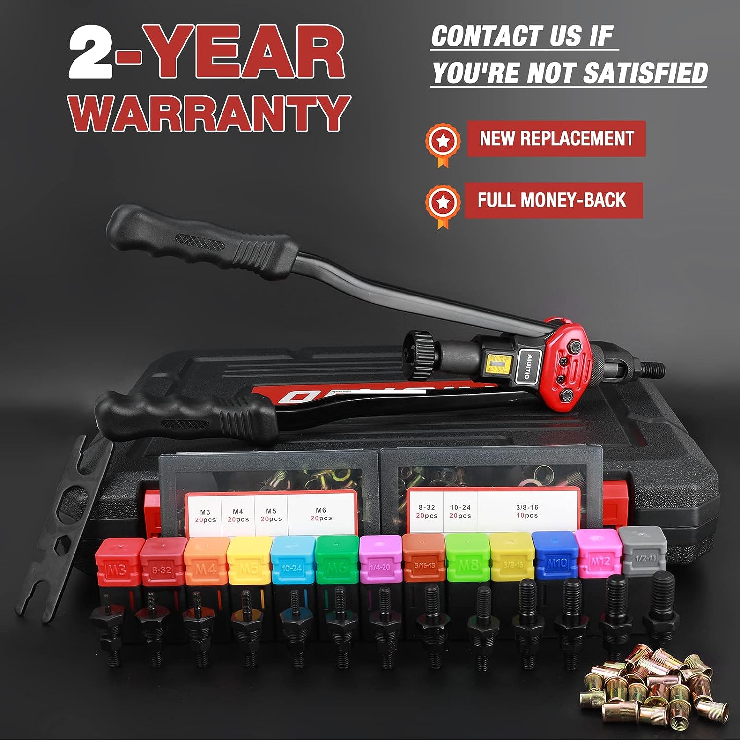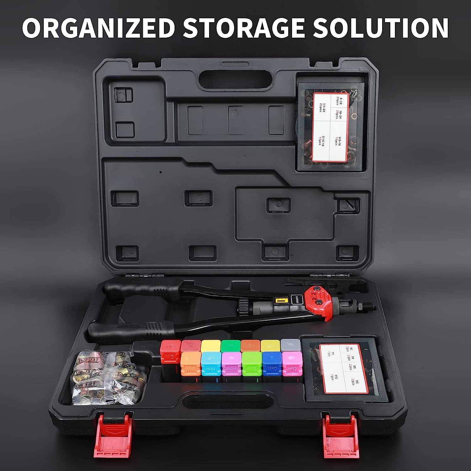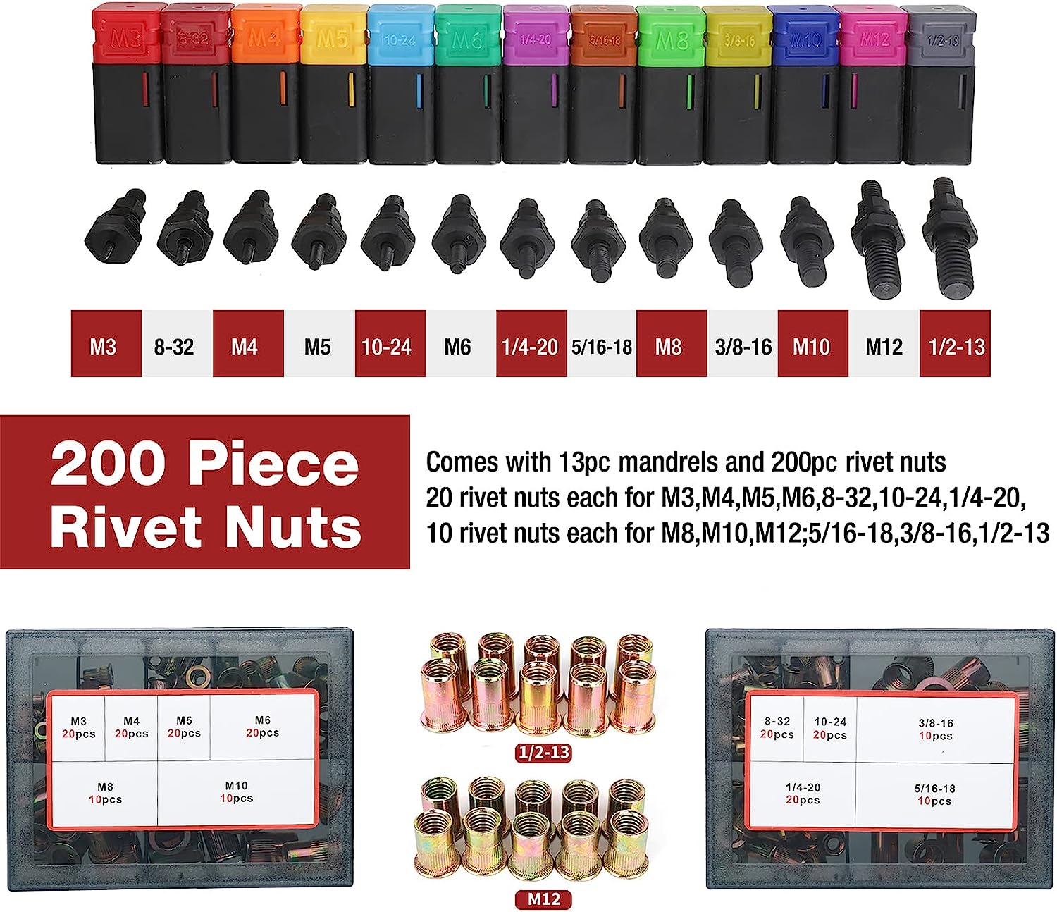 • COMPLETE ACCESSORIES & SOLID CARRYING CASE - Equipped with 13pc interchangeable mandrels(Metric M3 M4 M5 M6 M8 M10 M12; SAE 8-32,10-24,1/4-20,5/16-18,3/8-16,1/2-13) and 200pc rivet nuts (20 rivet nuts each for M3,M4,M5,M6;8-32,10-24, 1/4-20, 10 rivet nuts each for M8,M10,M12; 5/16- 18, 3/8-16,1/2-13.)Please note that the M8 mandrel was installed in the gun,so the small box of M8 is empty.All pieces are packed in a rugged, compact carrying case for storage and portability.