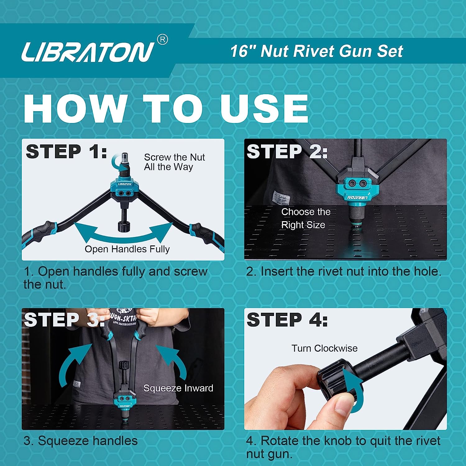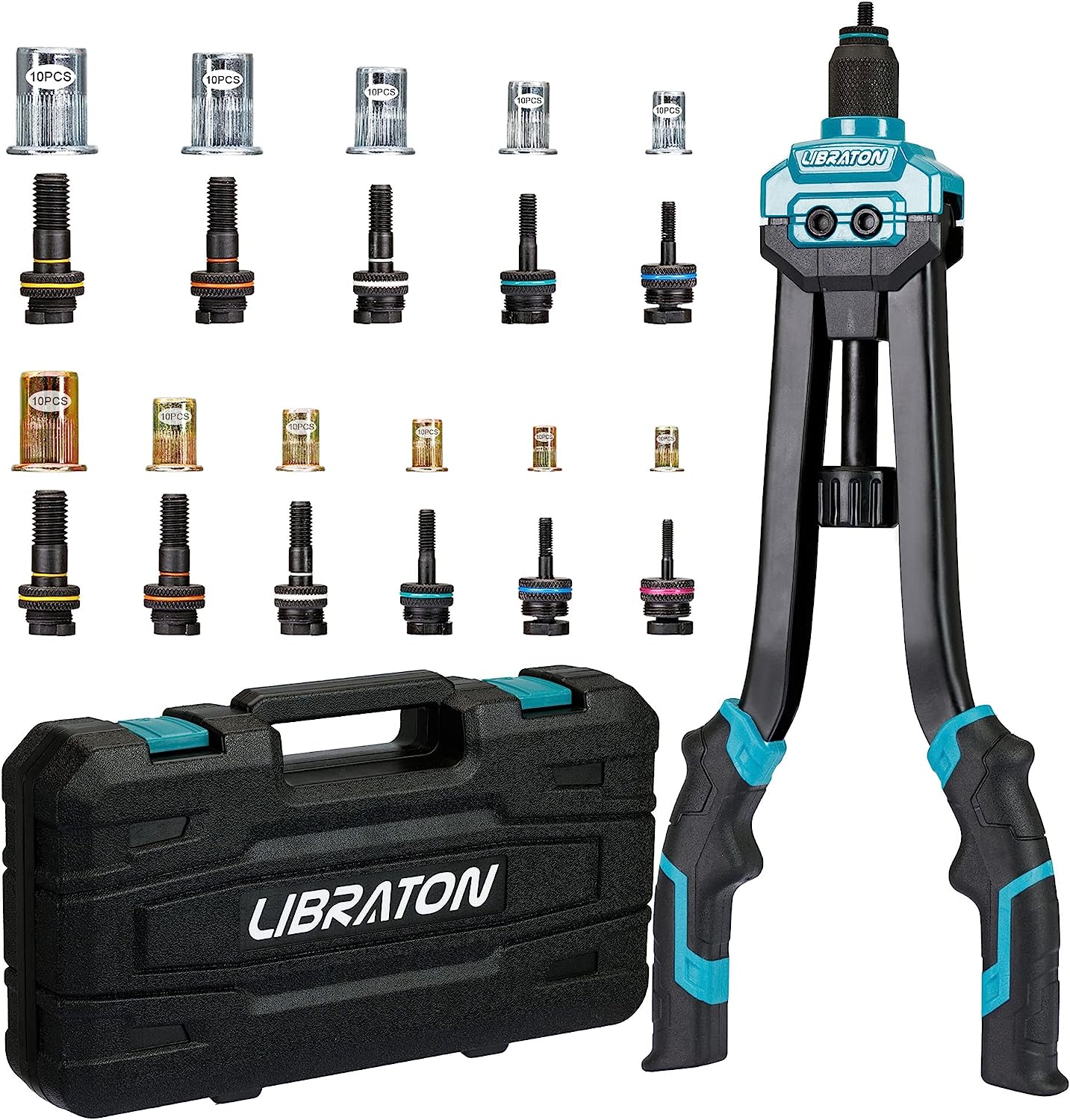 LIBRATON 16" Rivet Nut Tool, Rivet Nut Gun, Hand Rivet Nut Setter with 110PCS Rivet Nuts, 11PCS Metric & SAE Interchangeable Mandrels and Carrying Case, Easy Replace
