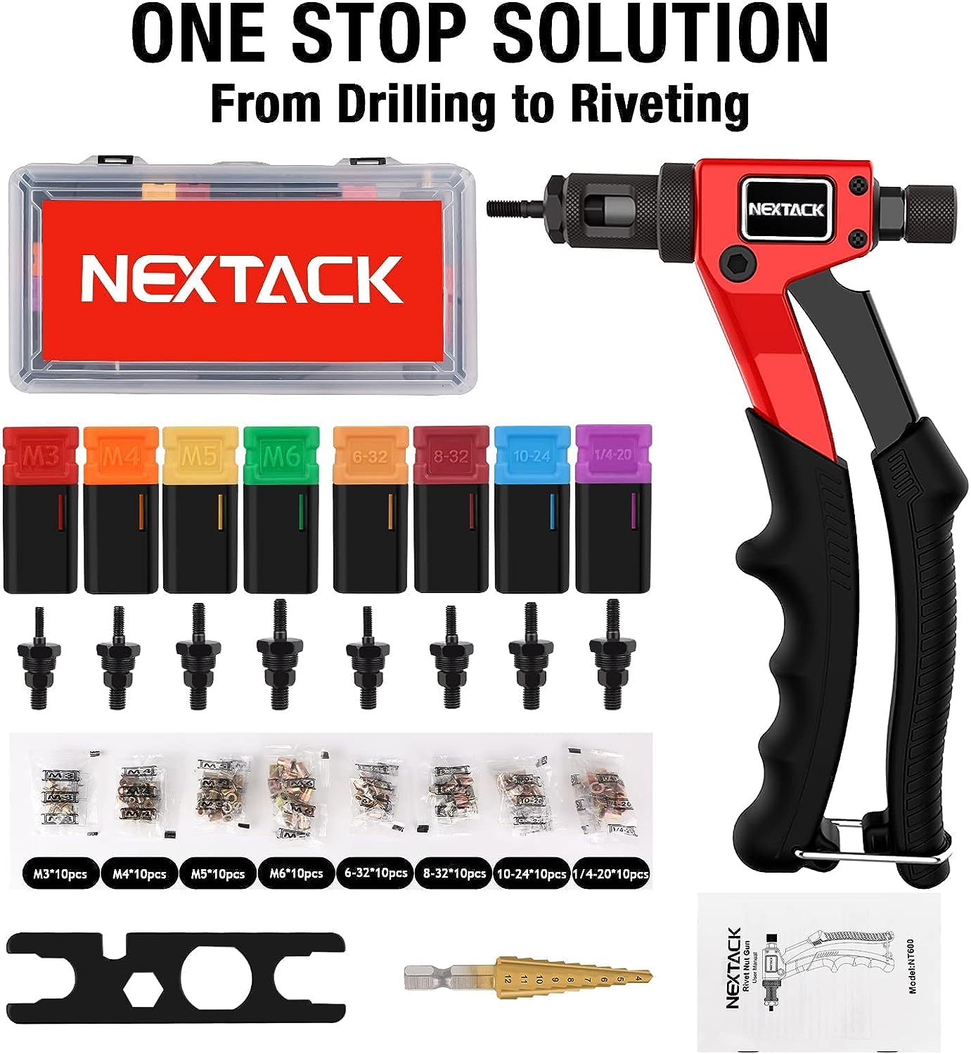 NEXTACK Rivet Nut Tool Rivet Nut Kit with a Step Drill Bit & 80 Nutserts for One-Handed in Tight Space, 8" Rivnut Tool with 8 Mandrels Incl. 6-32 & 8-32 in Organized Carrying Case NT600