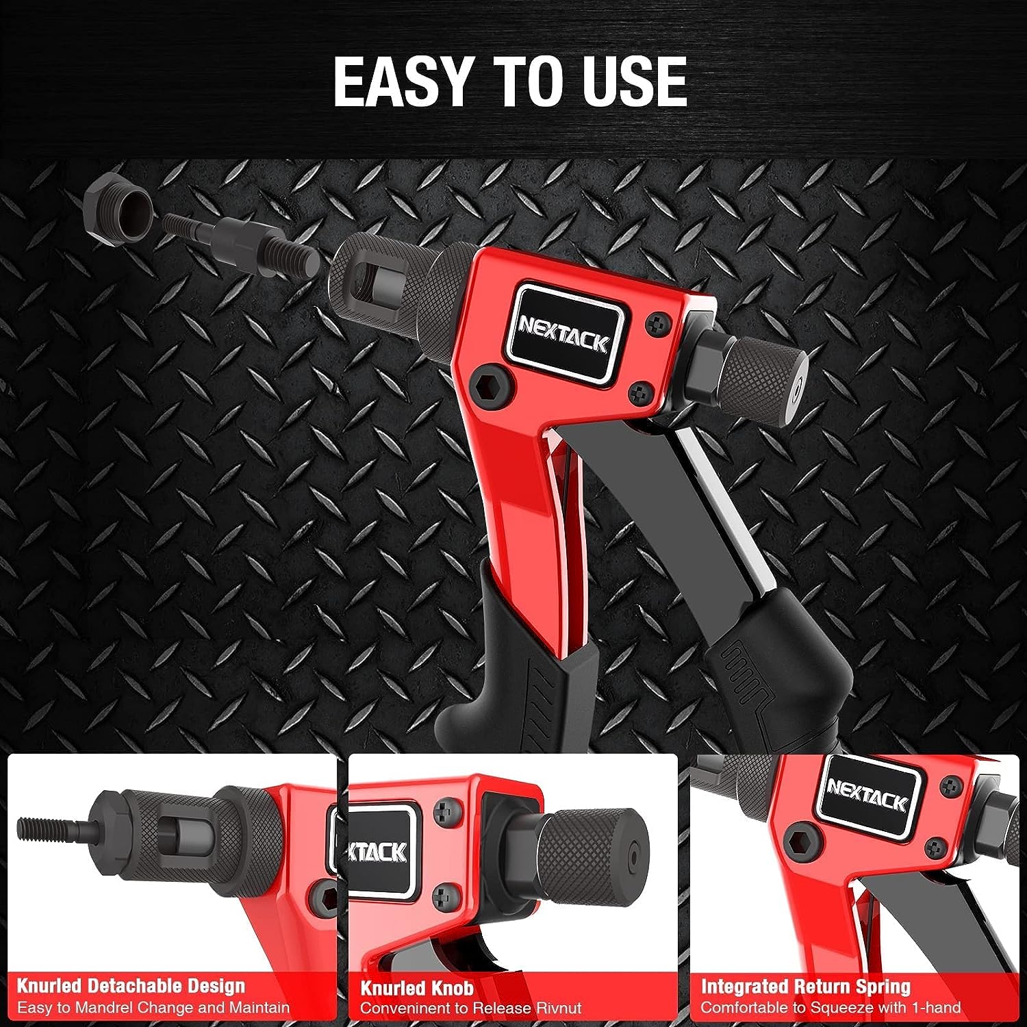 • EASY TO USE: The nutsert rivet gun features modular detachable design for easy riveting, mandrels changing and maintenance, rotary knob structure for easy nut loading and releasing.