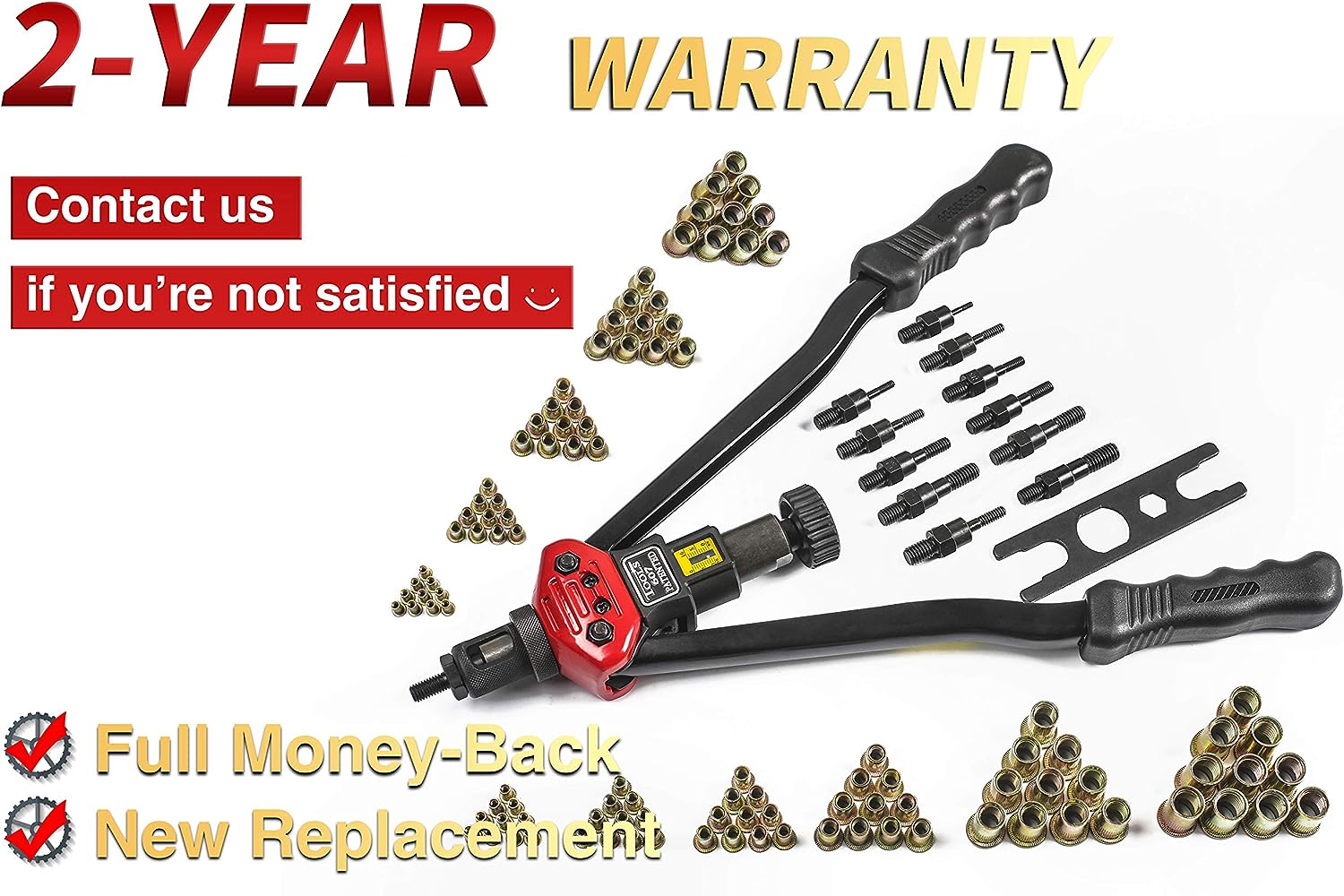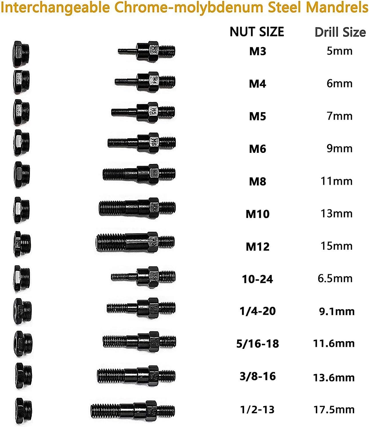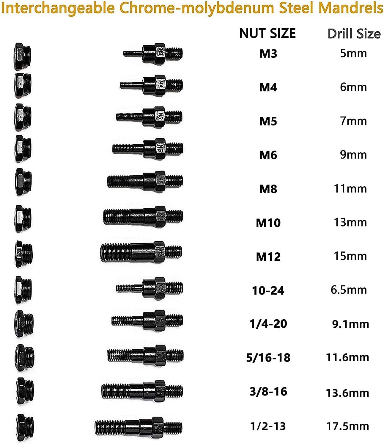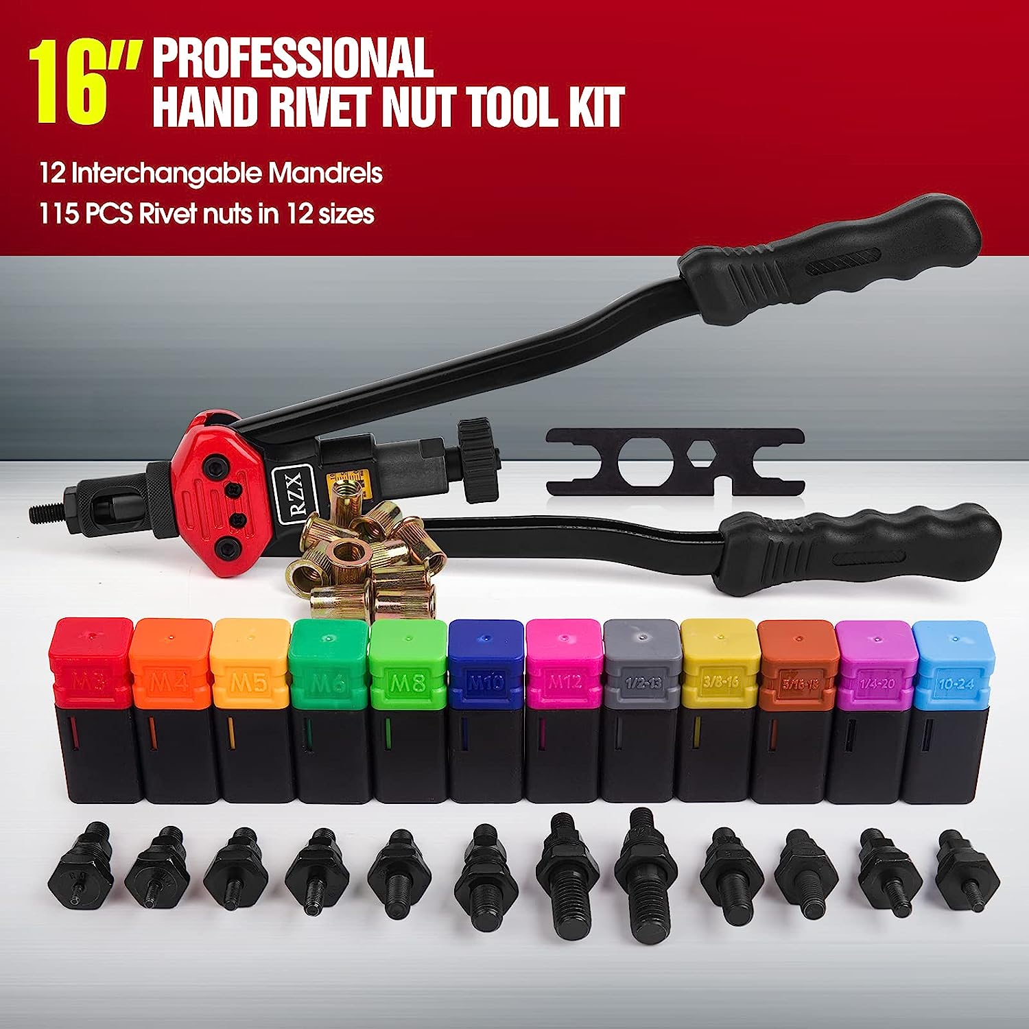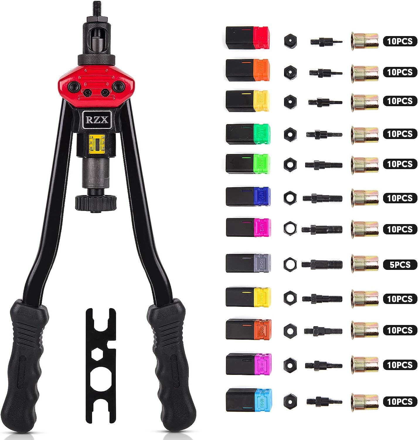 RZX is professional of rivet nut tool filed.We have more than 10 years experiences in rivet Nut tool.We are the the first company sell on Amazon since2014. We more know Rivet nut tool. We only supply”simple,classic,save effort,sturdy,” tool,also our price is competitve.No doubt,we are you best choice. Total Length :410mm Max.working stroke:9mm Designed with round knurled sleeve and adjustable nut system . Suitable for rivet sizes :M3 M4 M5,m6,m8,m10 M12, 10-24, 1/4-20 , 5/16-18,3/8-10.1/2-13 packed by box M8 Mandrel already on the tool so the plastic box is empty.