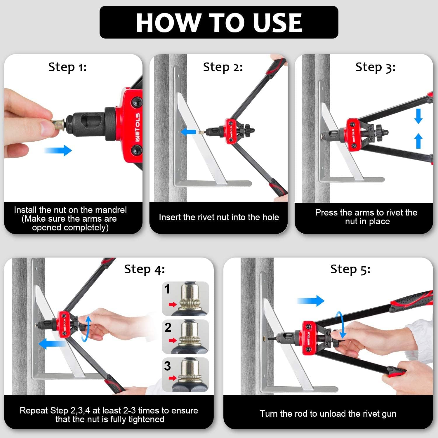 • Sturdy and Durable - The mandrels of our hand rivet nut tool is made from Chrome steel with heat treated 40℃ and the arm is made from 45 carbon steel, which protect against corrosion and resist to deformation.