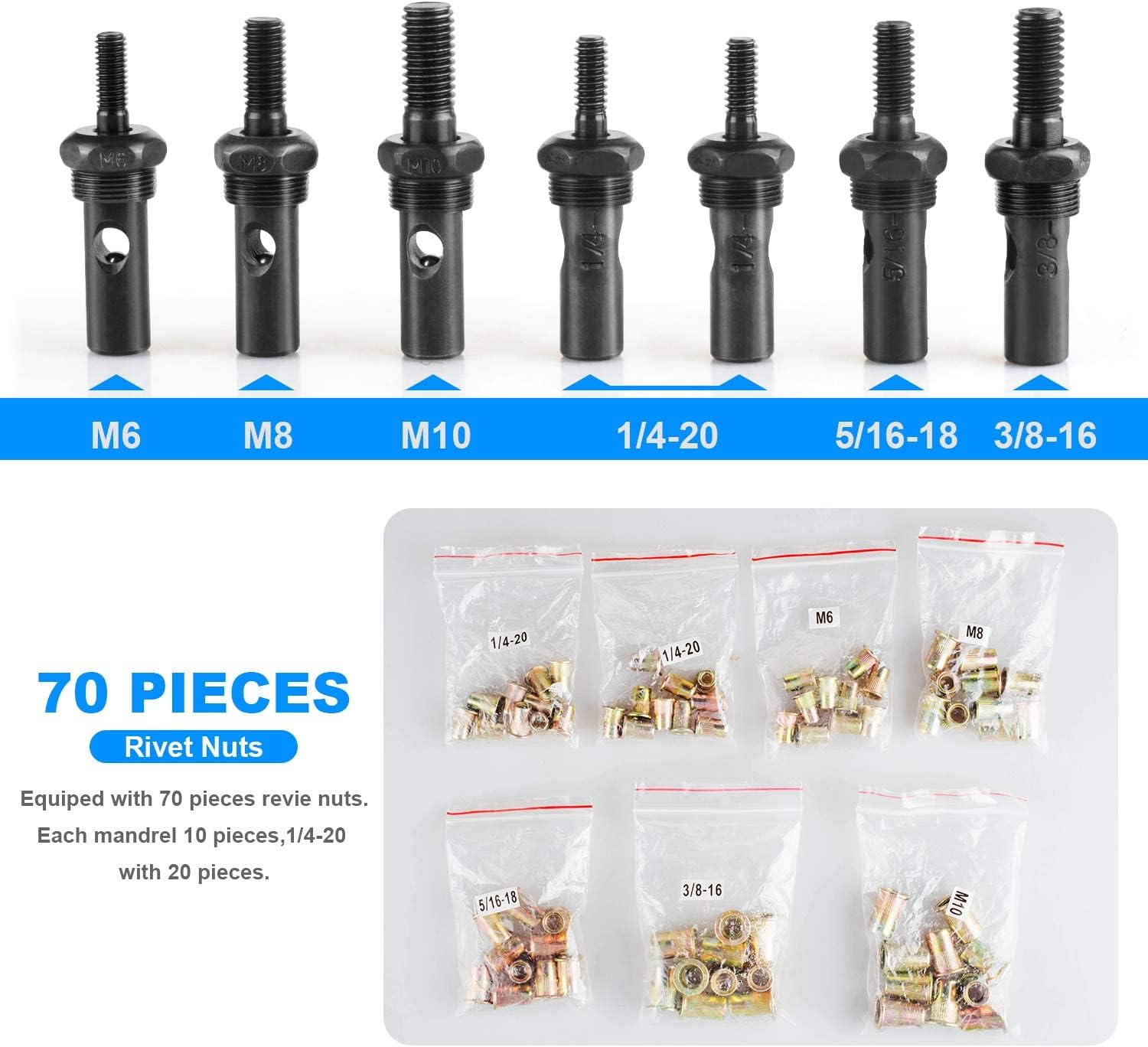 WETOLS Rivet Nut Tool, Hand Rivet Nut Tool with 7 Metric & Inch Mandrels M6 M8 M10, 1/4-20, 5/16-18, 3/8-16, 70pcs Rivnuts and Blow Carry Case - WE-882