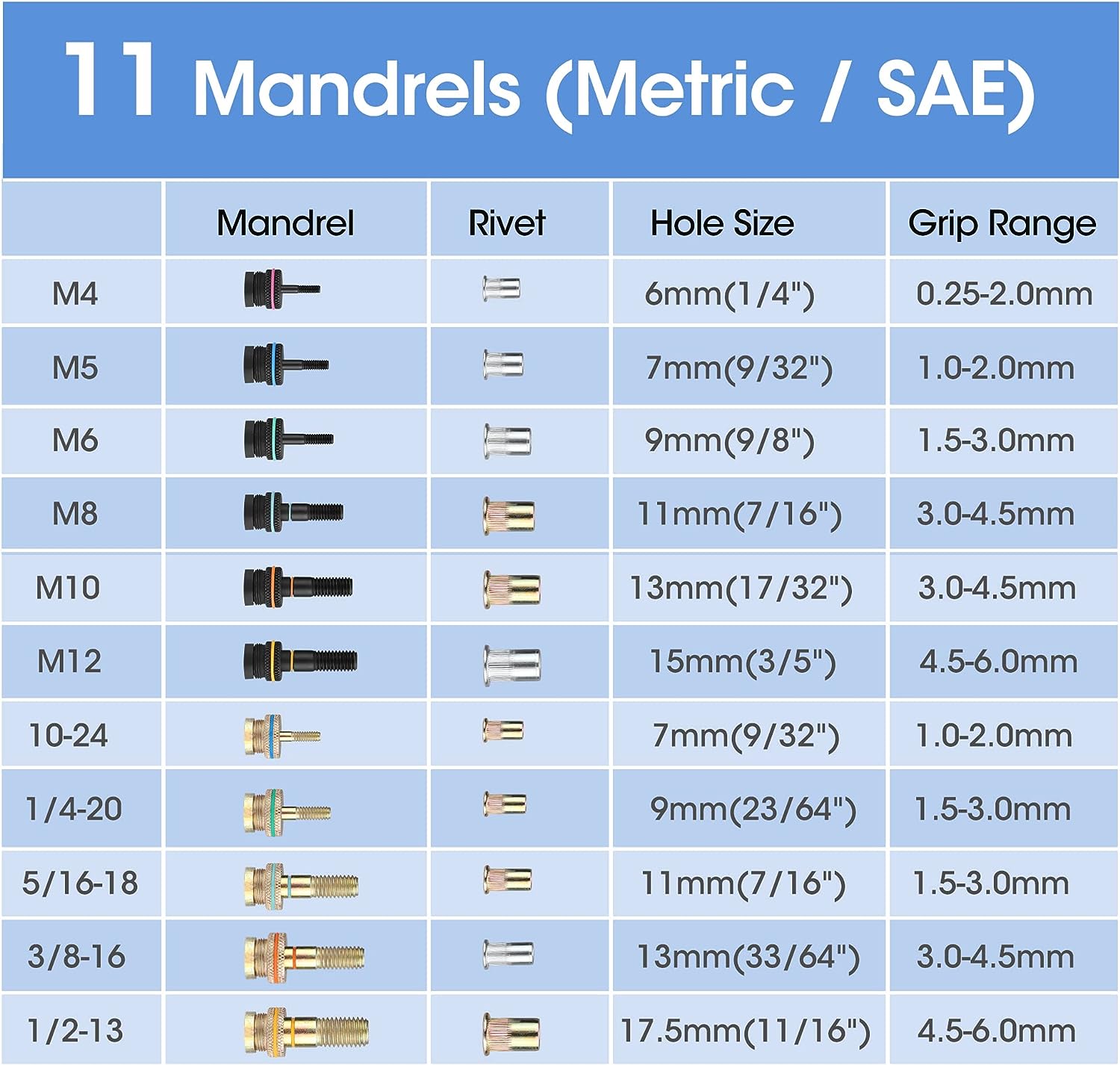 • Build to Last: The mandrels of the nutsert rivet tool set are forged from 45# steel, ensuring they won't bend or break off during use. The arm is made from Q235 steel, which protects against corrosion and ensures long-lasting performance.