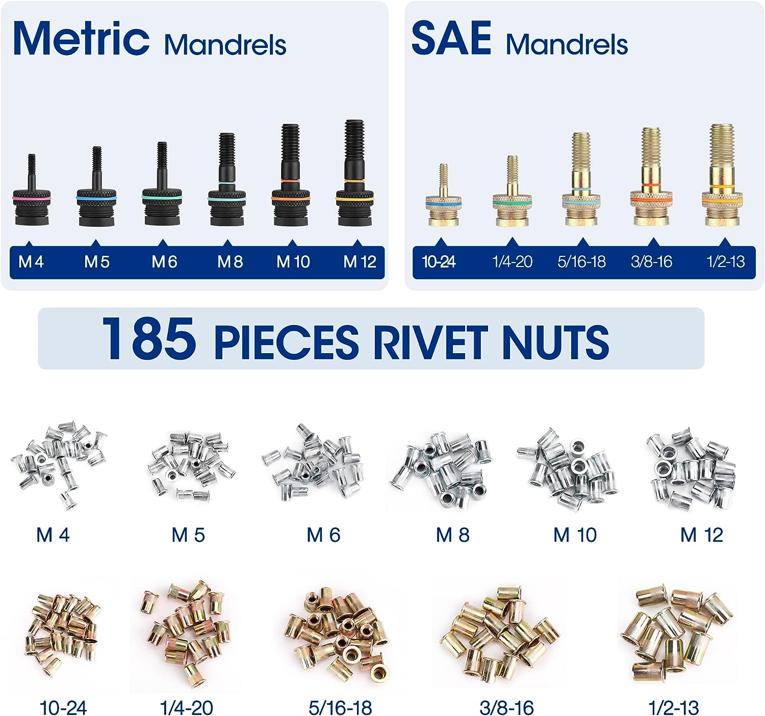 WORKPRO 16" Rivet Nut Tool, 11 Metric/SAE Quick-Change Mandrels & 185pcs Rivnuts Assortment Kit, Threaded Rivnut Tool Kit, Manual Riveter with Carrying Case