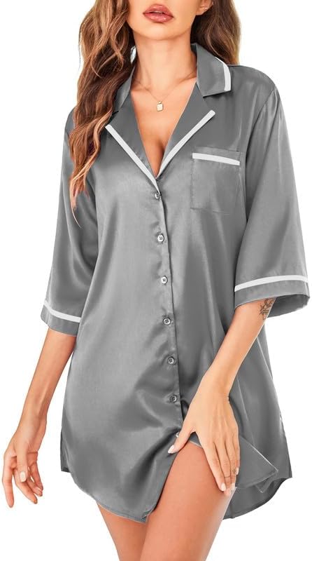 Ekouaer Women's Nightgown Satin Sleep Shirt Button Down Nightshirt 3/4 Sleeve Pajama Dress Notch Neck Boyfriend Sleepwear