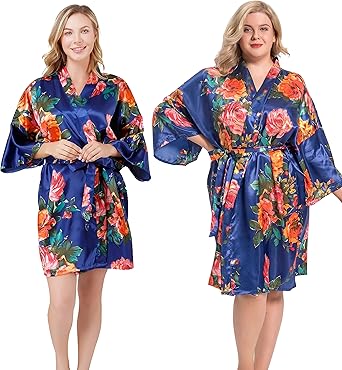 Women's Rose Flowers Silky Satin Short Kimono Robe for Wedding Getting Ready